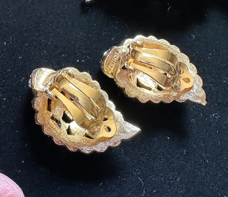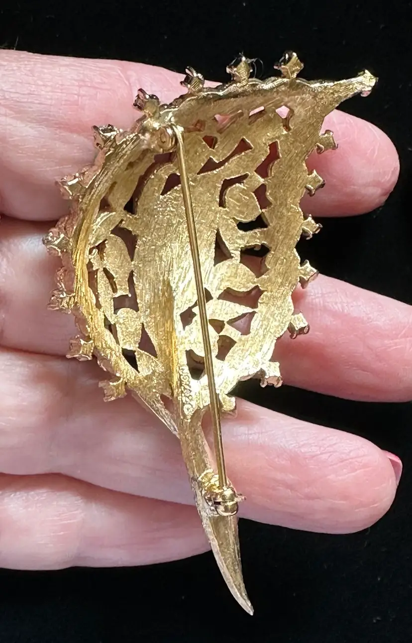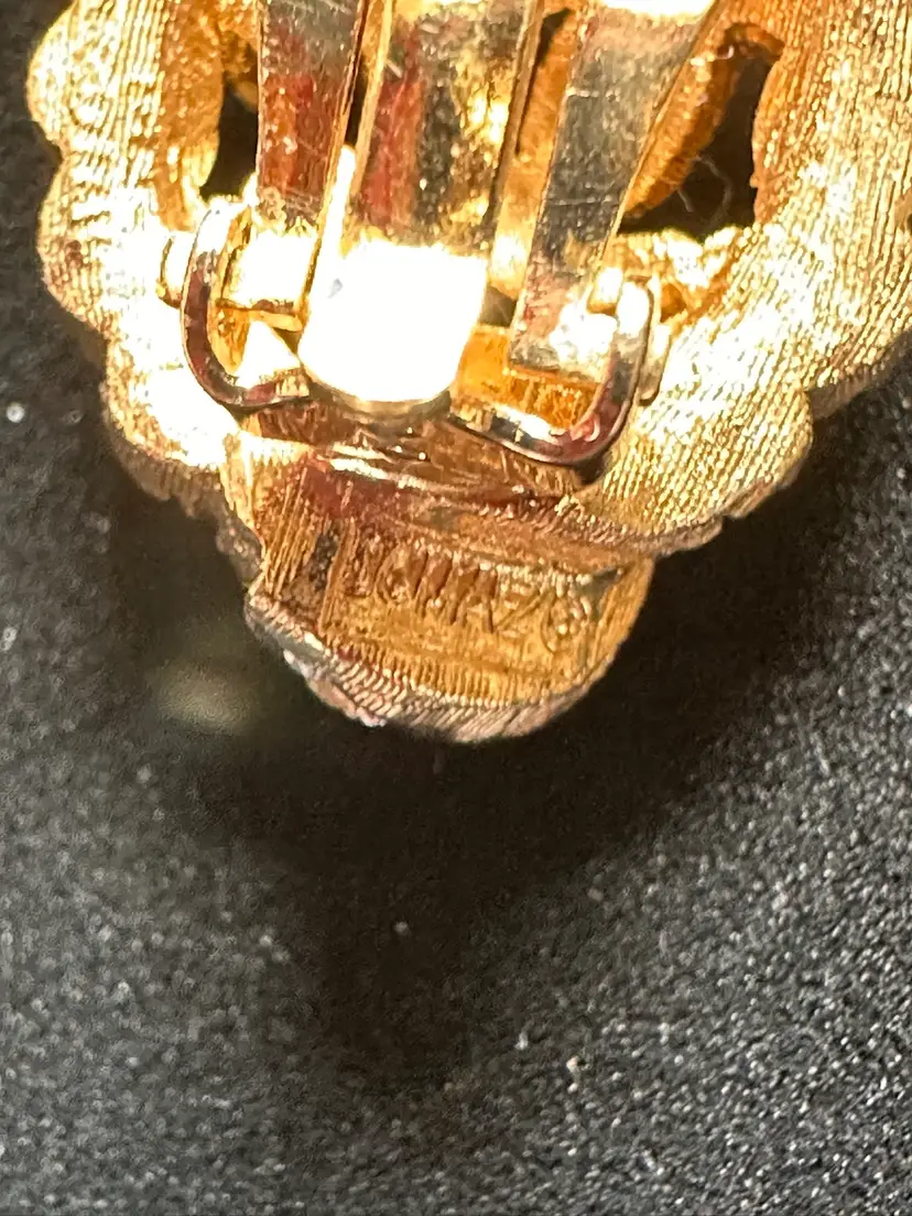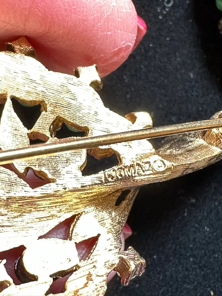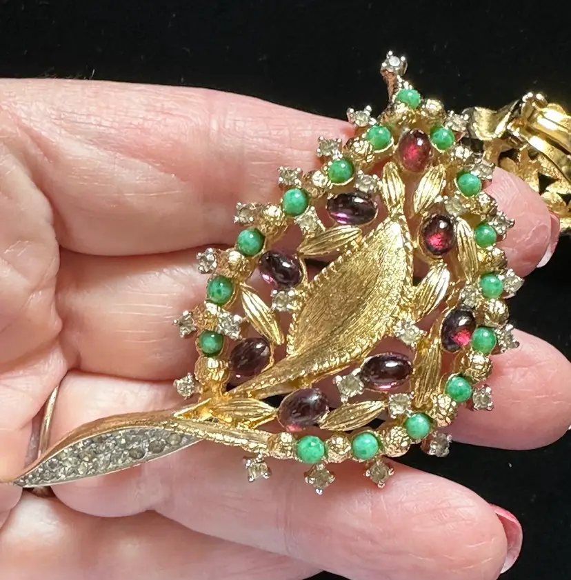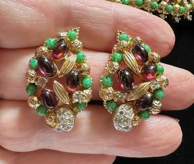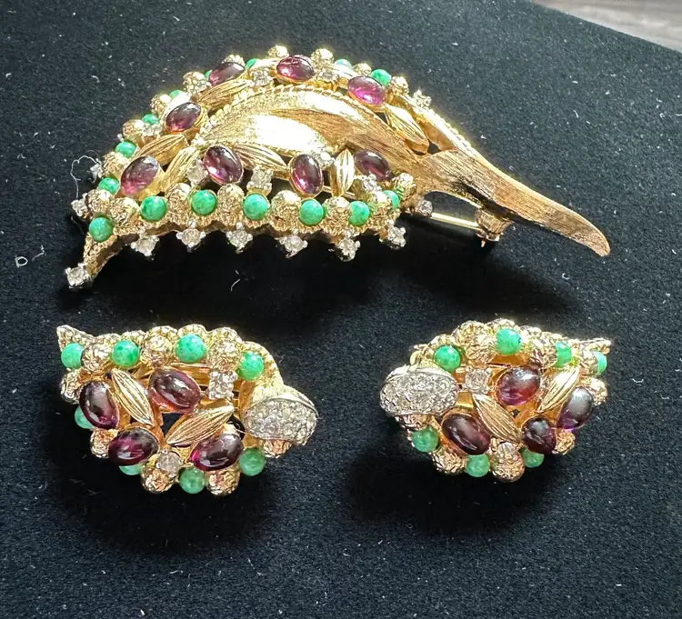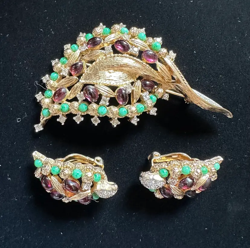 Beautiful vintage Jomaz set includes pin & clip on earrings. Gold tone set with purple cabochons, green beads and rhinestones. The pin is 3” x 2.25”. The earrings are 1.25”. Very good condition.
