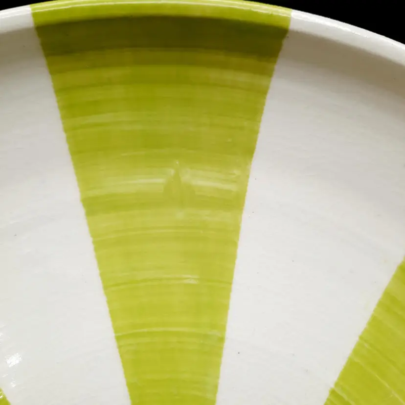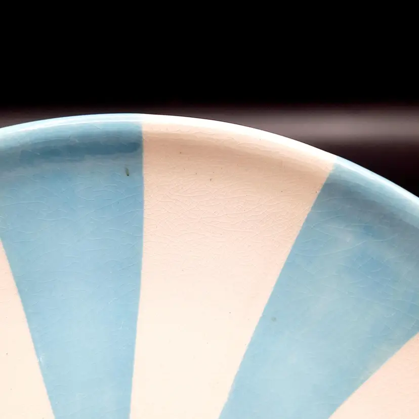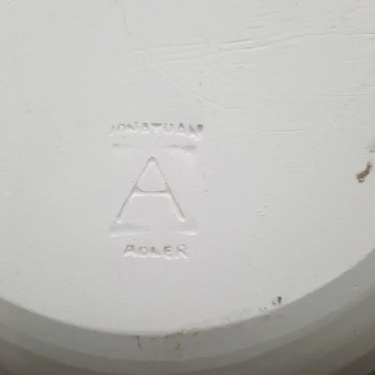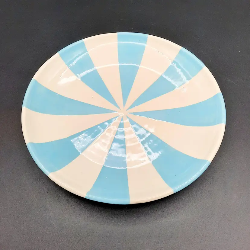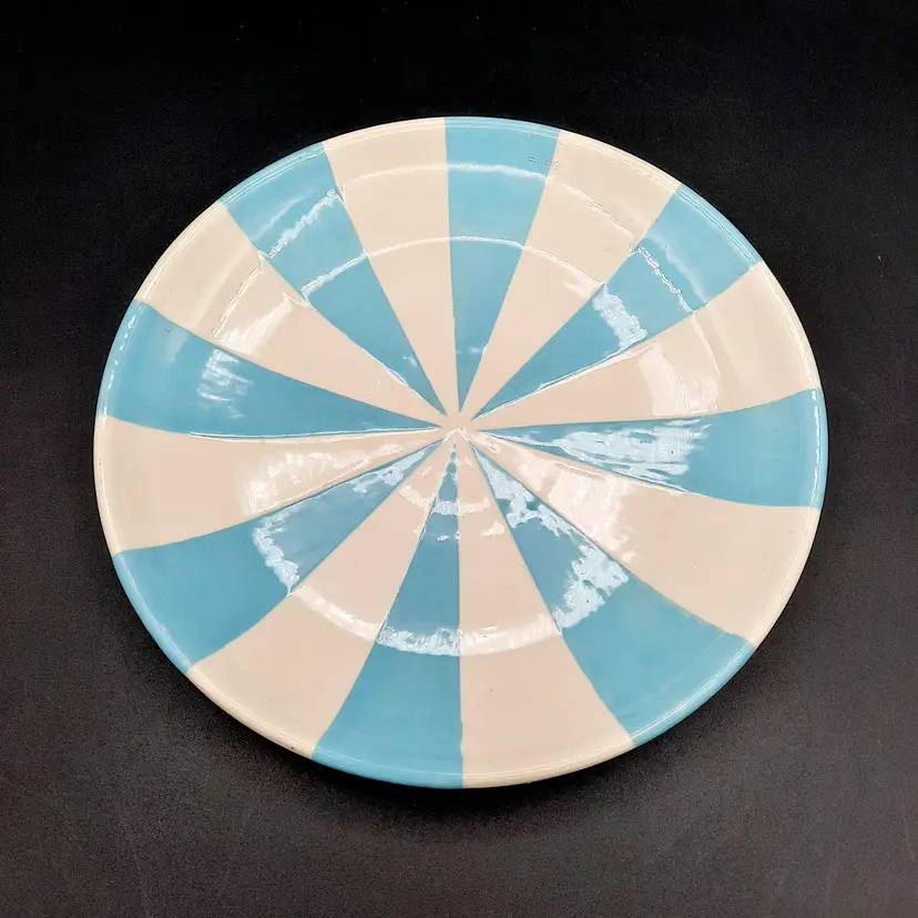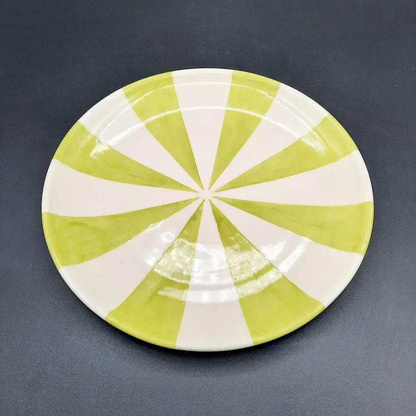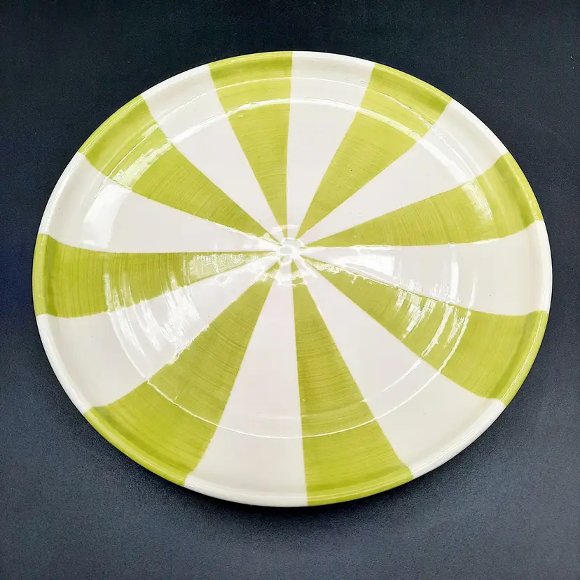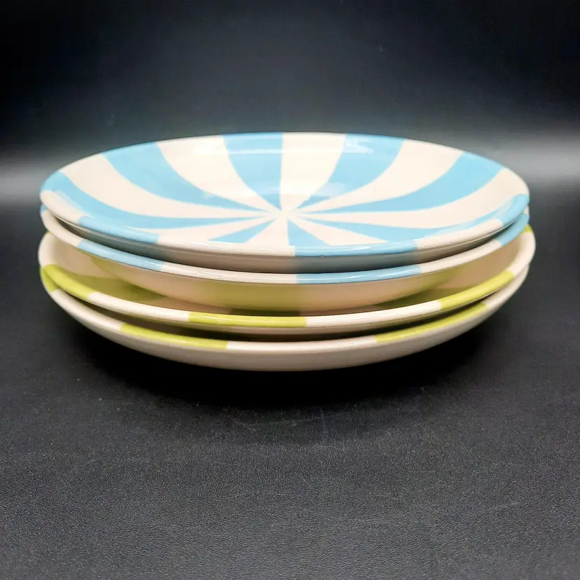 Incredible set of 4 vintage Jonathan Adler plates all stamped on bottom with marking not seen very often on his pieces. 2 plates are a lime green stripe and the other 2 are a powder blue stripe. No chips or cracks, the glaze finish is a small crackle design so there may be some crazing, but hard to see in the finish. There are some marks on the bottoms, a few dark specks and pinholes, but in overall very good condition for these unique plates!