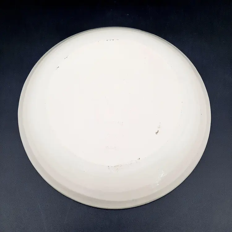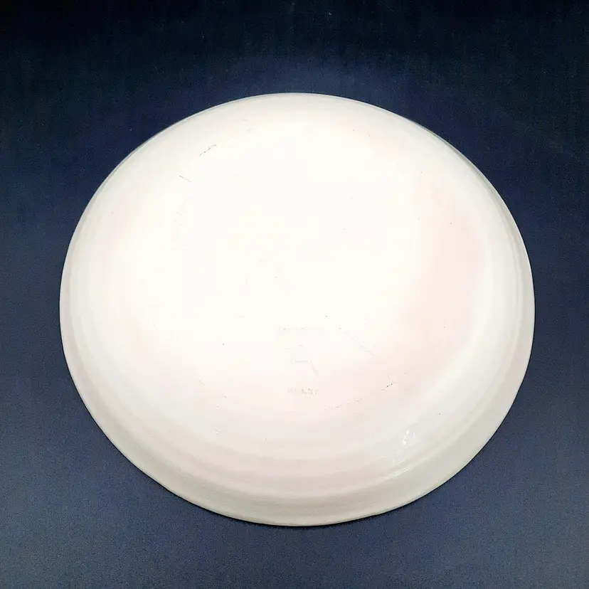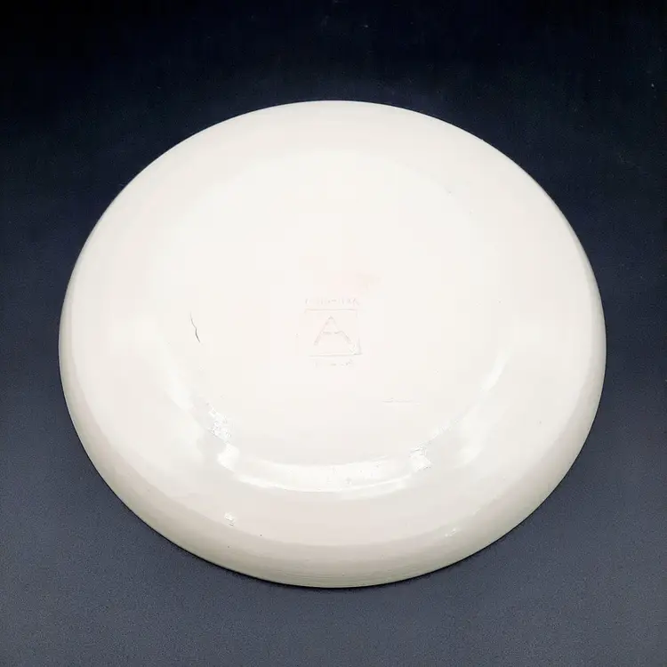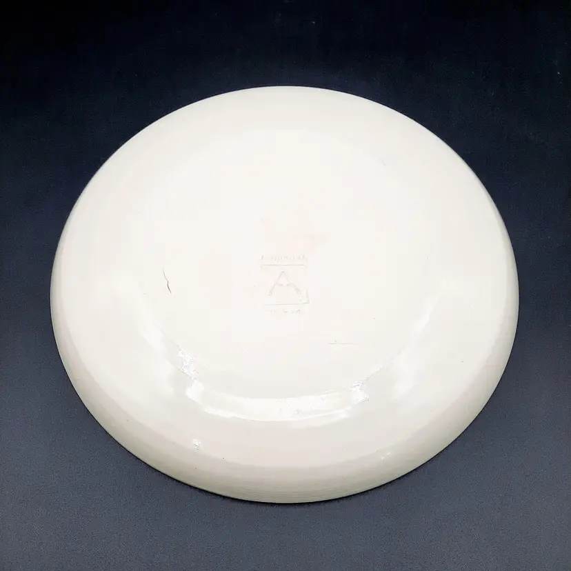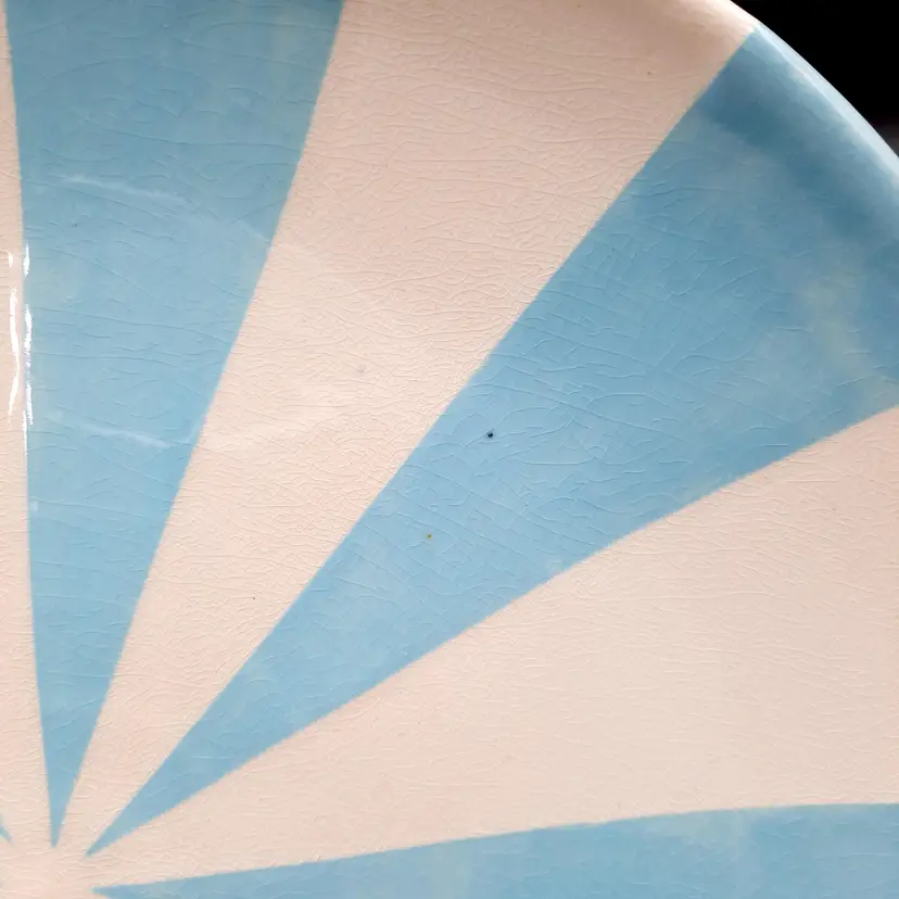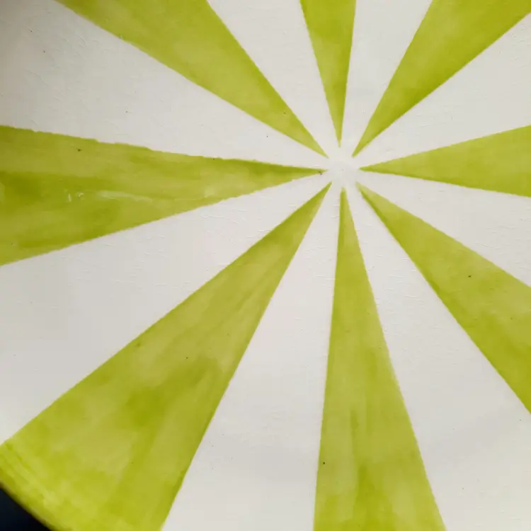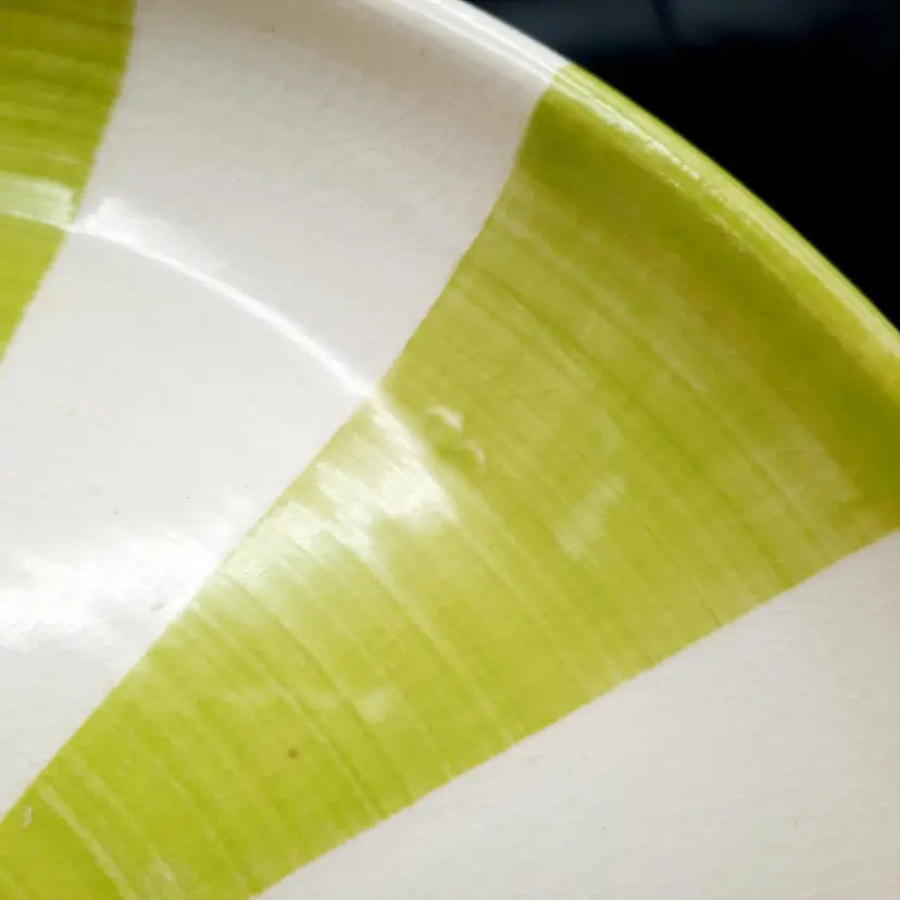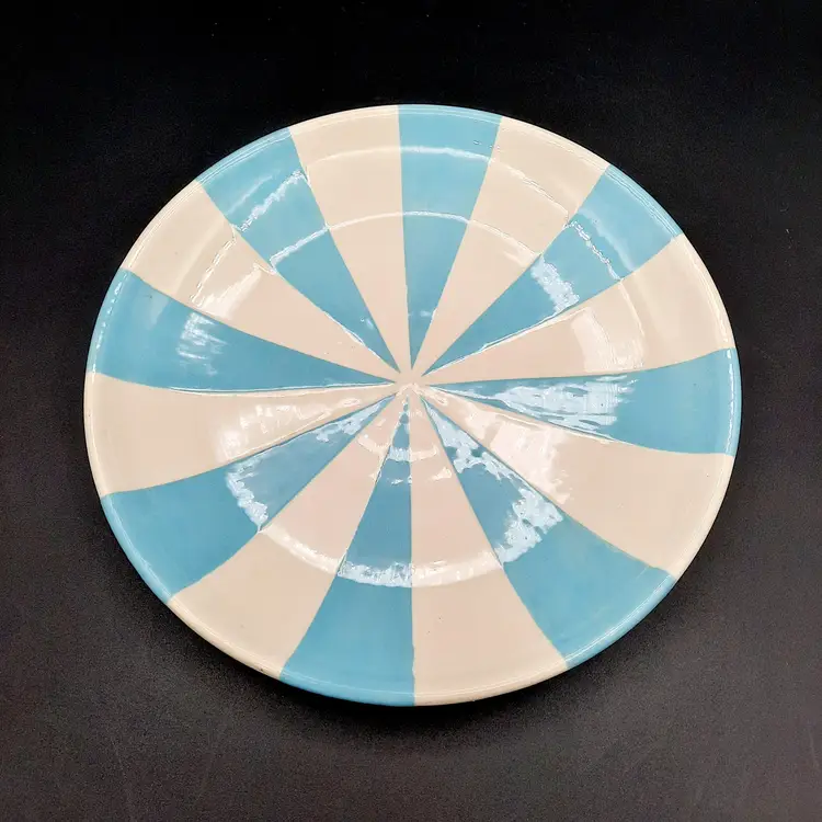 Incredible set of 4 vintage Jonathan Adler plates all stamped on bottom with marking not seen very often on his pieces. 2 plates are a lime green stripe and the other 2 are a powder blue stripe. No chips or cracks, the glaze finish is a small crackle design so there may be some crazing, but hard to see in the finish. There are some marks on the bottoms, a few dark specks and pinholes, but in overall very good condition for these unique plates!