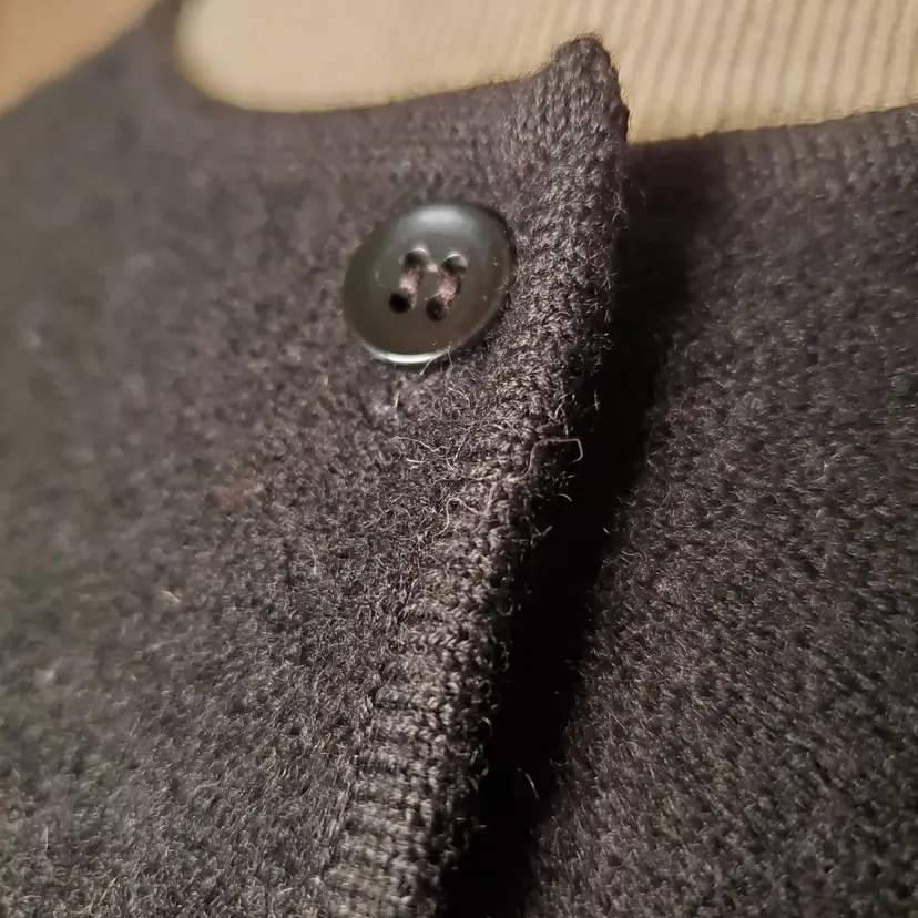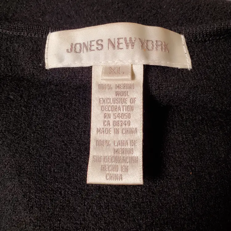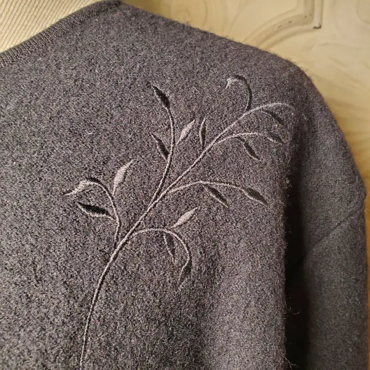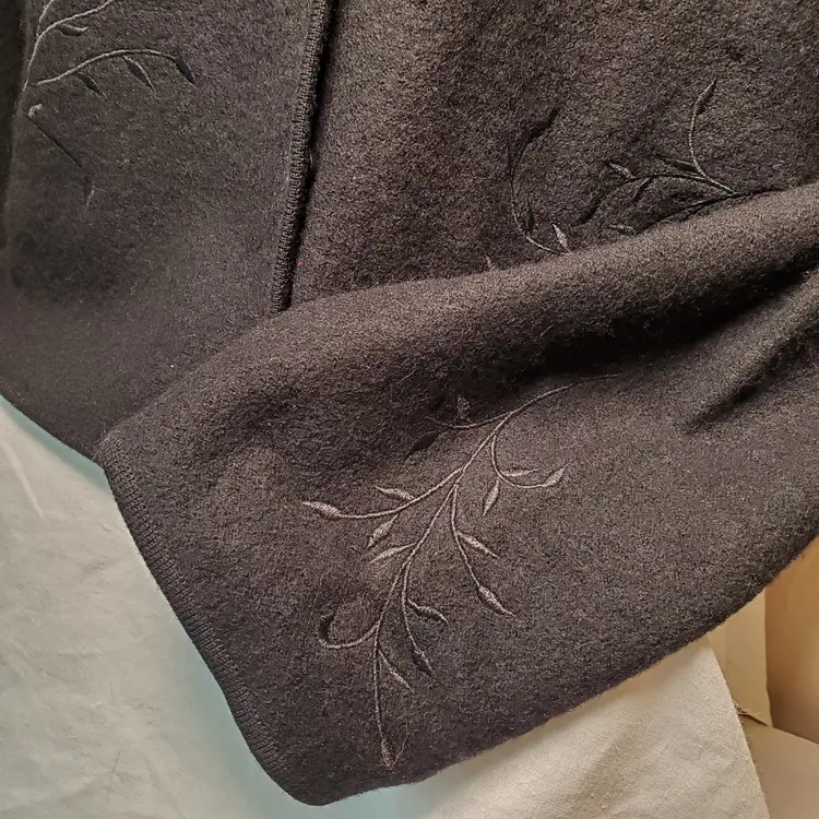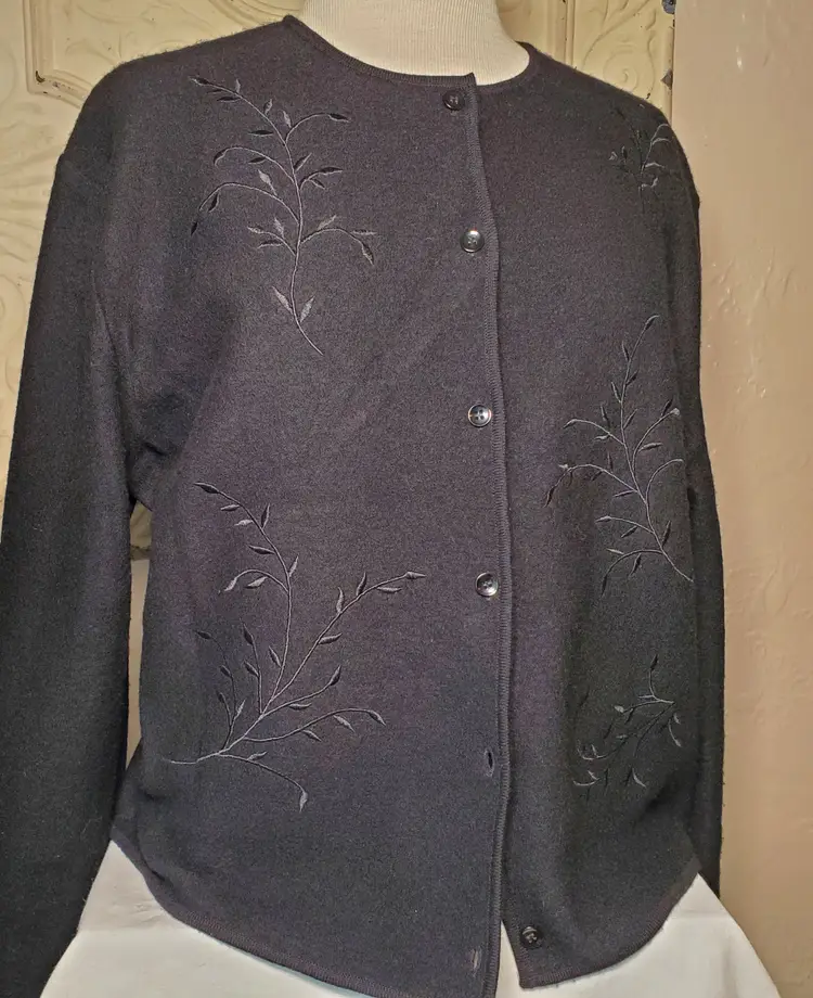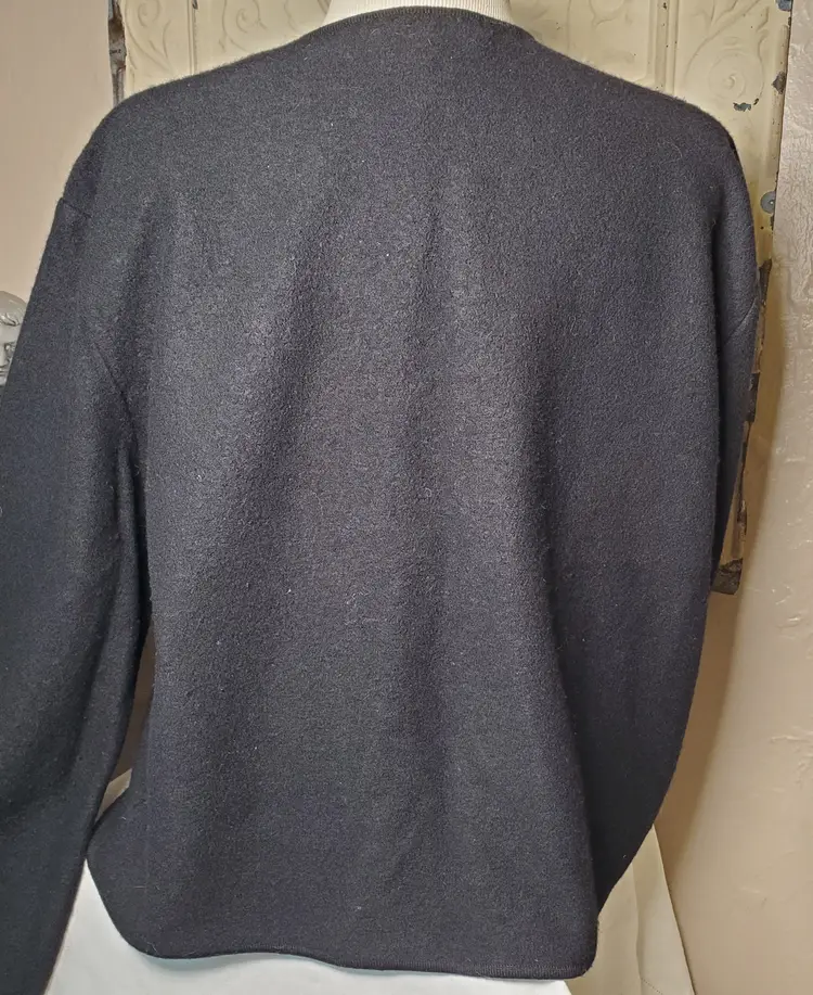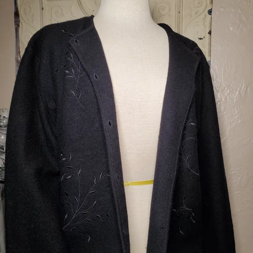 Lovely black wool cardigan sweater with floral embroidery. Size XL. 47" chest, 26" sleeve length, 24 1/2 length. In good vintage condition with light wear in a couple spots on arms.