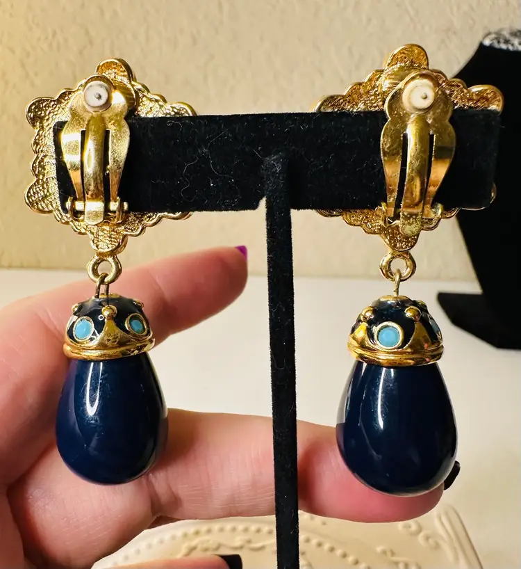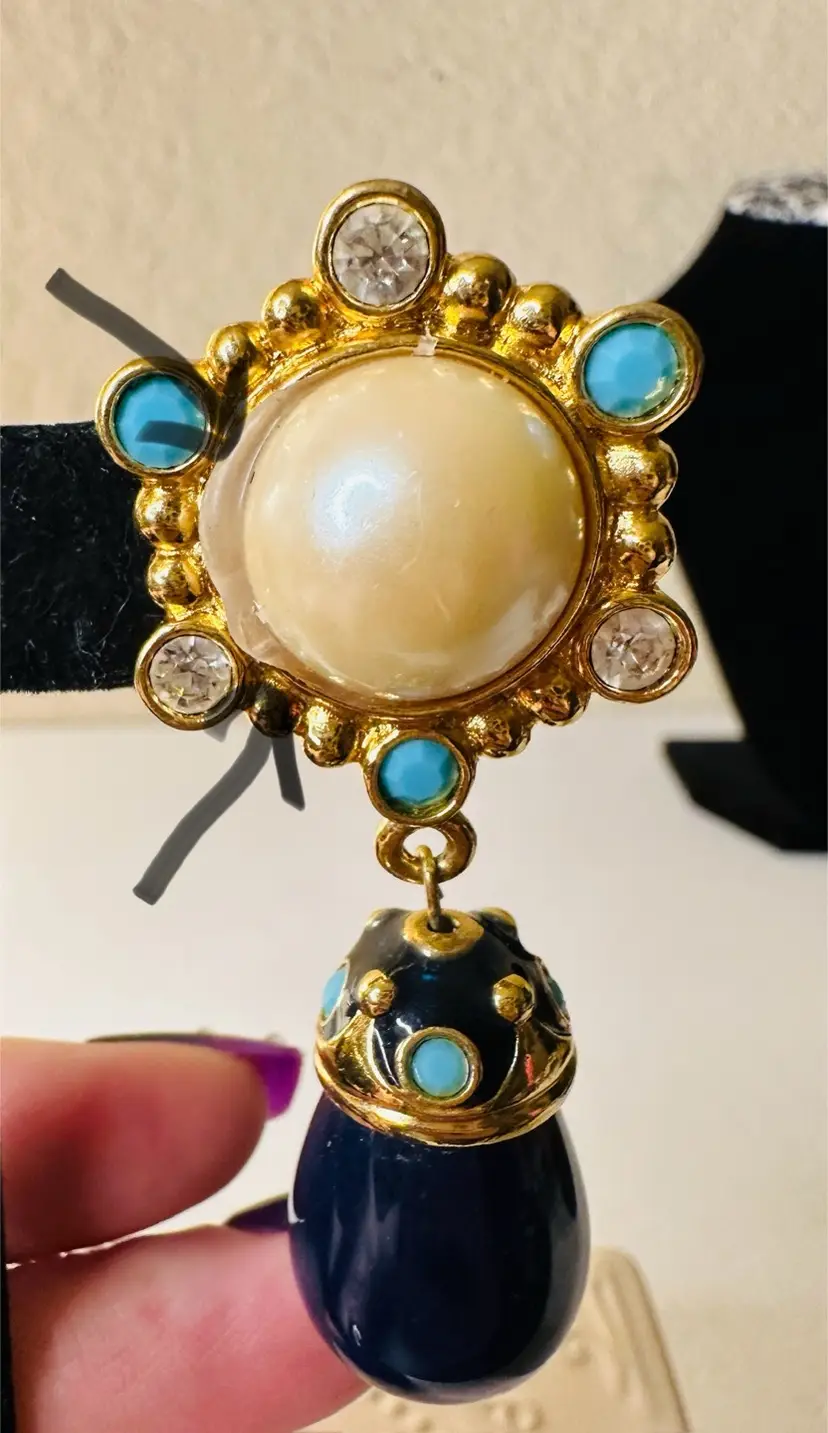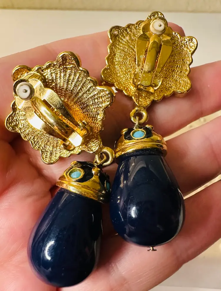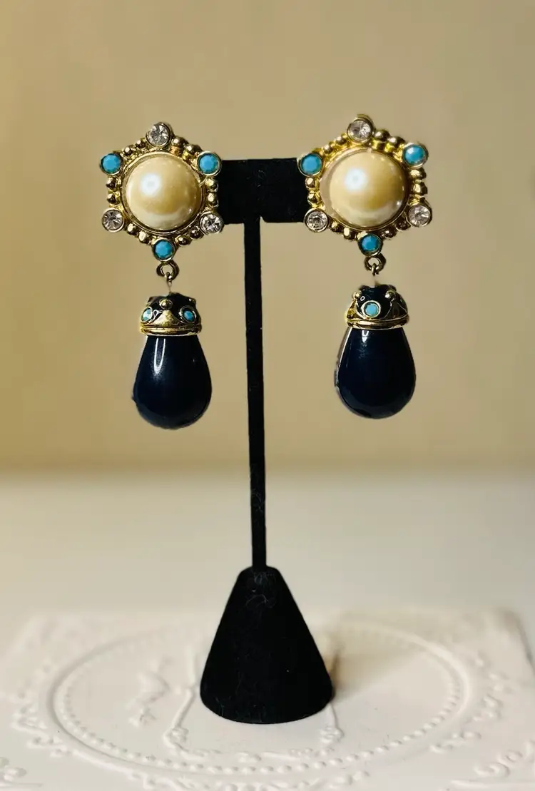 These stunning, rare clip earrings were originally part of the Roman Holiday set, sold for $475, and are a true example of exquisite craftsmanship. The earrings are substantial in weight and exhibit timeless, exotic beauty that makes them highly collectible. While they show some signs of wear (a small flaw where the pearl has been glued back, easily fixable by a jeweler), they are otherwise in great condition and ready to be enjoyed.