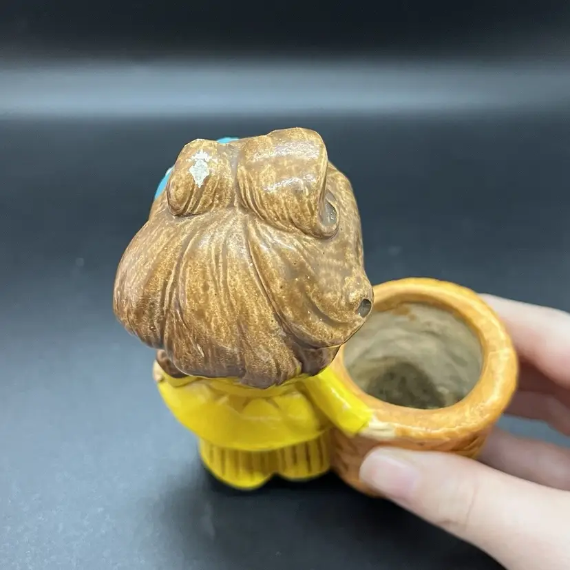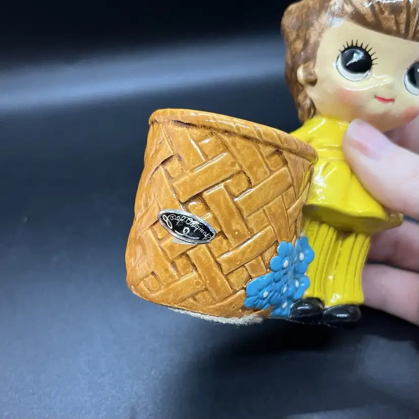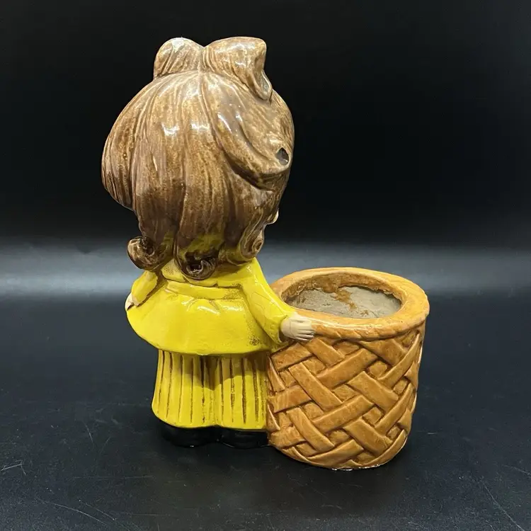 A 70s style small planter by Josef Originals, perfect size for a succulent. There's a small chip on the back of the girls head as pictured, measures almost 5" tall and 1.25" across the planter opening.