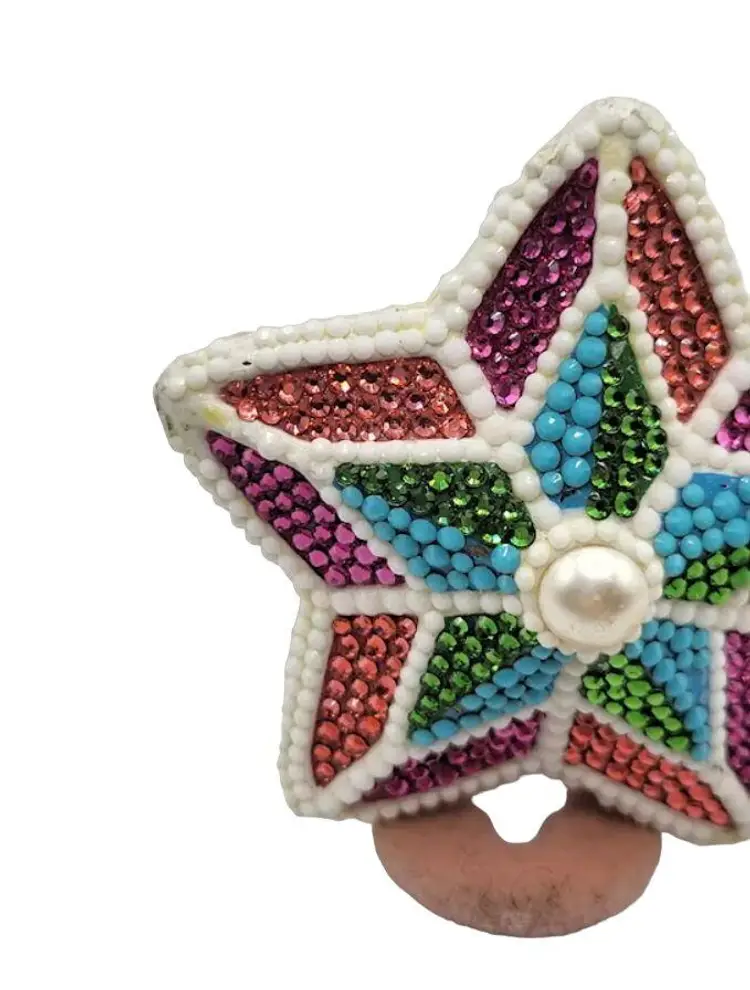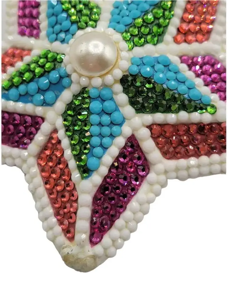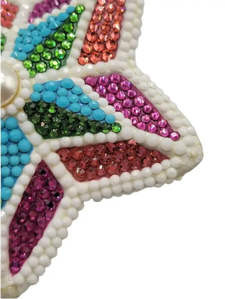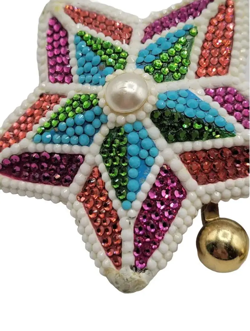 The colors are wonderful; they are not easy to find. It is in overall nice condition, but it does have a few condition issues. A few white stone is missing. Along 3 points of the star, there are some stones missing or replaced, as well as the white has been touched up. Not overly noticeable, unless your looking for it. It does have a bit of silver coming through on 1 point. The rest of the stones are perfect. Signed on the key ring, just about 2.5".