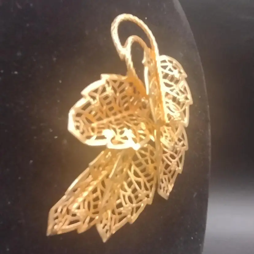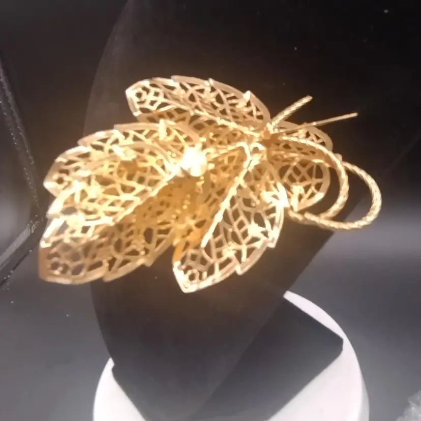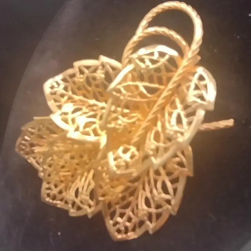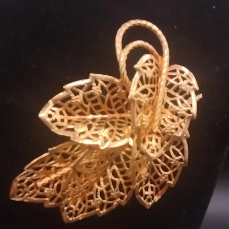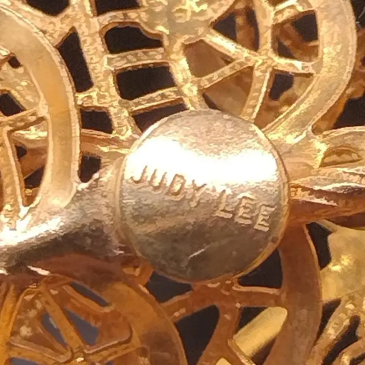 Add a touch of vintage elegance to your ensemble with this Judy Lee brooch pin, featuring a beautiful leaf design. The large, openwork filigree piece shimmers in a lustrous gold tone, capturing the light to draw the eye. Its classic style makes it an ideal choice for a variety of special occasions, from birthdays and anniversaries to Mother's Day and weddings. Signed by the renowned brand, this brooch is a testament to timeless fashion. Despite the lack of information about the exact metals or stones, its design speaks for itself, offering a charming accessory for any jewelry collection. Whether it's an addition to your personal trove or a thoughtful gift, this piece is sure to be cherished.
