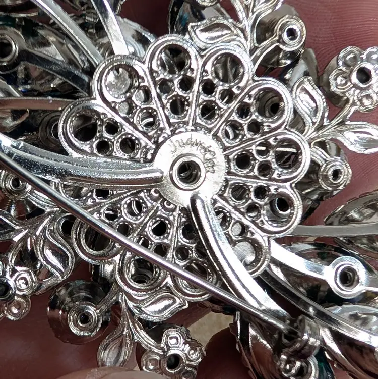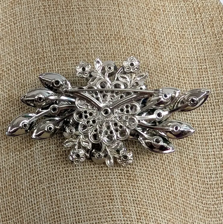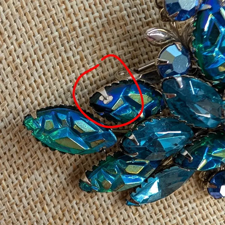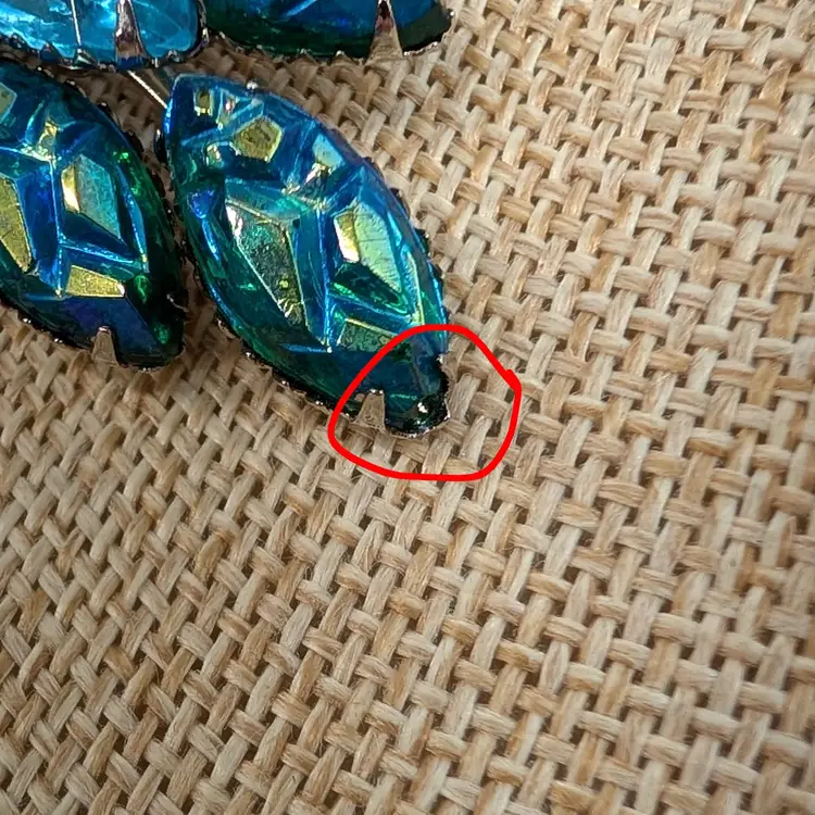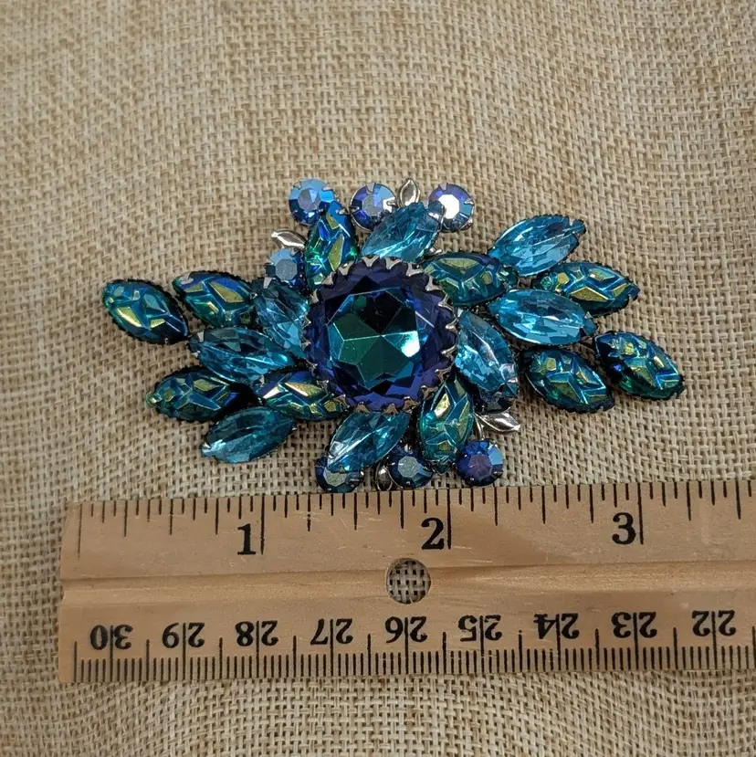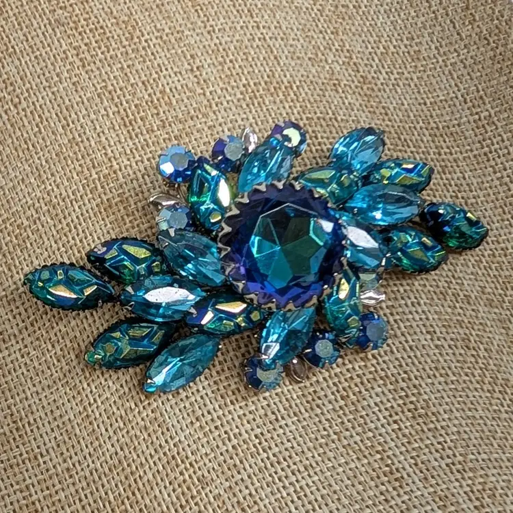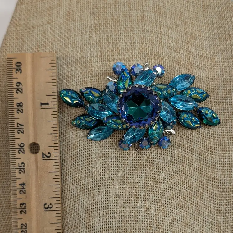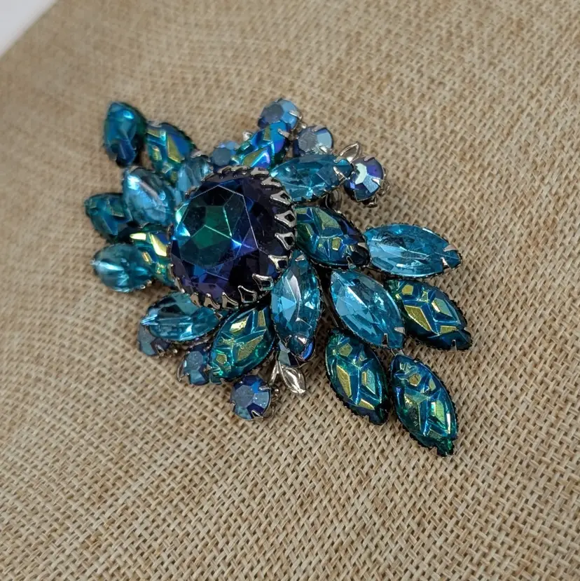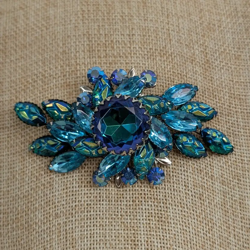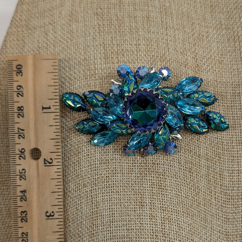 Gorgeous, large brooch from Judy Lee featuring a large heliotrope rhinestone in the middle with green and blue colors. Surrounded by layers of pressed glass, iridescent marquee rhinestones, aqua rhinestones, cornflower blue rhinestones and pressed metal leaves. In nice, used condition with the following callouts: one area of silver under a prong and one flea bite on the end of a pressed glass rhinestone (circled in red in the pictures). Measurements ~ 3.25 x 1.75"