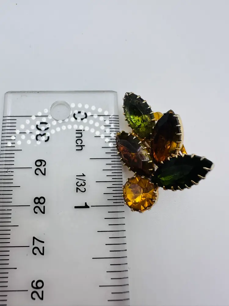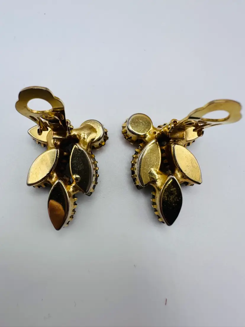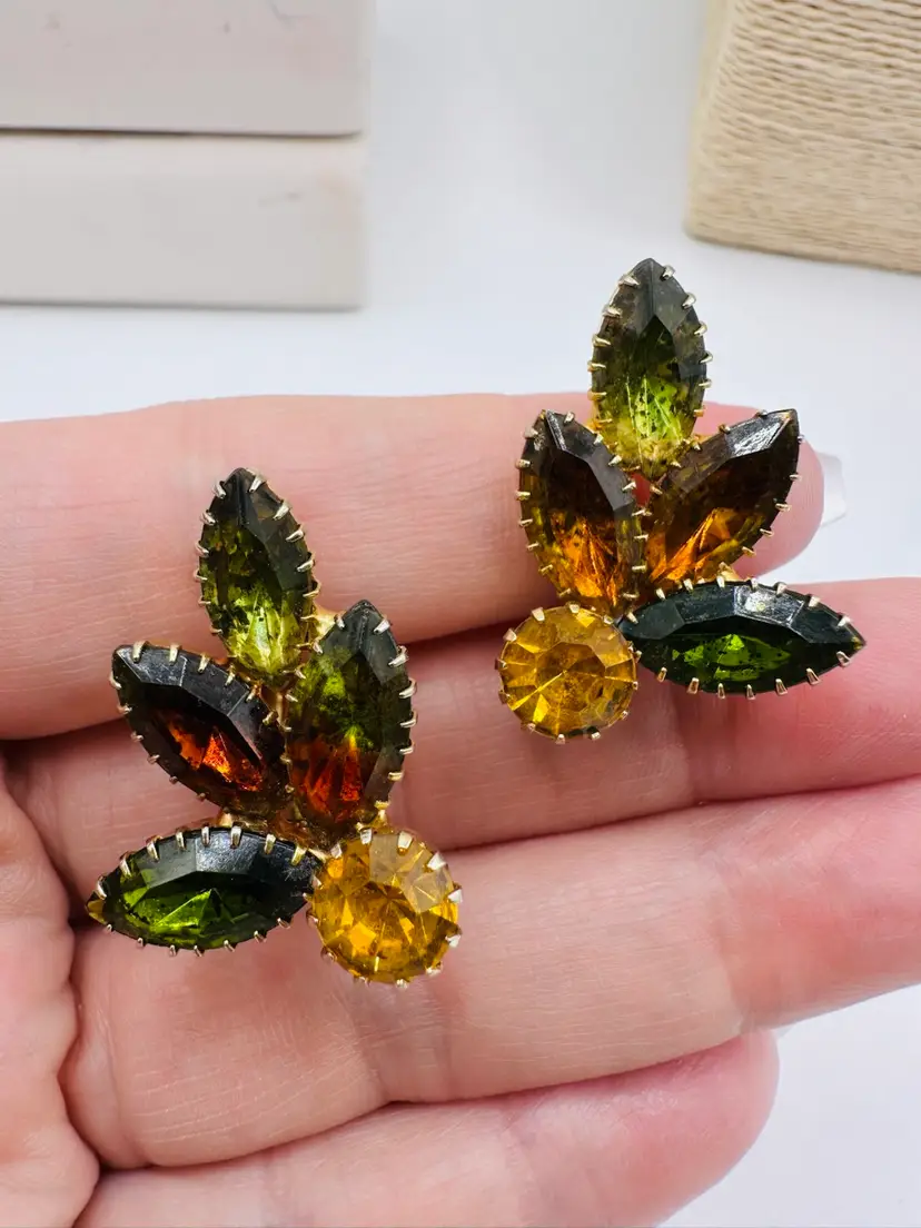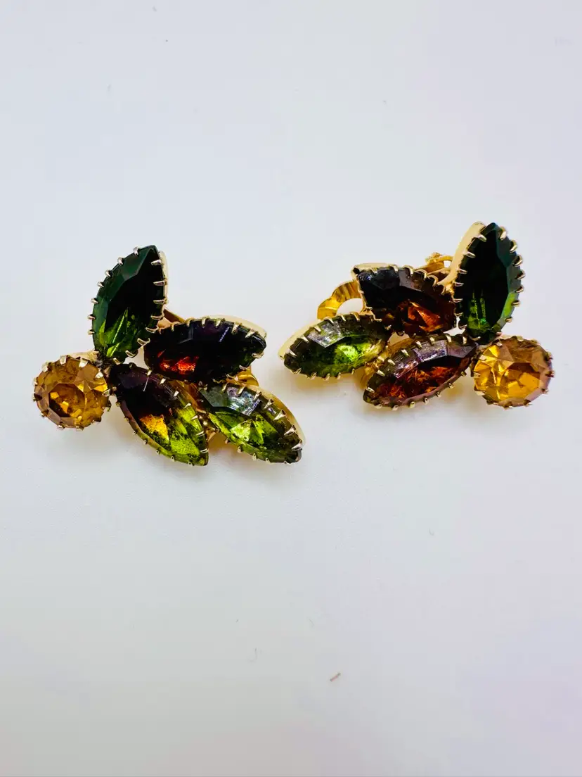 These Vintage Juliana D&E Rhinestone Fall Colors Gold Tone Clip Earrings from the 1960s are a stunning addition to any jewelry collection. The earrings feature a beautiful multicolor rhinestone design in shades of brown, green, and orange, set in a gold tone metal. With a clip-on closure and a huggie style, these earrings are perfect for women looking to add a touch of vintage glamour to their outfit. The unsigned Juliana D&E brand adds a touch of authenticity to these United States-made fashion pieces.