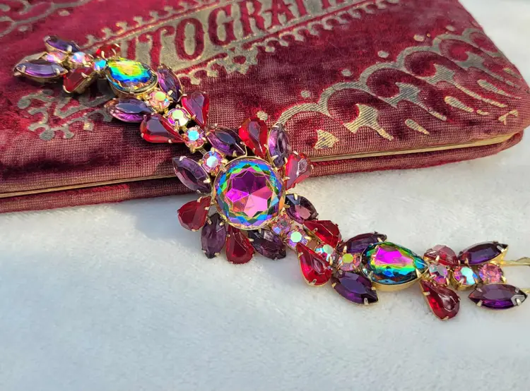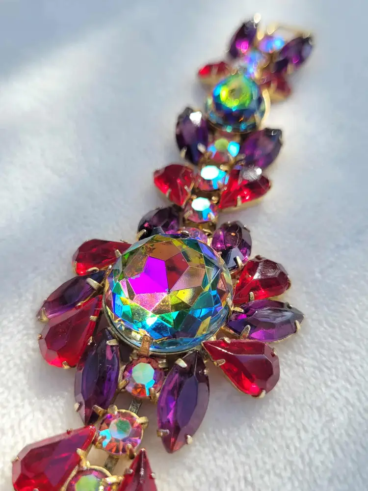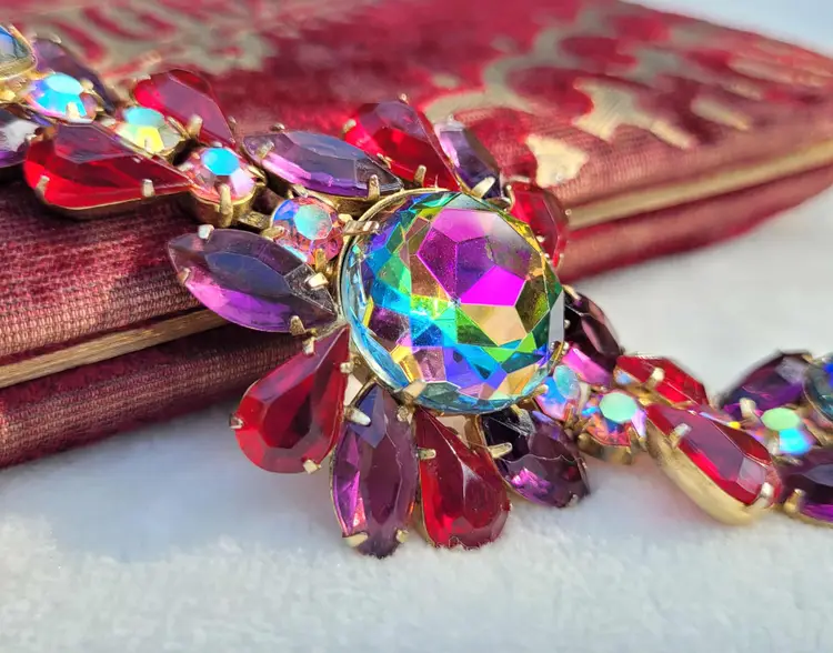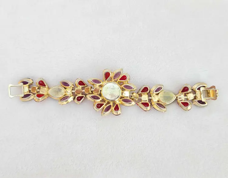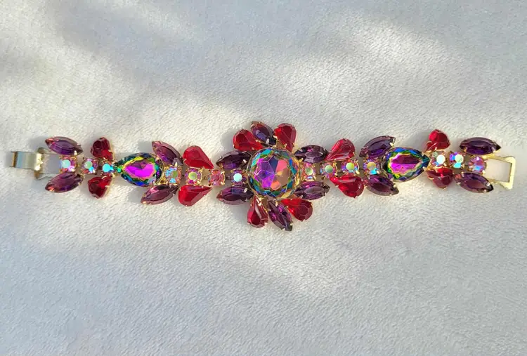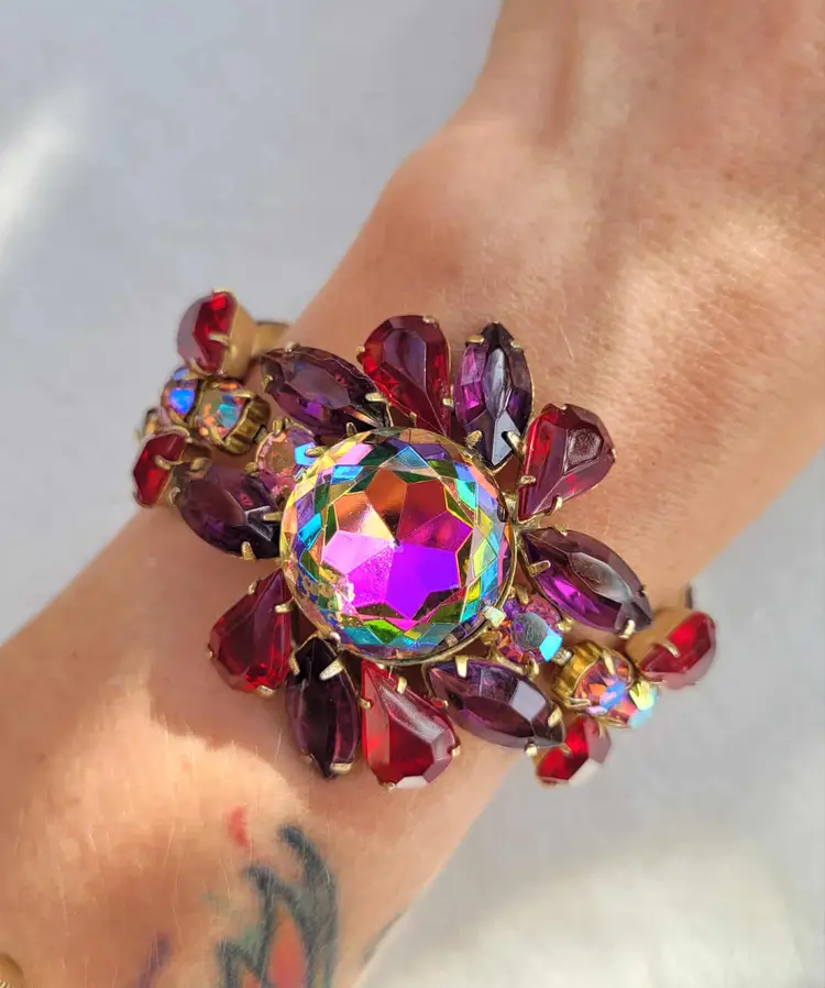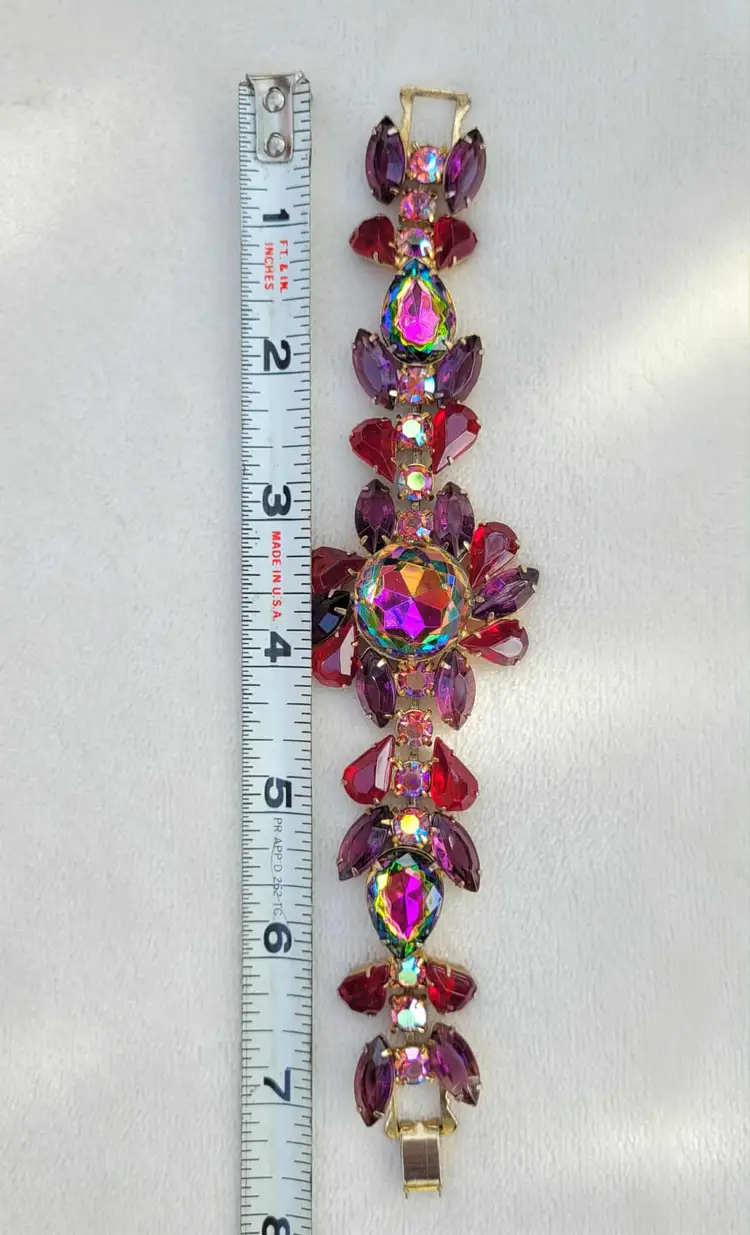 Stunningly gorgeous original 1960s watermelon heliotrope rhinestone statement bracelet by Delizza & Elster! This is in very good condition and measurements 7.5", please see pictures for details and measurements.