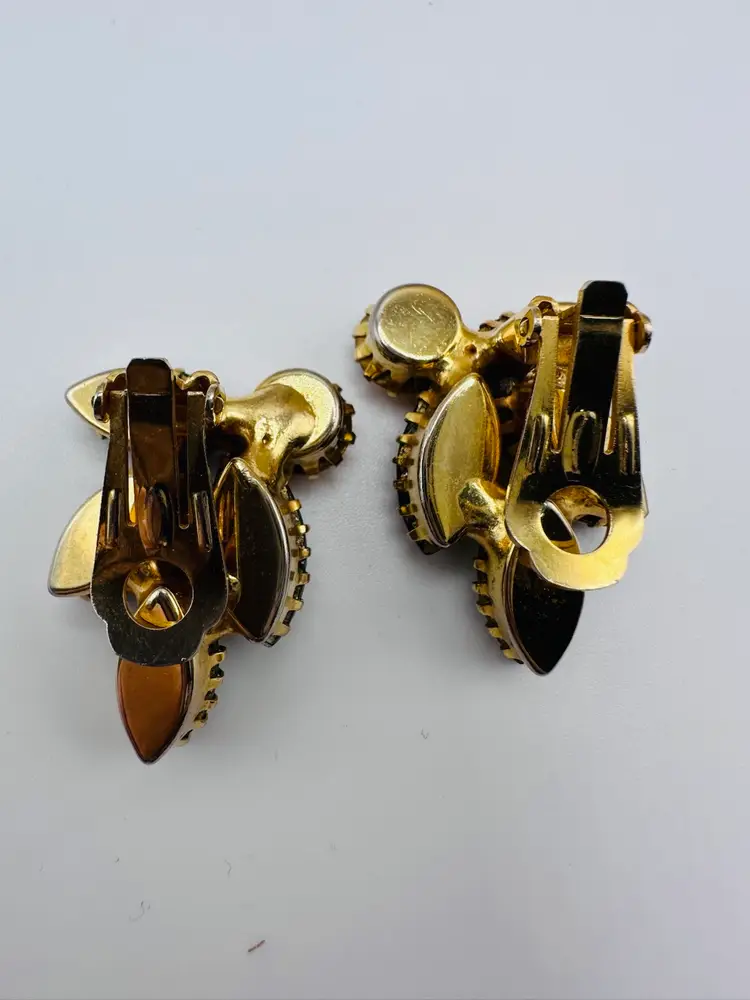 These Vintage Juliana D&E Rhinestone Fall Colors Gold Tone Clip Earrings from the 1960s are a stunning addition to any jewelry collection. The earrings feature a beautiful multicolor rhinestone design in shades of brown, green, and orange, set in a gold tone metal. With a clip-on closure and a huggie style, these earrings are perfect for women looking to add a touch of vintage glamour to their outfit. The unsigned Juliana D&E brand adds a touch of authenticity to these United States-made fashion pieces.