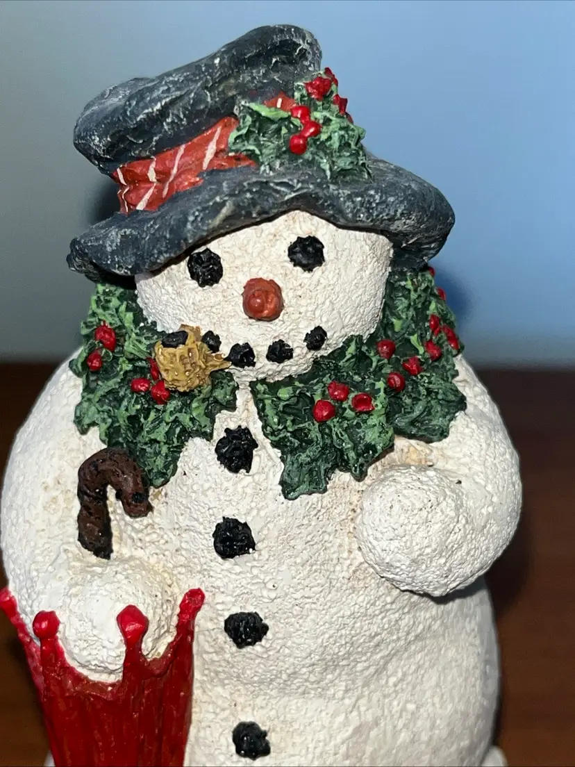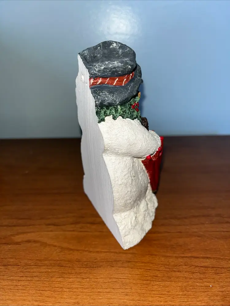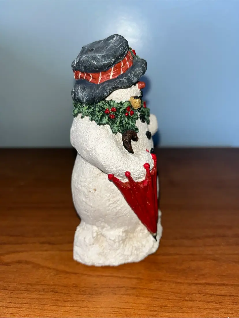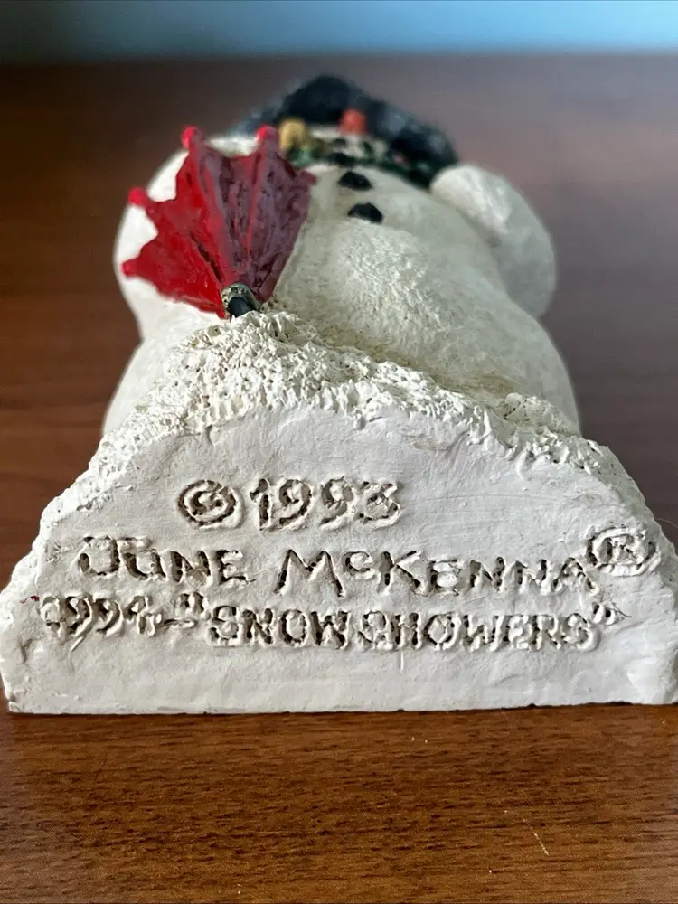 Vintage June McKenna Flat Back Snowman Christmas Figurine 1994 "Snow Showers". Approximately 4.5" tall. Pre-owned and in good condition. Expect normal wear such as scuffs or scratches. See photos and ask any questions prior to purchase.