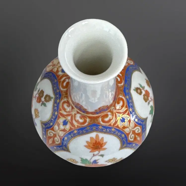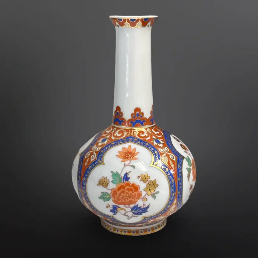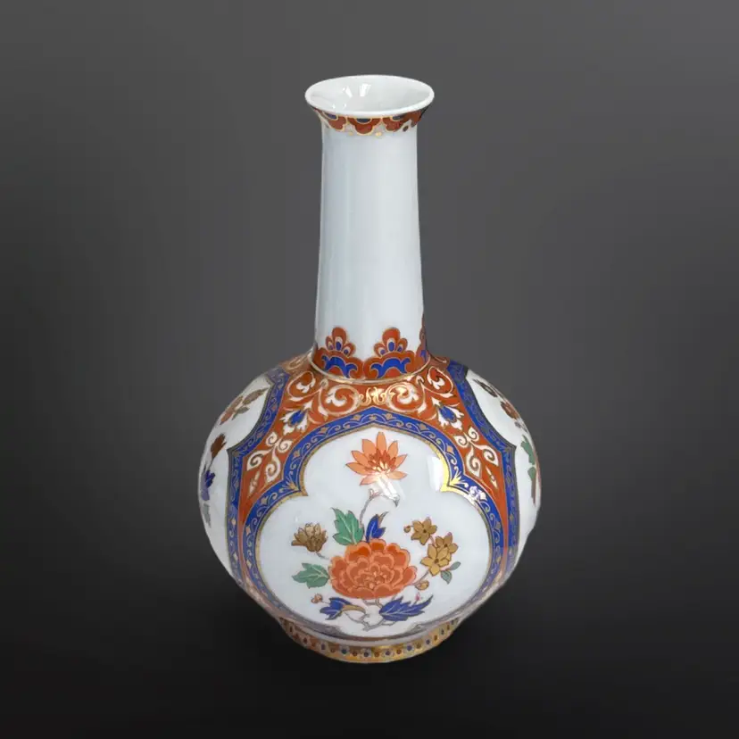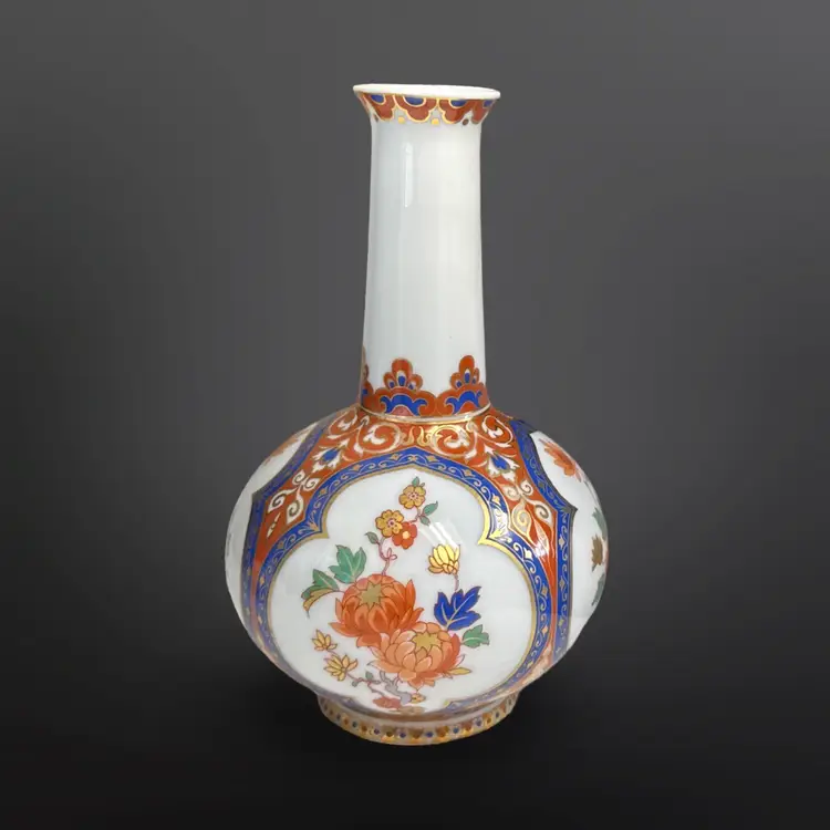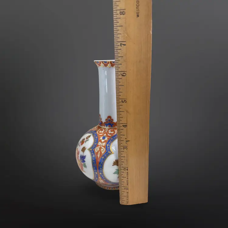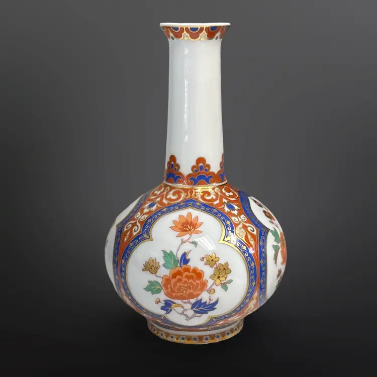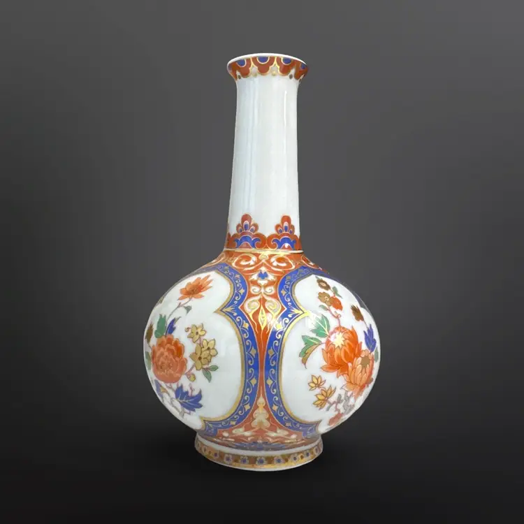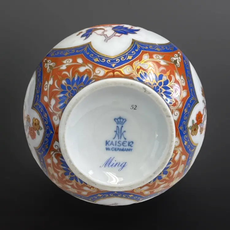 Beautiful vintage Kaiser W. Germany "Ming" pattern porcelain bottle/bud vase. Beautiful chinoiserie style flower and bird decoration appears in four panels having colors of cobalt blue, white, and salmon with generous gilded highlights. Panels are interspersed with highly detailed blue floral and scrolling cream vines against a light cinnabar background. Base has the Kaiser W Germany mark dating it between 1970-1990. In great vintage condition; no damage. Measures approximately 4” in diameter by 6.5” H
