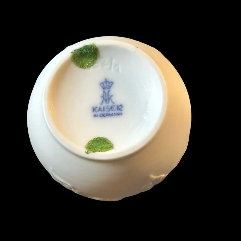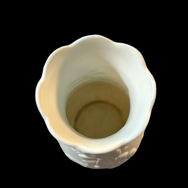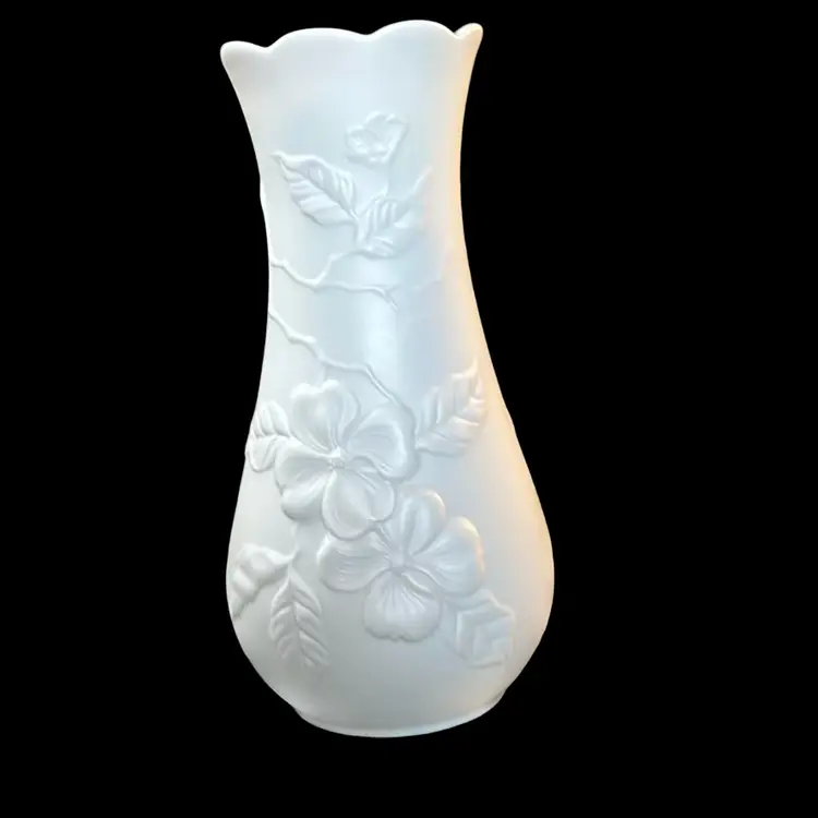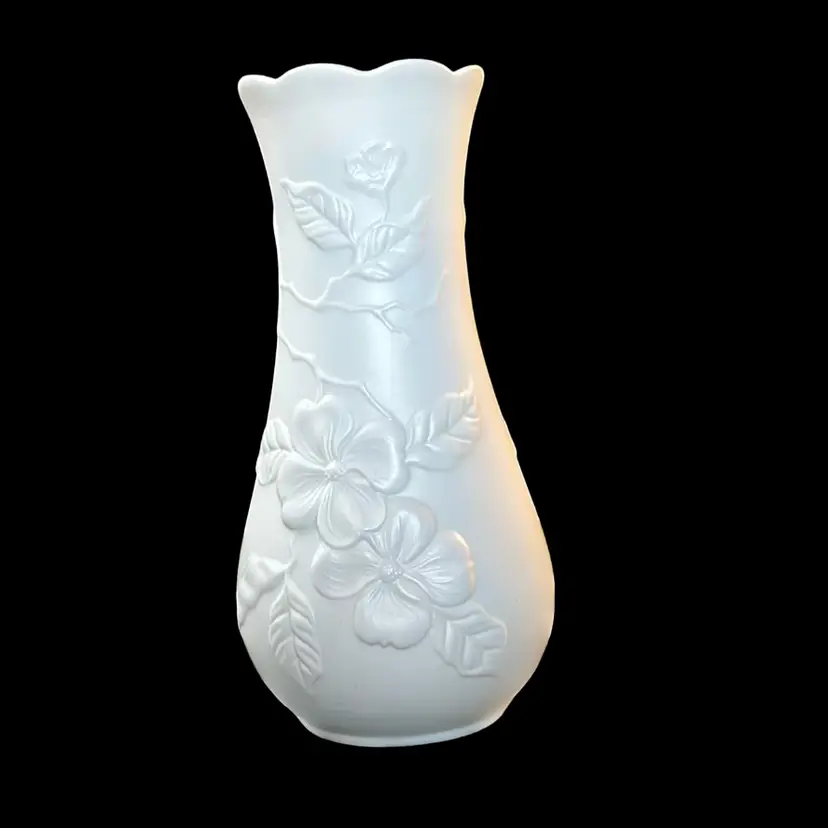 Here we have a beautiful vase. Made in Germany. White dogwood flowers. Matte finish on the outside. Glazed on the inside. It stands 6 inches tall. 2 inches at both opening and base.