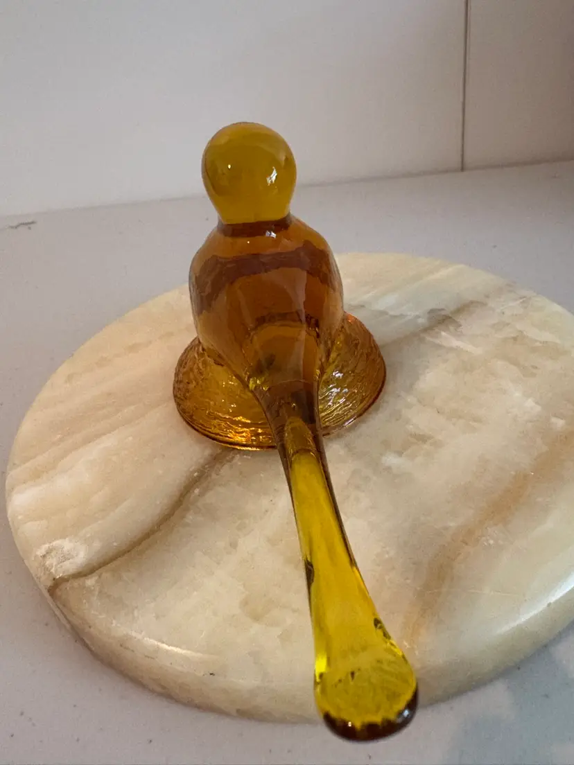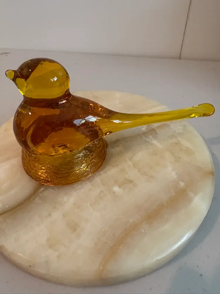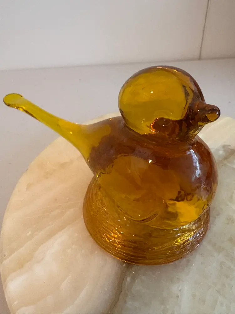 This amber glass bird sitting on its nest is 5”long and 3" tall. It is in very good condition