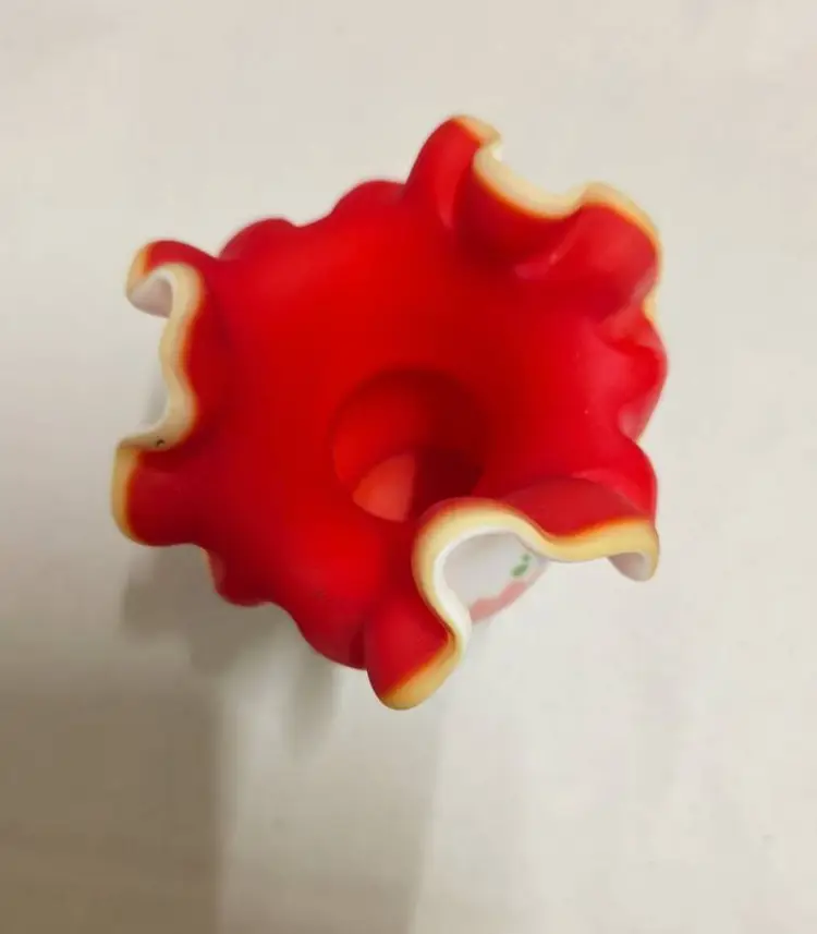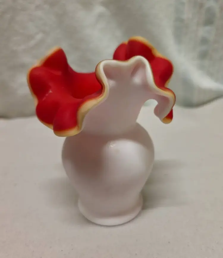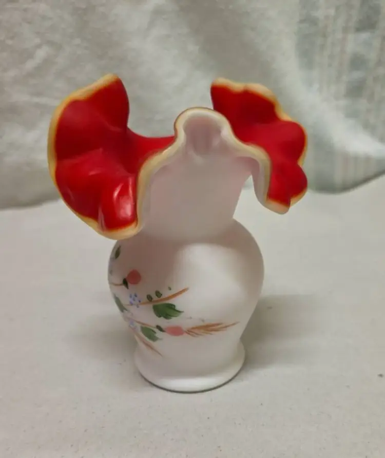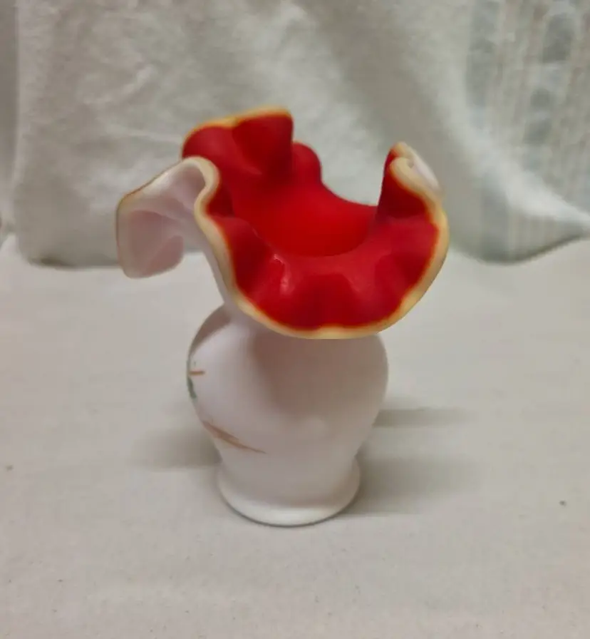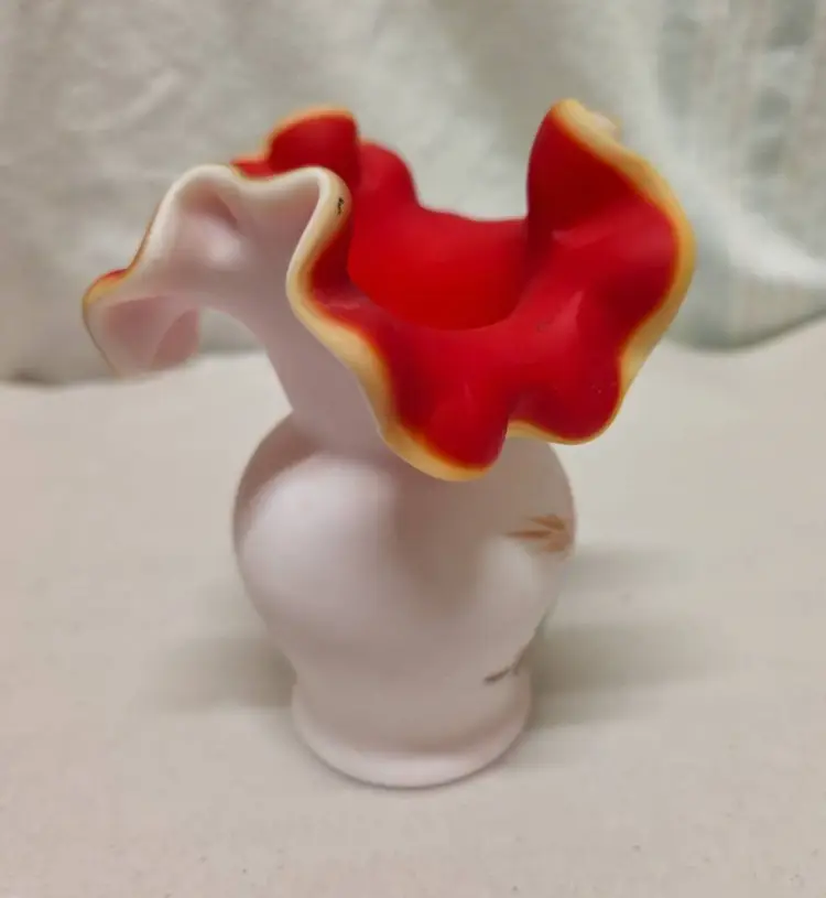 This Kanawha Art Glass Red Cased 5 Inch Ruffled Edge White Vase features hand-painted flowers in a Mid-Century Modern style. Made in West Virginia, in the United States in the 1960s, this decorative vase is a vintage piece of art glass with a matte finish. The red, white, and pink colors used in the design add a touch of elegance to any space. Perfect for displaying a rose or other flowers, this handmade vase is a unique and charming addition to any glass or vase collection.