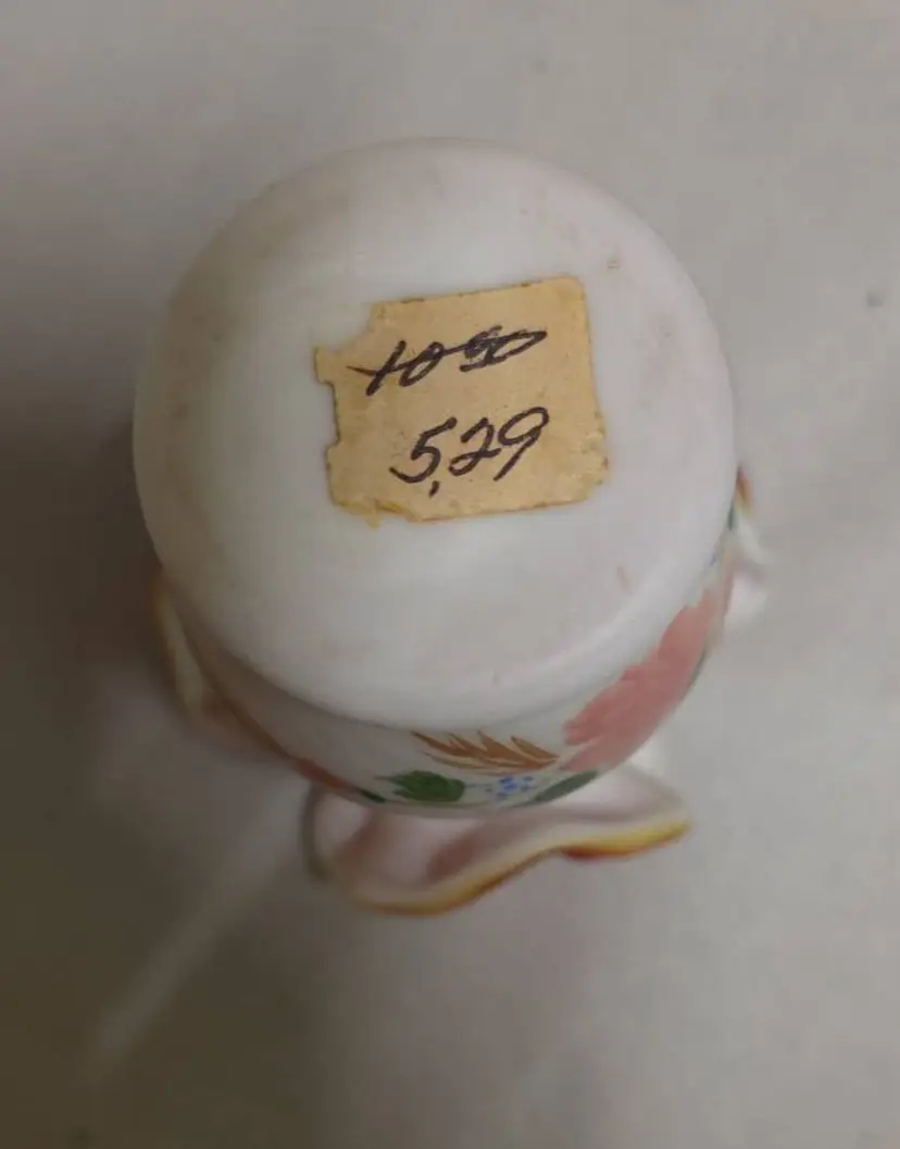 Old sticker on the bottom that may come off under hot water, but it's up to the buyer to get it off.