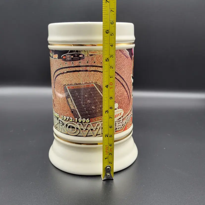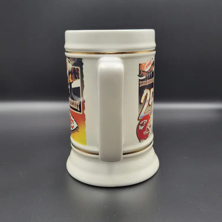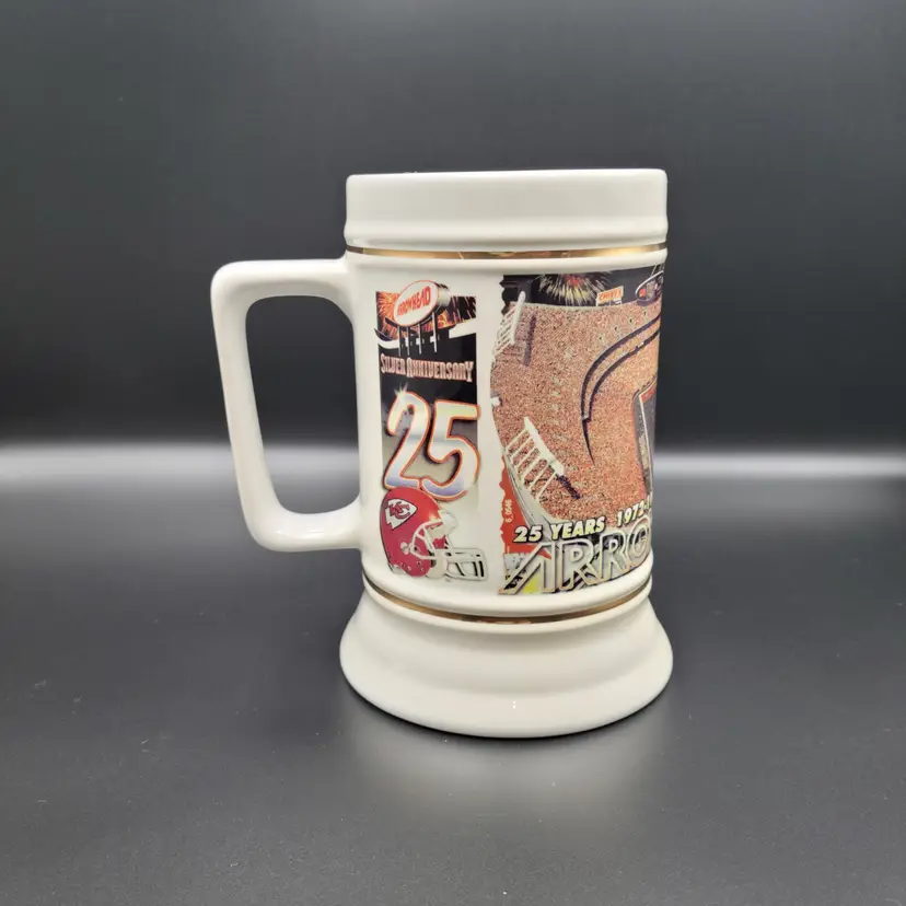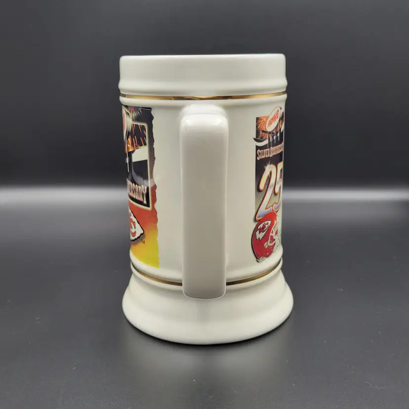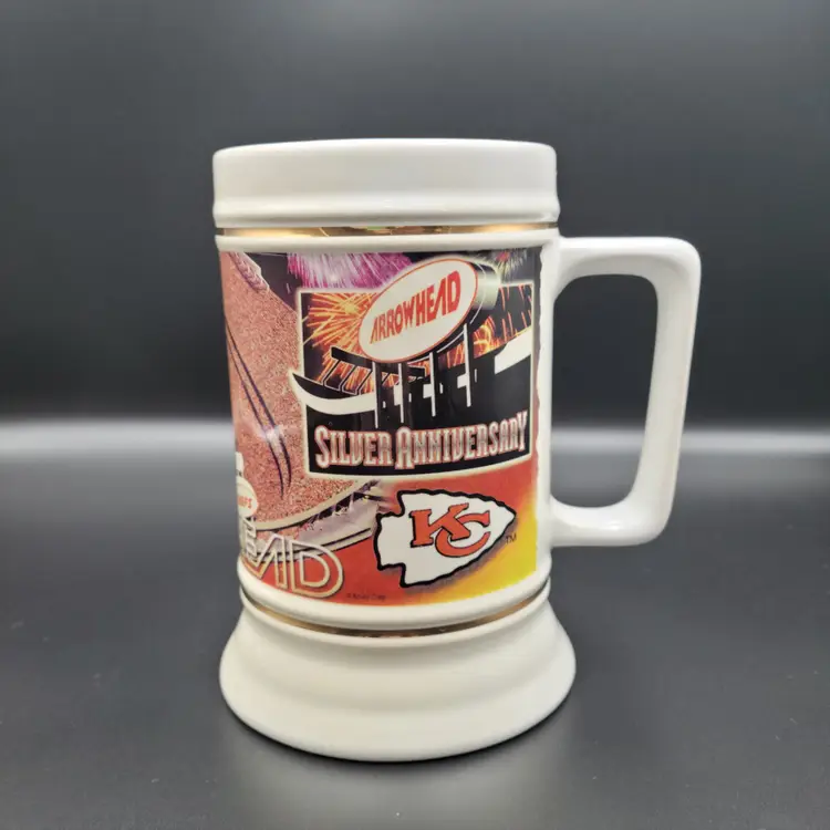 This stein commemorates the "Silver Anniversary" which is 25 years, referencing the period 1972-1997 for Arrowhead Stadium. It is in excellent condition with no chips or cracks. Measures approximately 6 inches tall, opening is 3.5 inches in diameter and is 5 inches wide including the handle. Thank you for looking and have a great day!