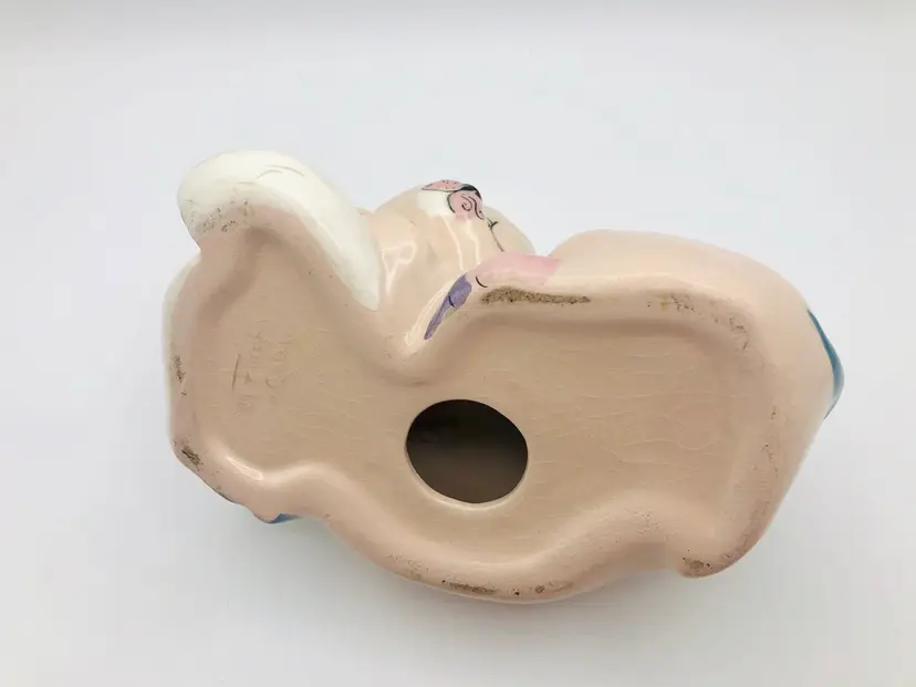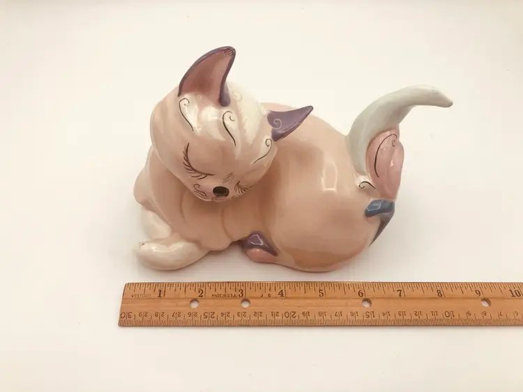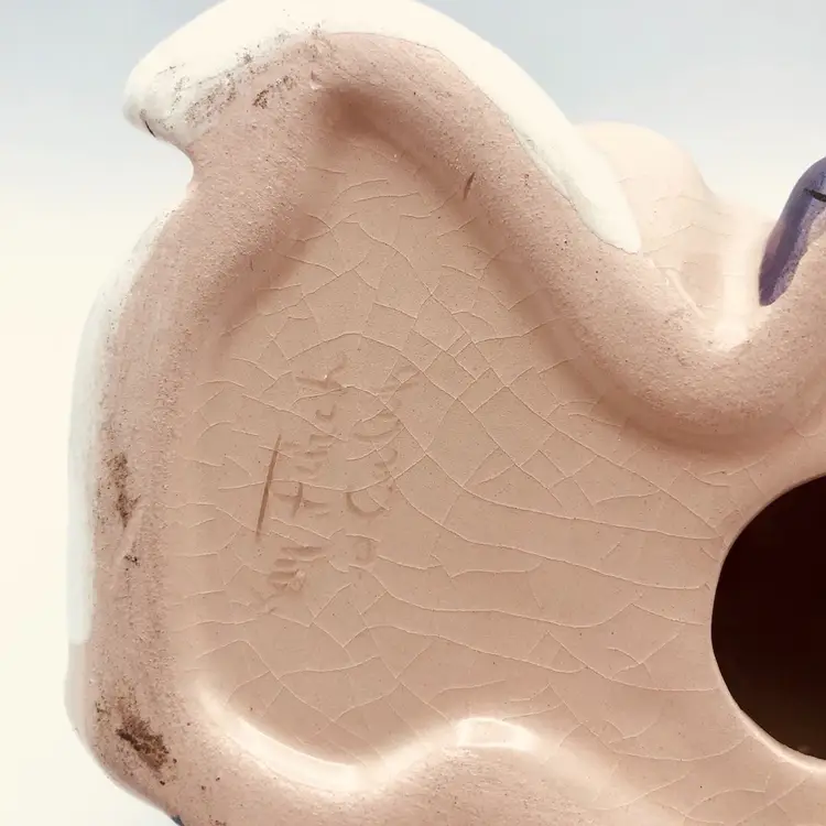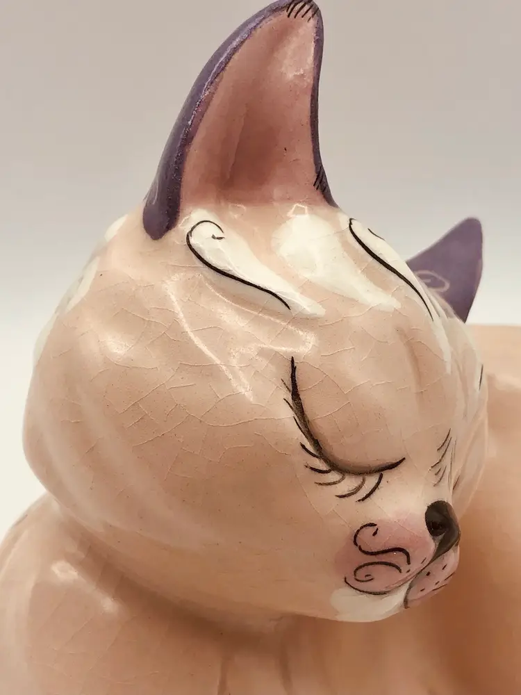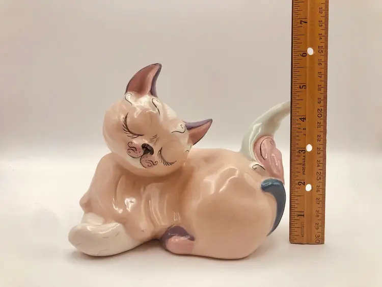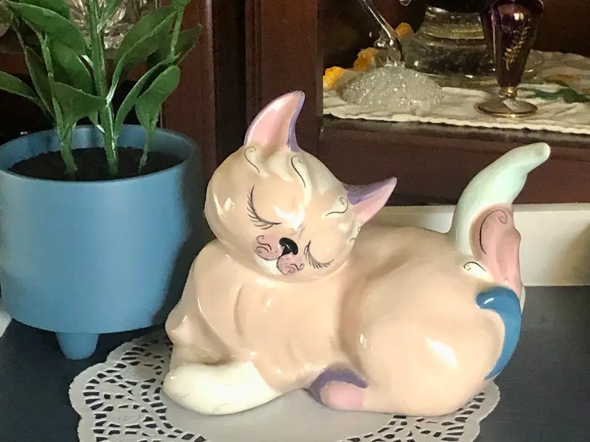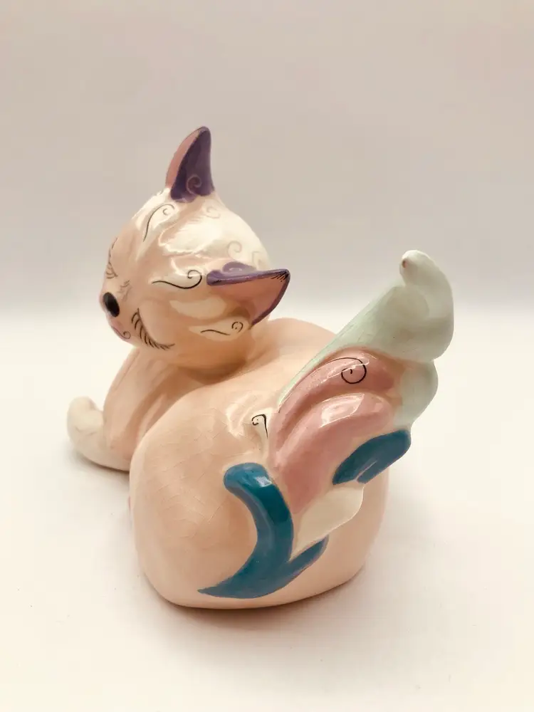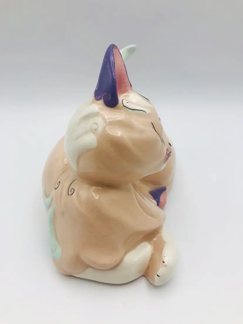 Kay Finch signed cat made of ceramic in pastel colors of light peach, pink, blues and lavender. Handpainted features made this a real whimsical cutie! Crazing of the glaze typical of MCM age. Under Kay Finch inscribed signature is what looks like the name “Caleb”. See photos for detail. No chips are damage.