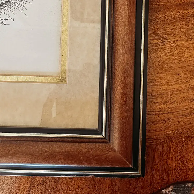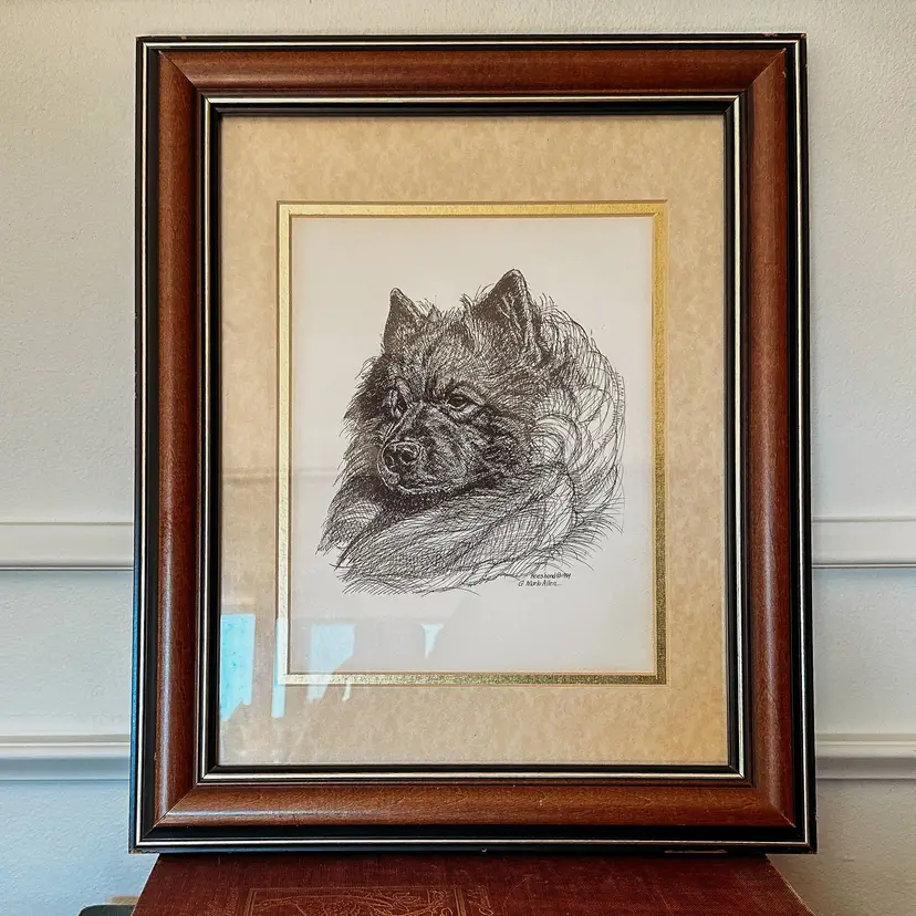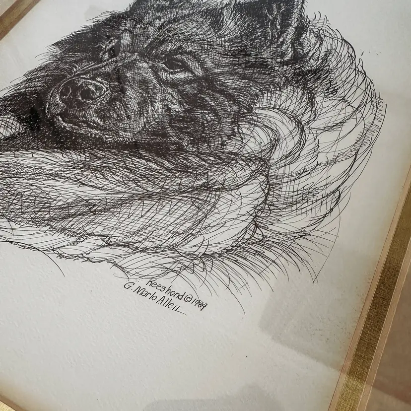 Dated 1989 by artist G. Marlo Allen, this appears to be original work of art! A wonderful pen and ink drawing by listed artist G. MARLO ALLEN, who does incredible dog portraits. Framed under glass with a black, brown and gold frame with a beautiful inner matting of cream and gold. There is some substantial surface damage to the outer edge of the frame which could be repainted. But the frame itself is secure and strong. This would make an amazing addition top any dog-loving home! measures 17x14"