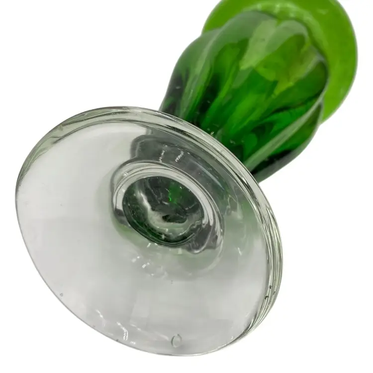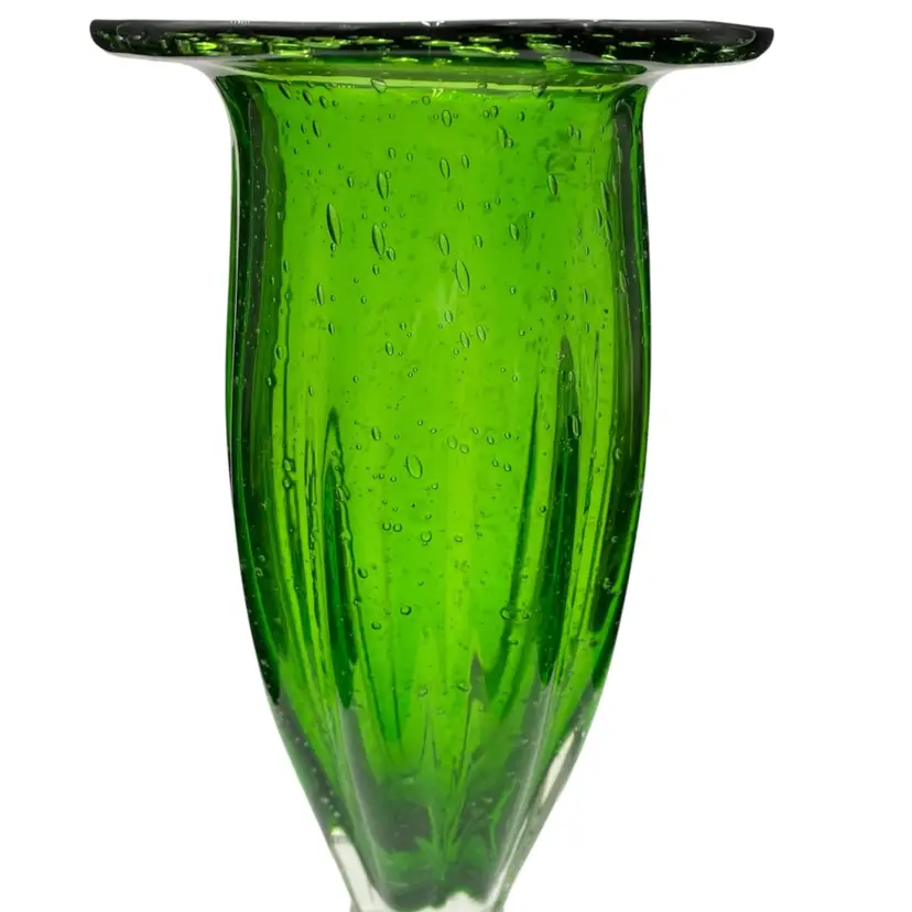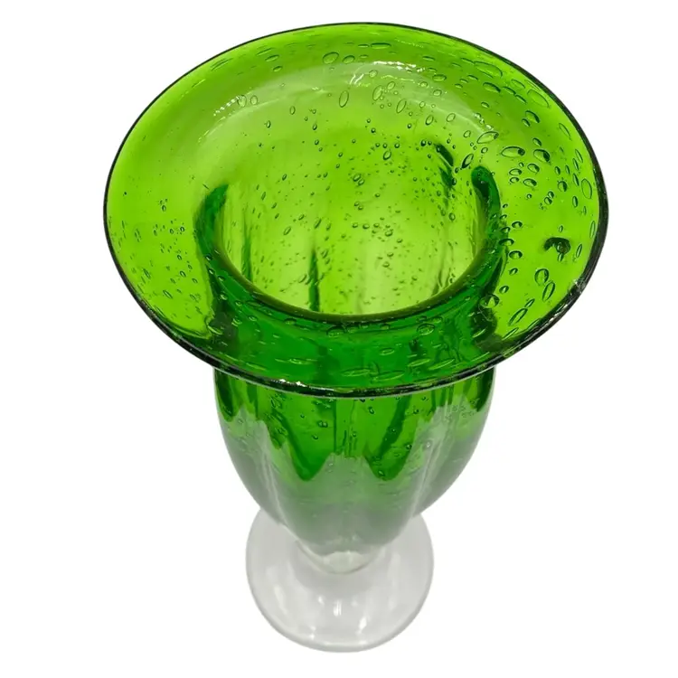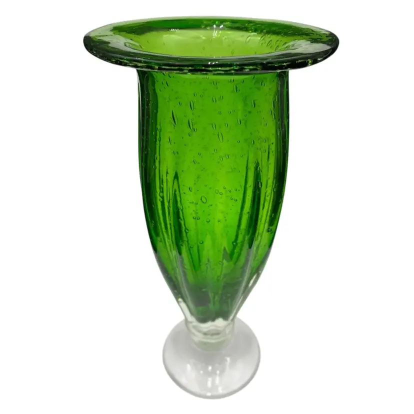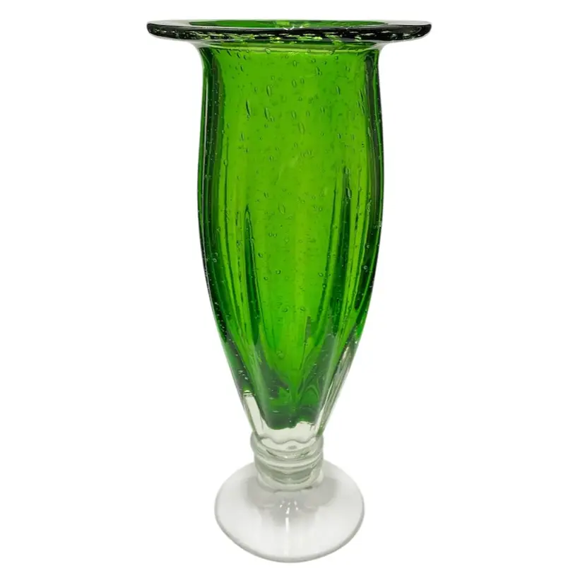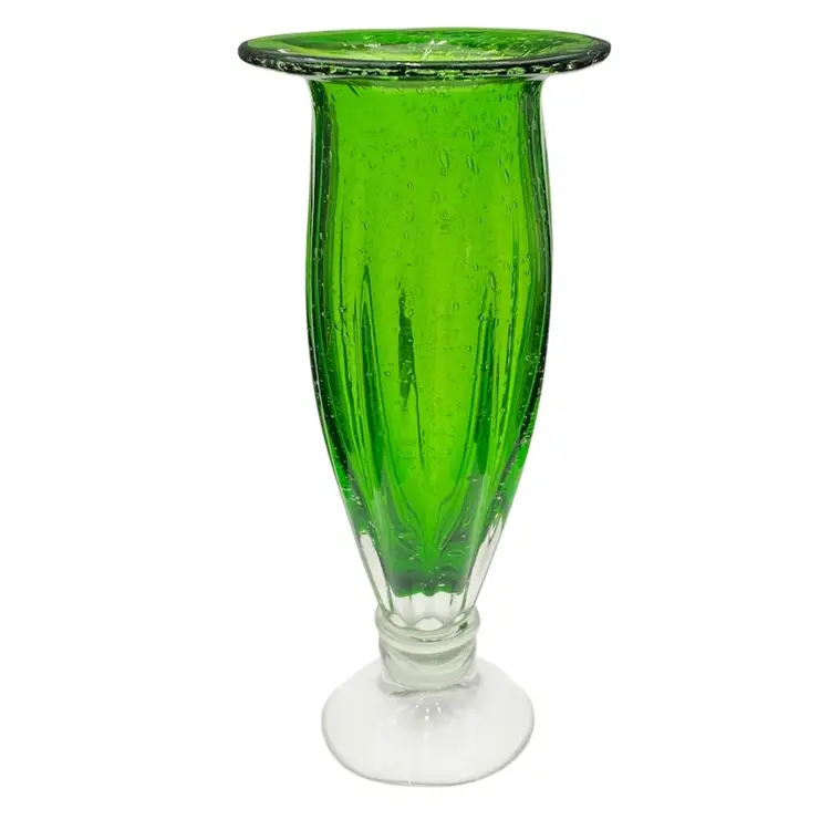 Add a pop of color to your decor with this vintage vibrant green bubble glass vase. The oblong, fluted shape and clear footed pedestal give it a modern touch, while the hand-blown glassmaking technique and glossy finish showcase its artisanal quality. Measuring 10.5 inches in length and 4.6 inches in width, this medium-sized vase is perfect for displaying your favorite flowers or as a standalone decorative piece.