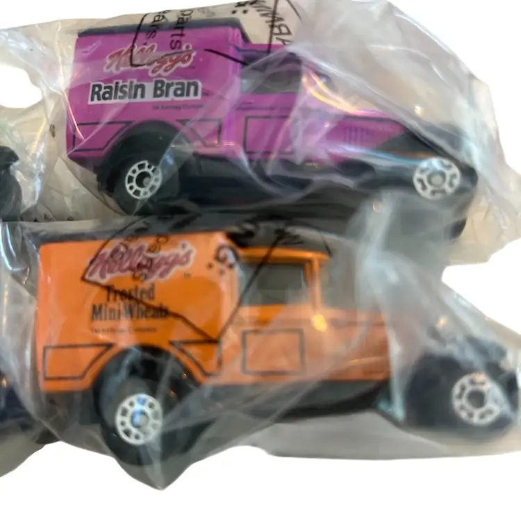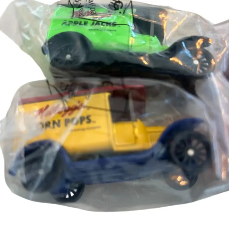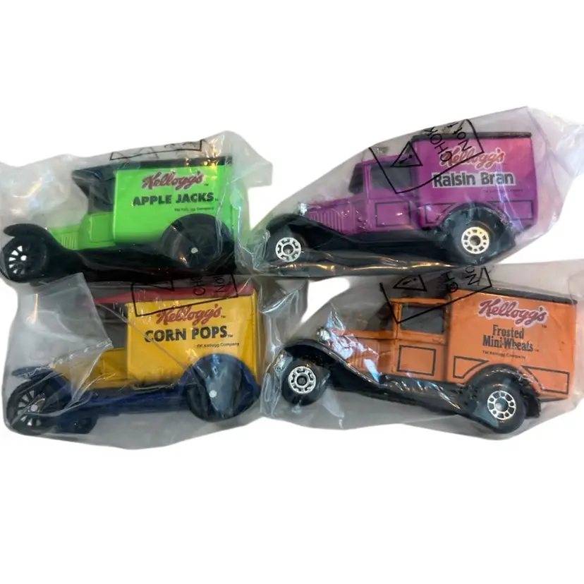 These cars were only available as a mail in promotion from Kellogg Company. I actually ordered these myself in the very early 1980’s, I still have the original mailing box. Set includes Raisin Bran, Frosted Mini-Wheats, Corn Pops and Apple Jacks. They are made to resemble Ford model A or T style vans.
