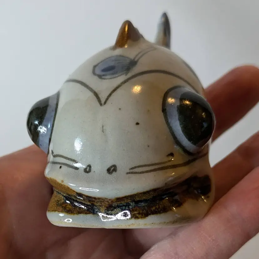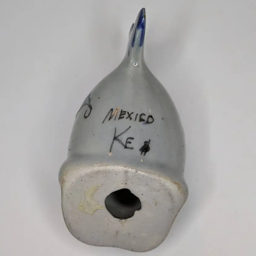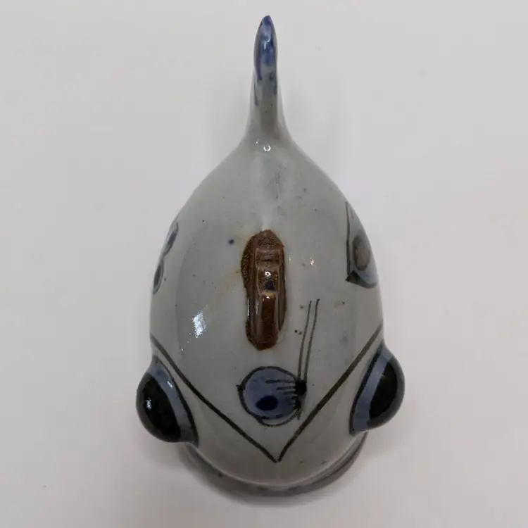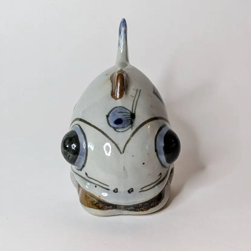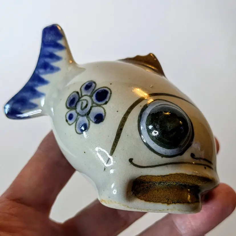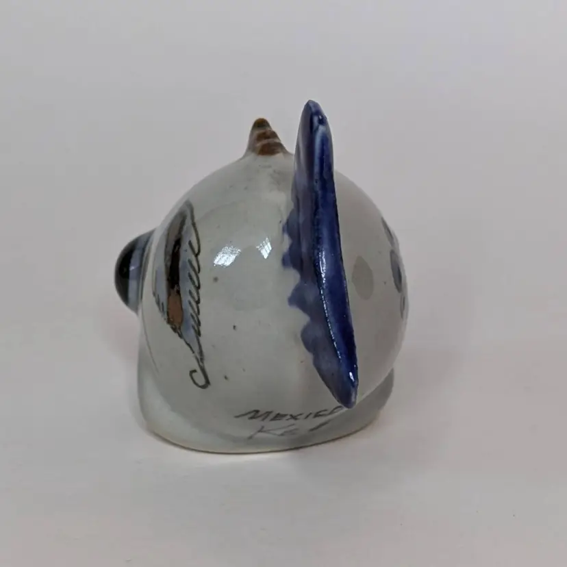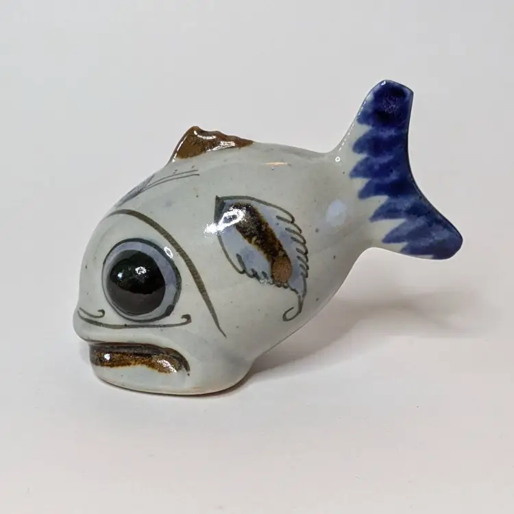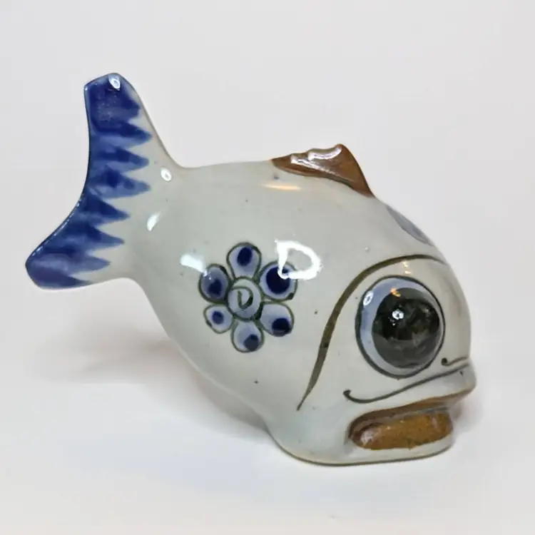 Unique little hand painted art pottery fish by renowned Tonala Artist Ken Edwards featuring an expressive face with large poppy eyes, beautiful flower and leaf design, and artist signature adding to the value! Highly collectable, this piece is in flawless vintage condition, very nice! Cute size at 3" tall to the tip of his tail, 4" long x 2" wide.