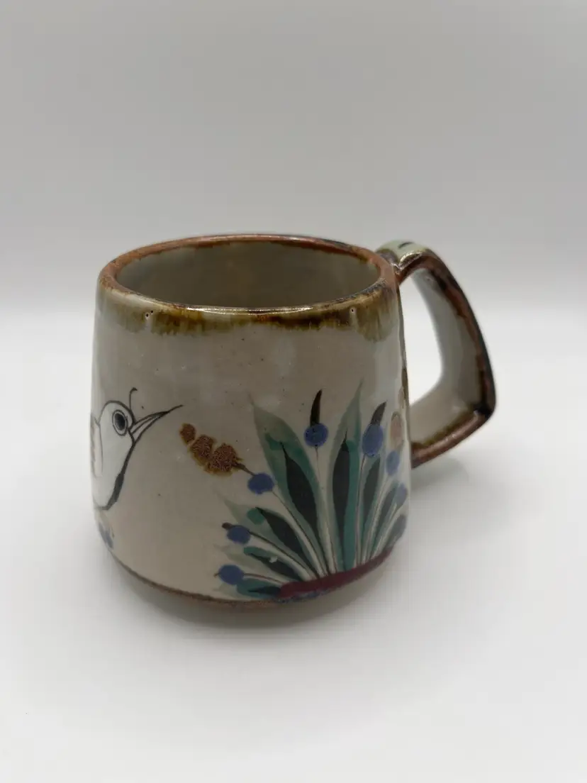 This is a beautiful Ken Edwards signed pottery mug. The hand painted design features a bird, a butterfly, and botanical design.