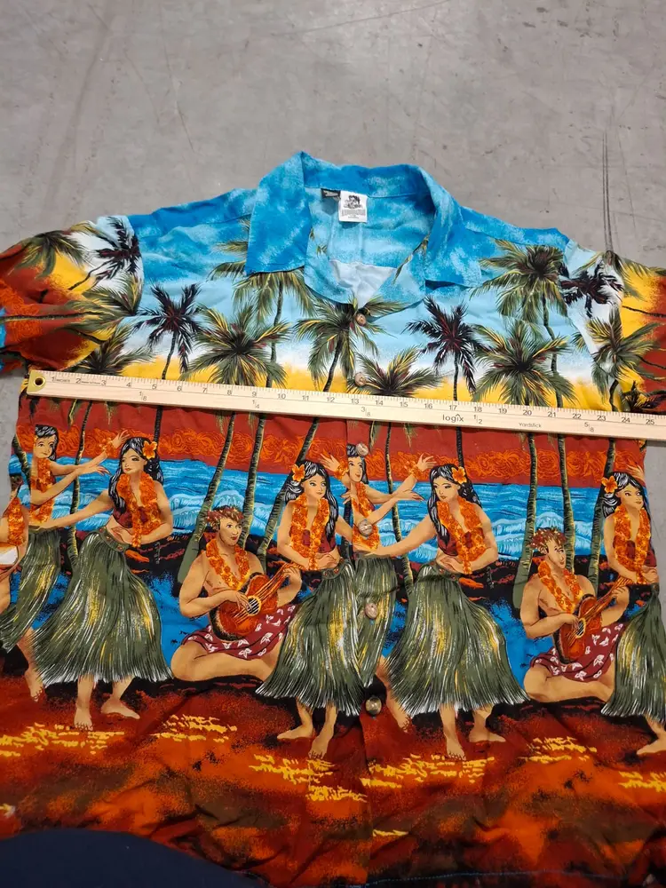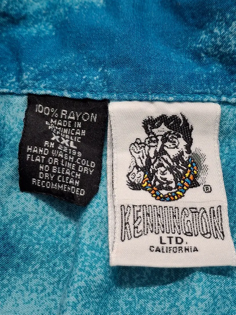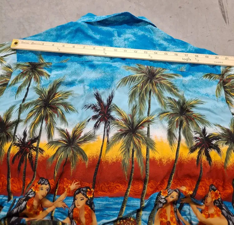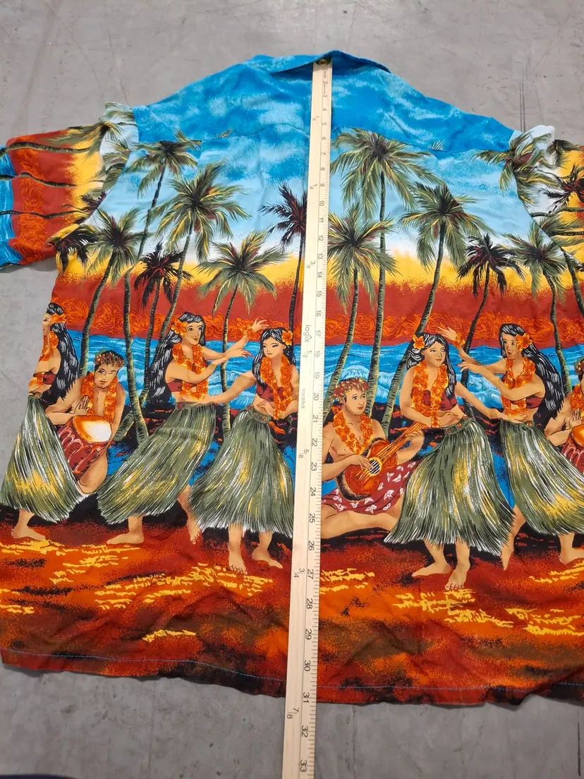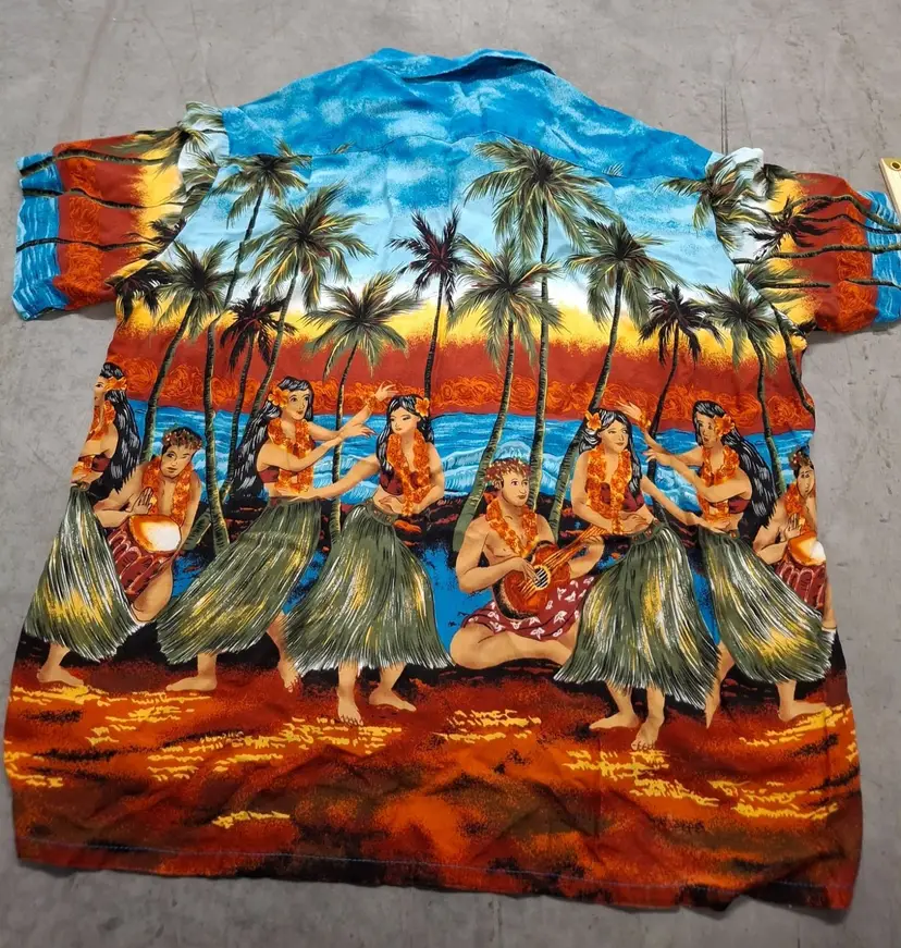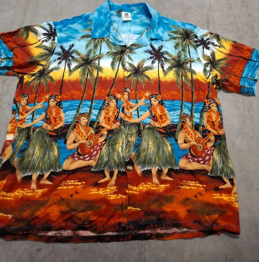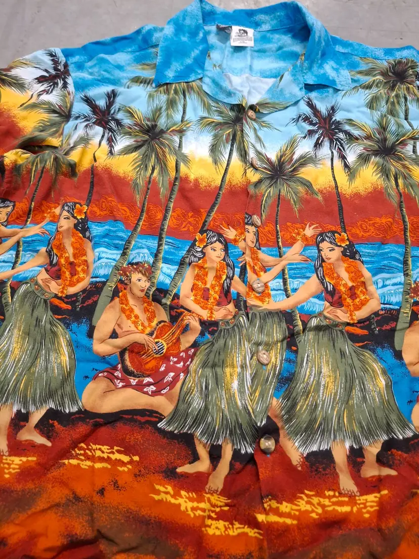 Transport yourself to a tropical paradise with this vintage Kennington Hawaiian shirt. Featuring vibrant hula dancers and swaying palms, it evokes the allure of sunlit beaches and island melodies. Made from soft rayon, this shirt blends comfort with the charm of retro island vibes.