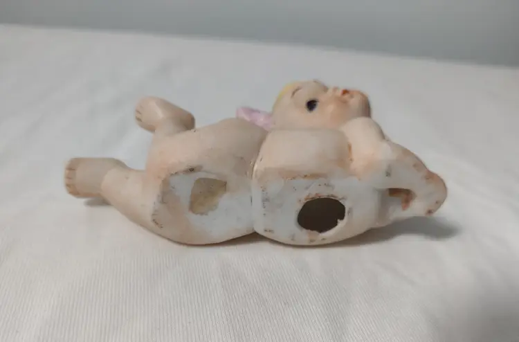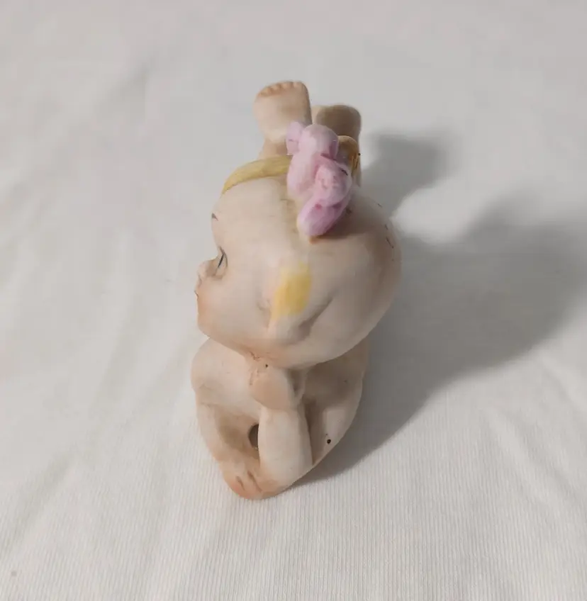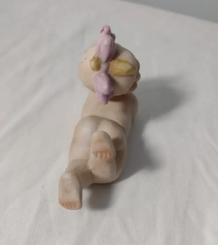 This is a sweet little baby girl figurine with her bum showing & a little pink bow in her hair. Girl measures 4" long x 2.5" tall x 1.5" wide.