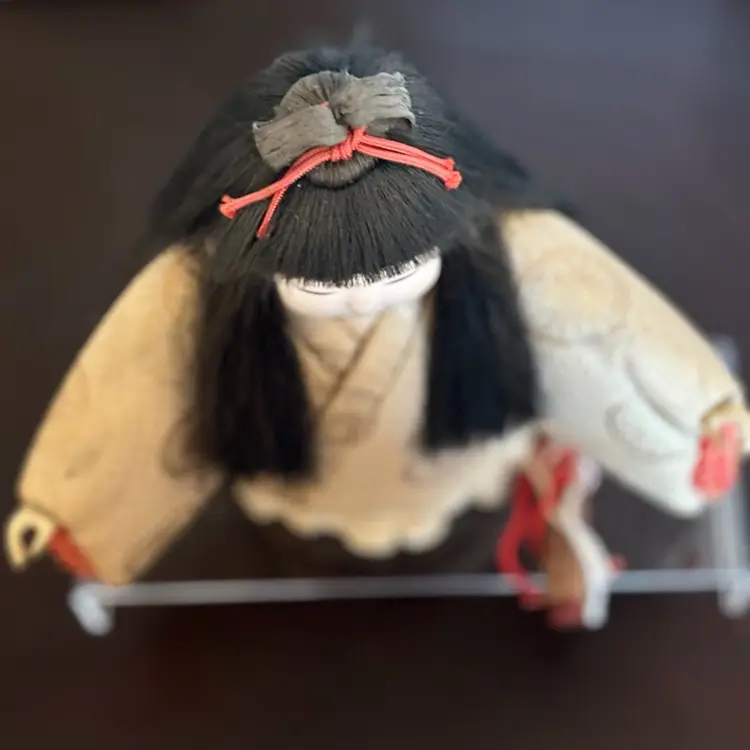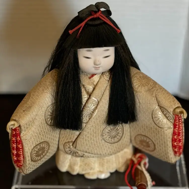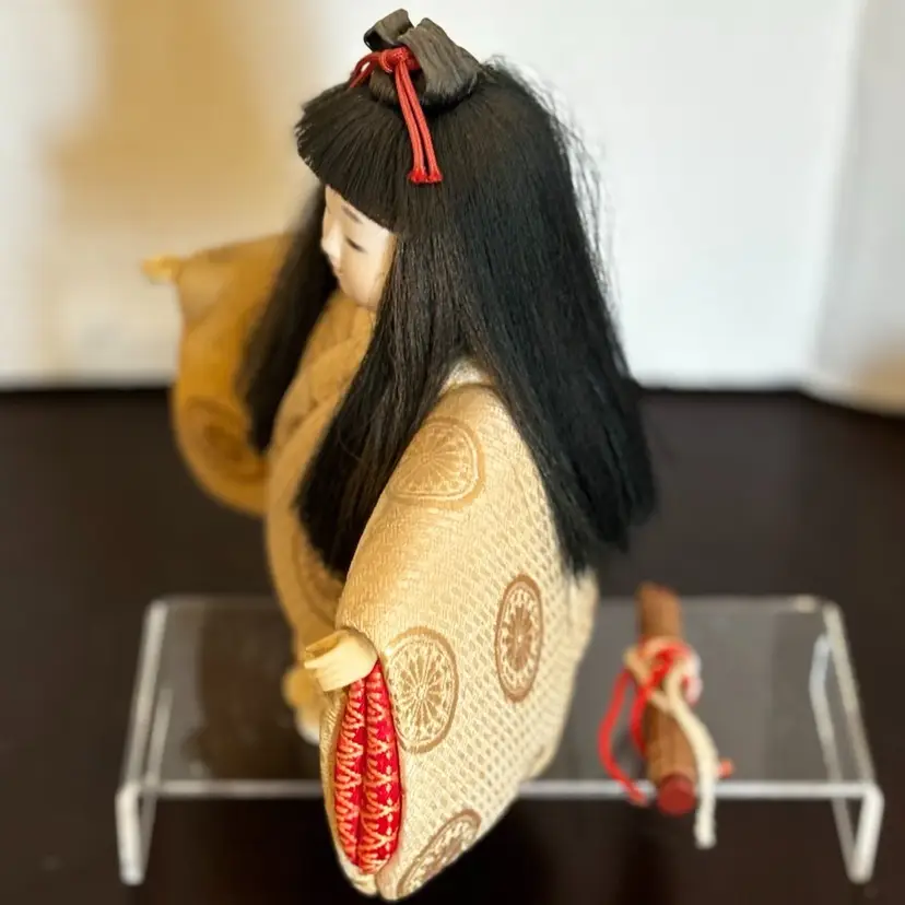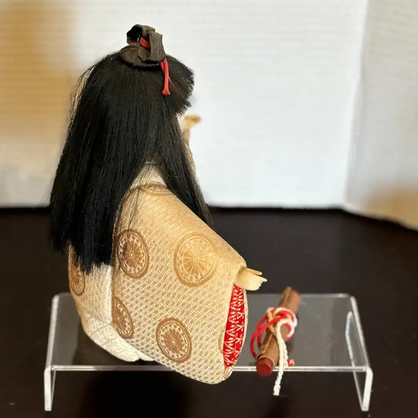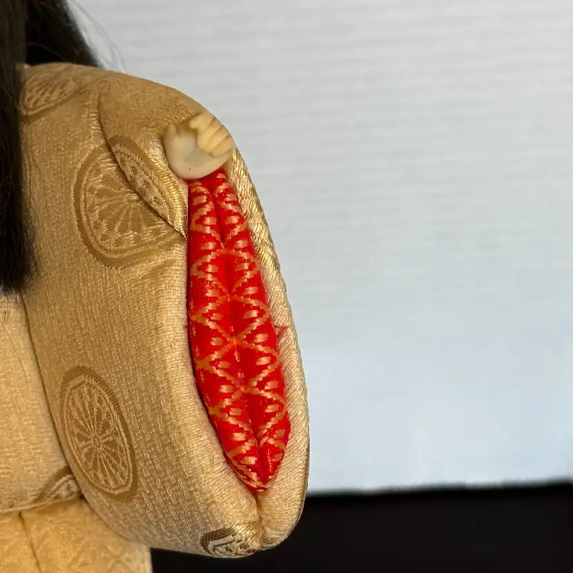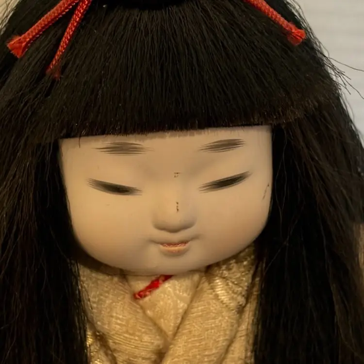 8.5” tall x 7.5 width. Beautiful gold and red kimono. Long hair with intact bun. Face ceramic.