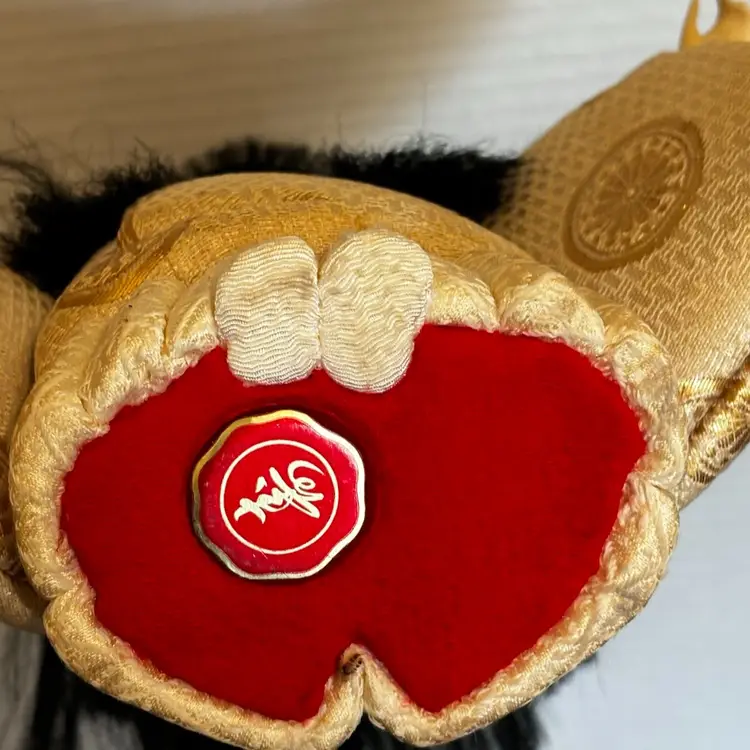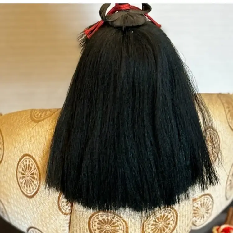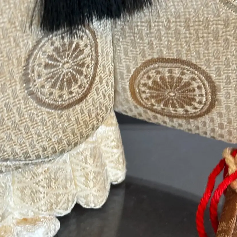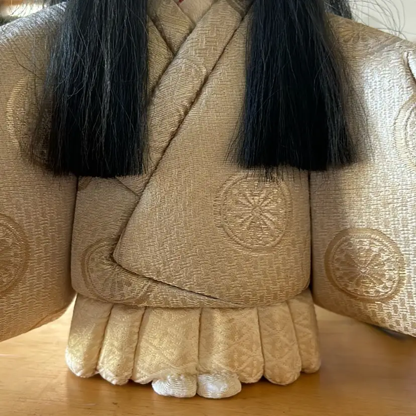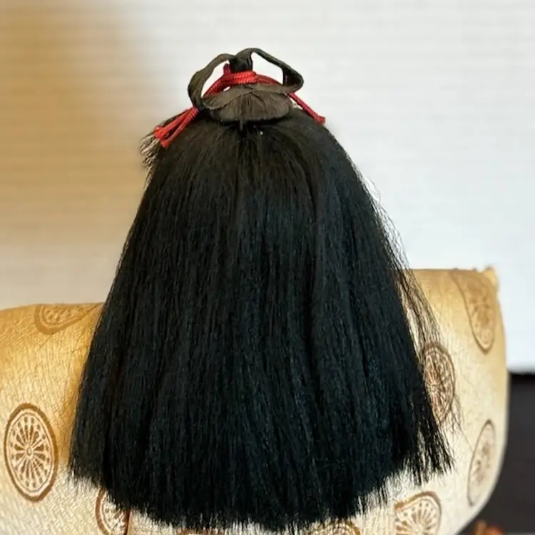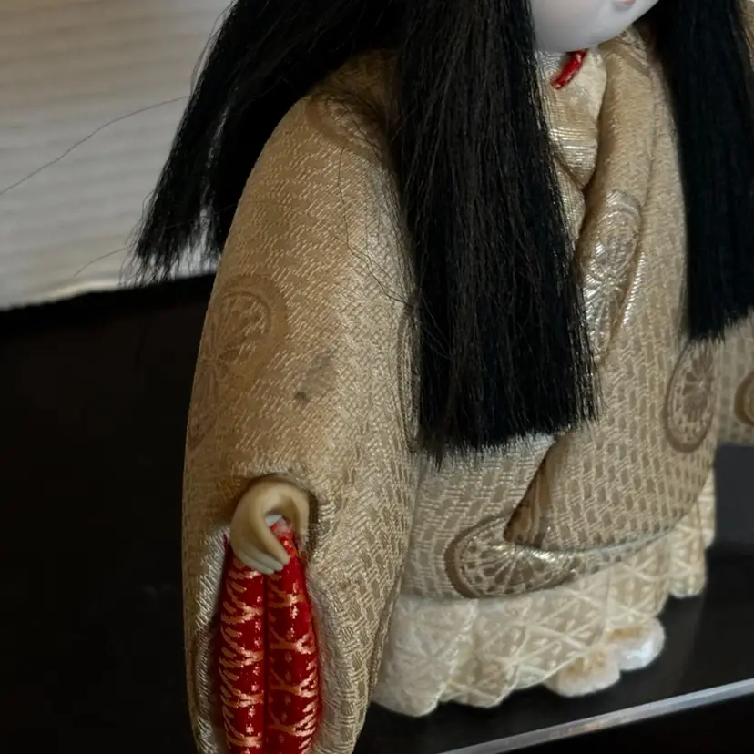 8.5” tall x 7.5 width. Beautiful gold and red kimono. Long hair with intact bun. Face ceramic.