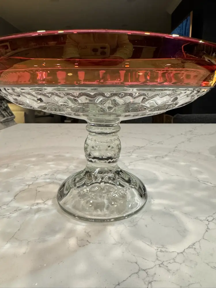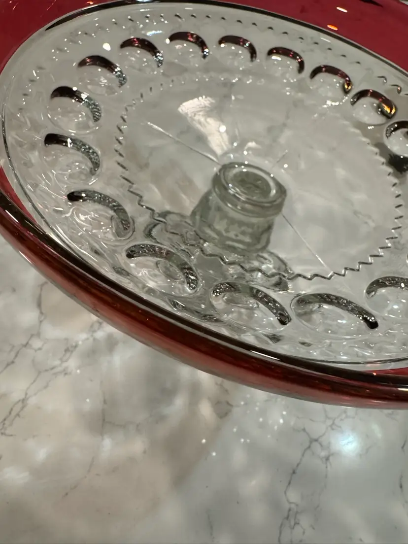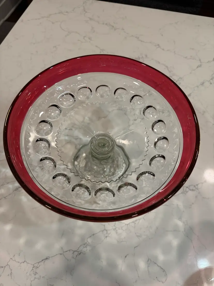 This stunning vintage compote features a vibrant ruby red rim and intricate clear glass base. Perfect for adding a pop of color to your table or displaying your favorite treats.