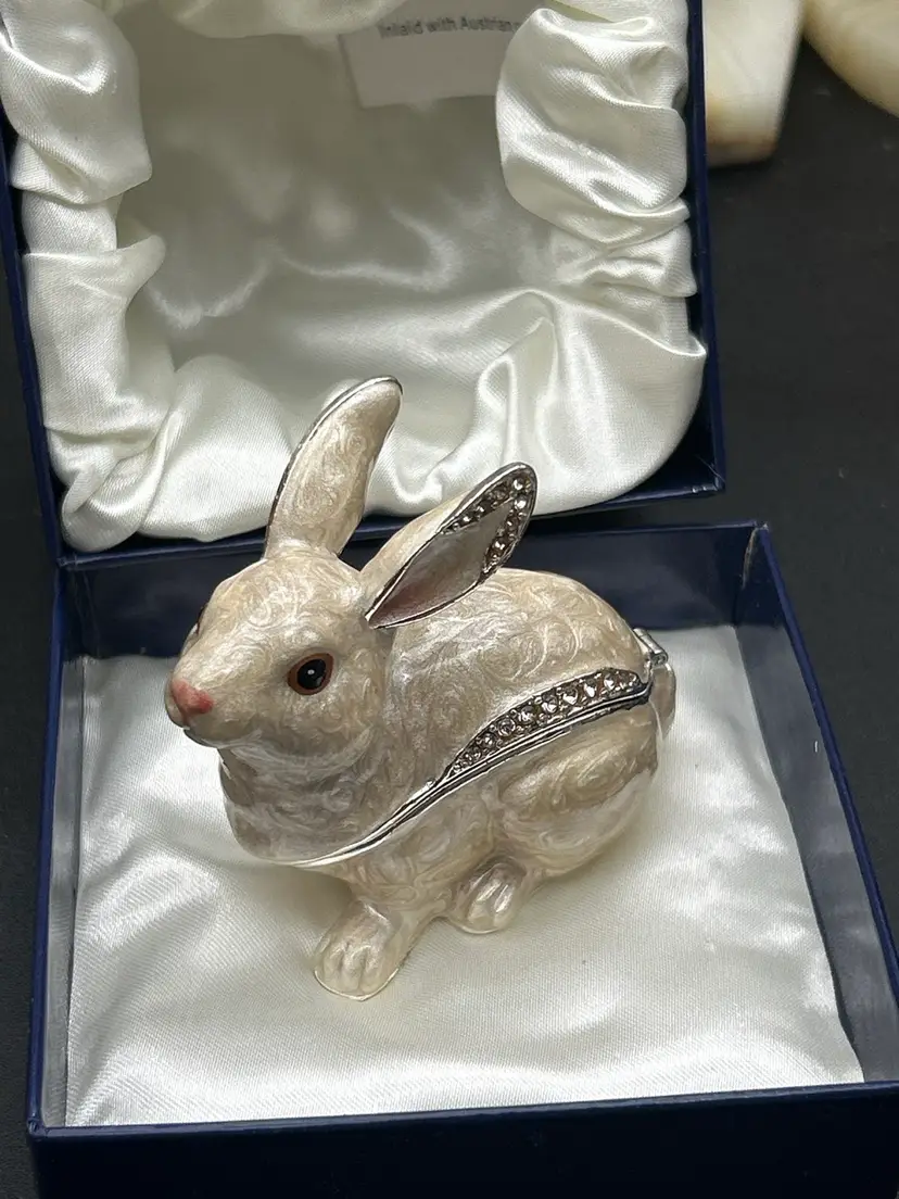 This charming Kingspoint Designs trinket box features a beautifully hand-enameled rabbit, detailed with lifelike textured fur and delicate jeweled accents. The hinged design opens to reveal a hidden compartment, perfect for holding small keepsakes, jewelry, or a surprise gift. Adorned with sparkling Swarovski crystals and finished with a glossy enamel sheen, this collectible piece comes in its original satin-lined presentation box, making it an elegant gift or display item.