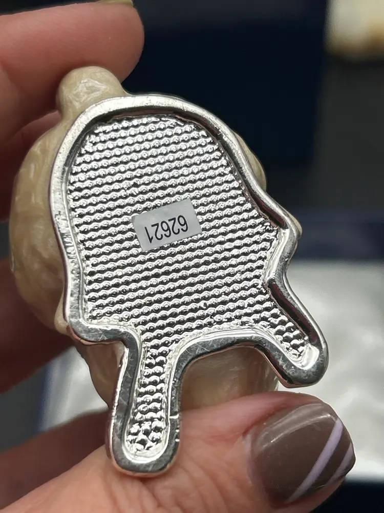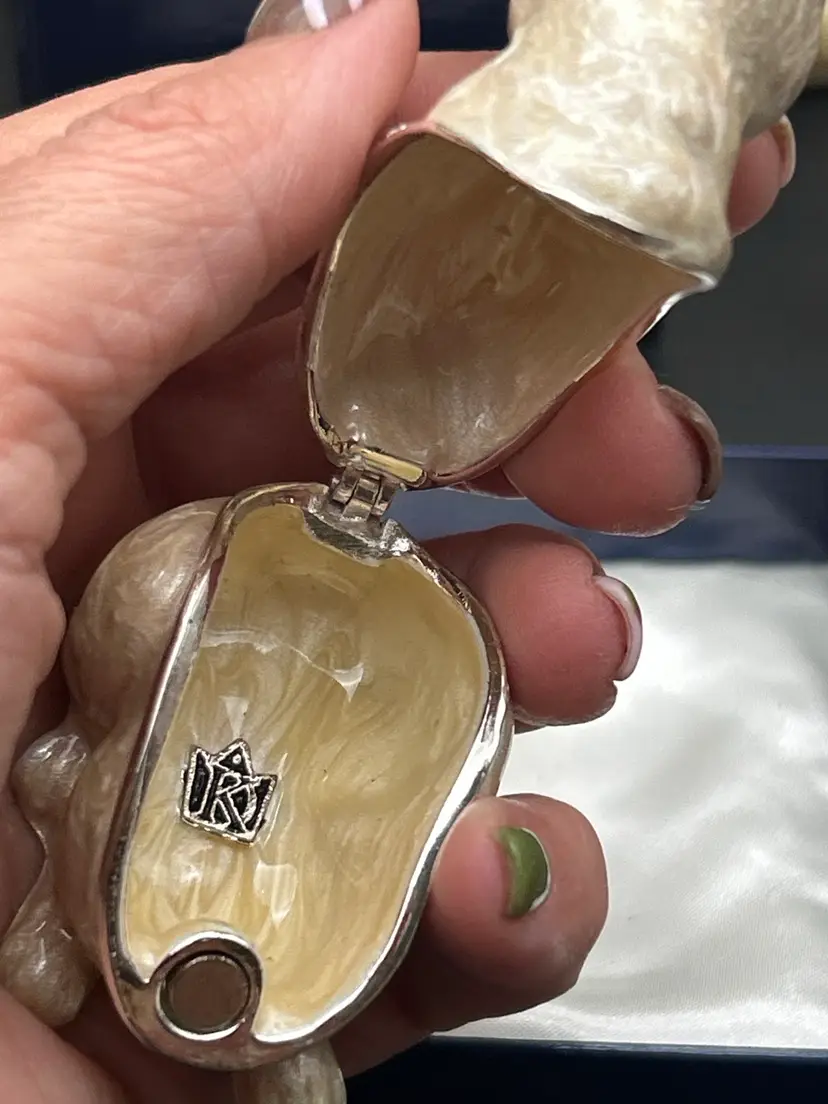 Details: • Approx. size: 2.5” tall x 2.75” long • Color: Cream/ivory enamel with silver tone trim and crystal accents • Condition: Excellent, appears unused, with box and satin lining