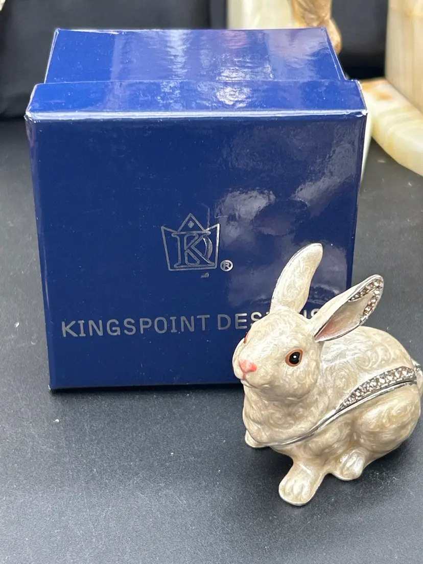 Notable Details: • Maker: Kingspoint Designs • Material: Hand-enameled metal alloy with Swarovski crystal accents • Hinged trinket box with magnetic closure • Rabbit design with naturalistic detailing • Original presentation box included • Maker’s mark inside lid (Kingspoint crown “K”) • Collectible and gift-ready