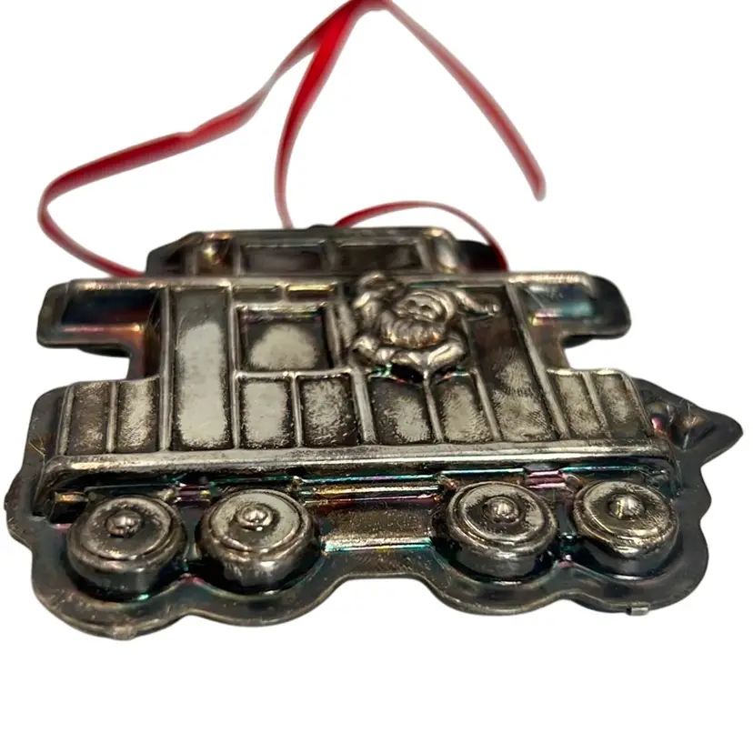 Santa is waving to the crowds from his window of the trolley car or train car. A reindeer (Rudolph?) waves from the opposite side!