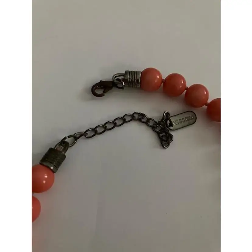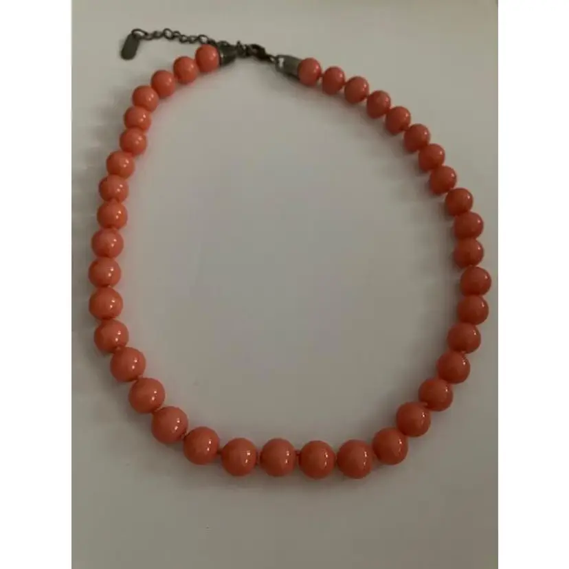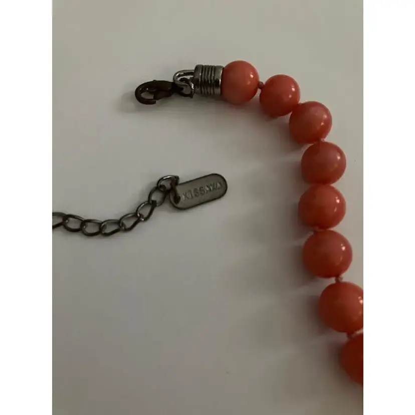 Vintage hand knotted Japanese coral beaded necklace. Measures 16 " long plus a 3" extender. 8 1/4 " hang length (plus 3" extender. Weighs 56.79 grams or 2 ounces. Lobster claw clasp. Hardware has some tarnishing. Lovely old piece. Has the Kissaka hang tag.