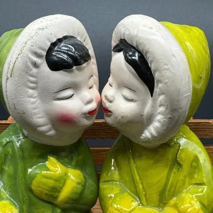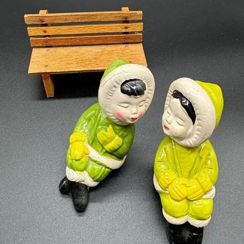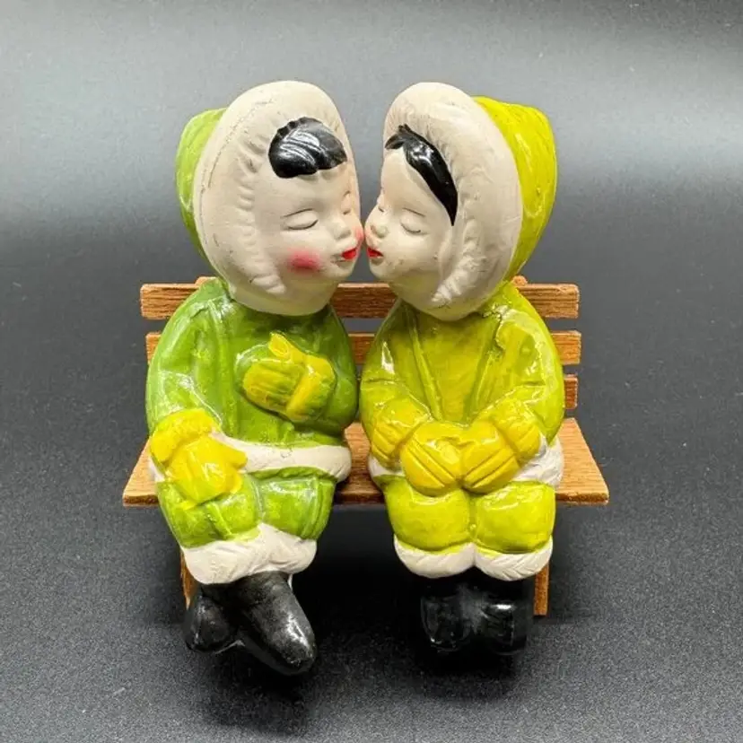 Vintage Kissing Inuit Salt and Pepper Shakers Ceramic Sitting on a Bench 134 grams Measuring about 4.5 inches high