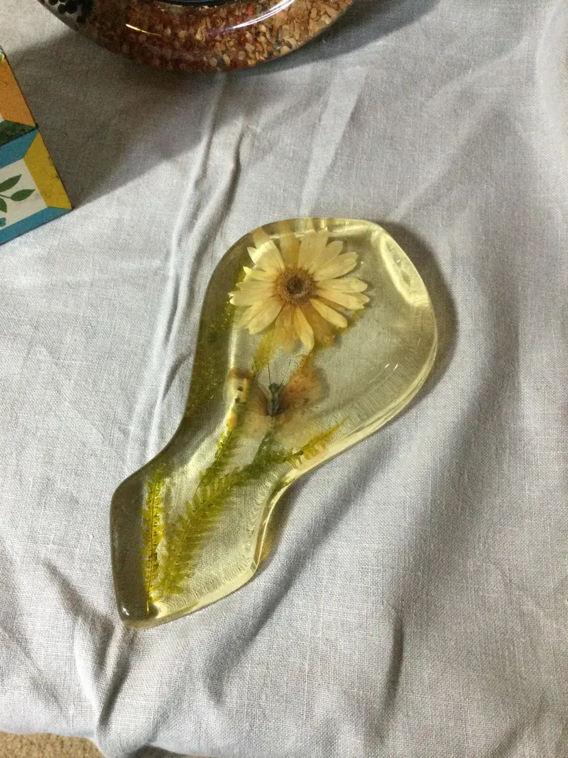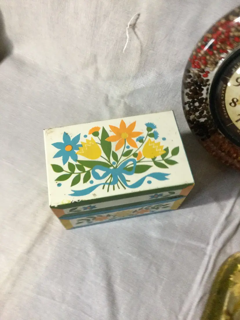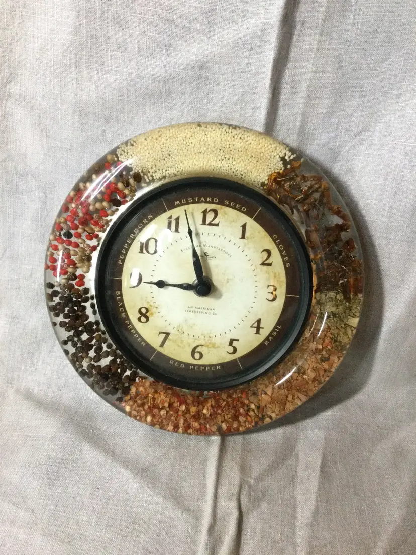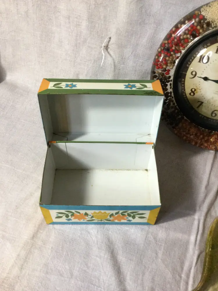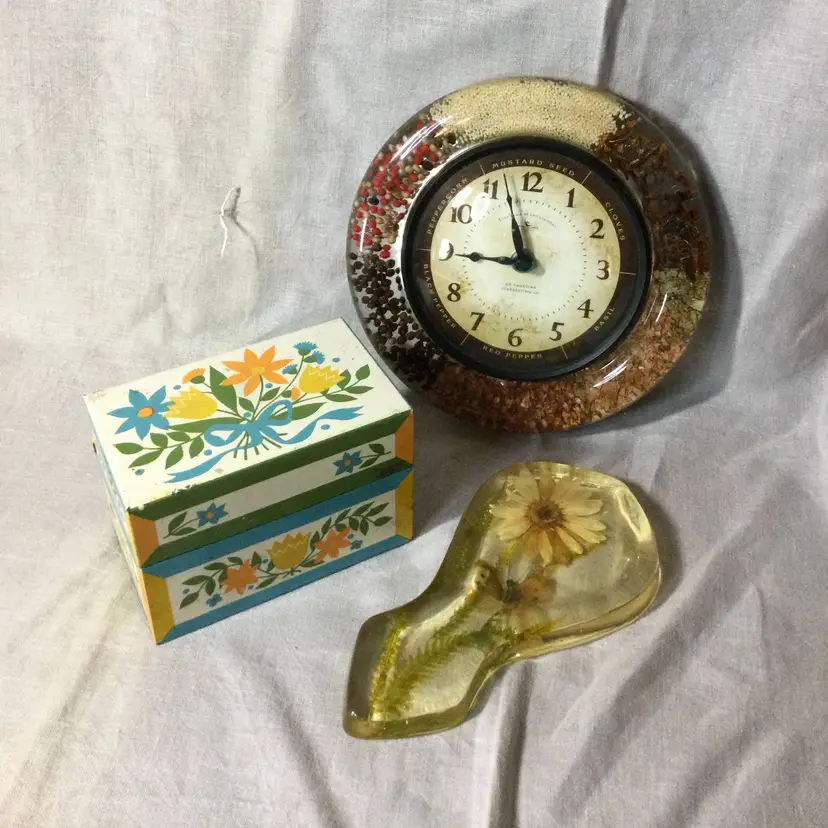 The perfect additions to your vintage kitchen! A lucite clock full of spices, a lucite spoon rest with preserved flower and moth, and a tin recipe box. These items are in good vintage condition with a nick in the spoon rest over the moth wing and some age-related wear on the recipe box.