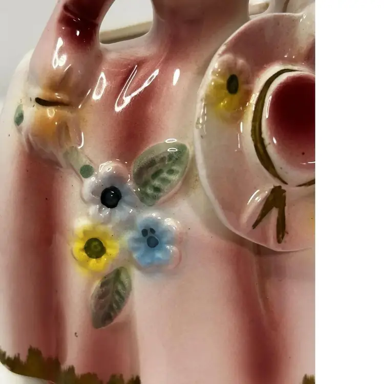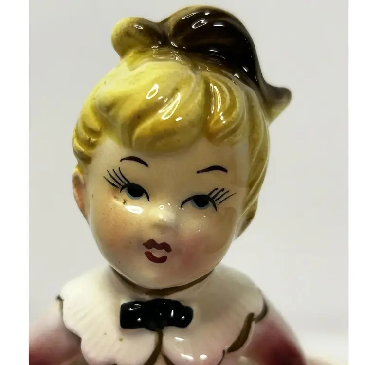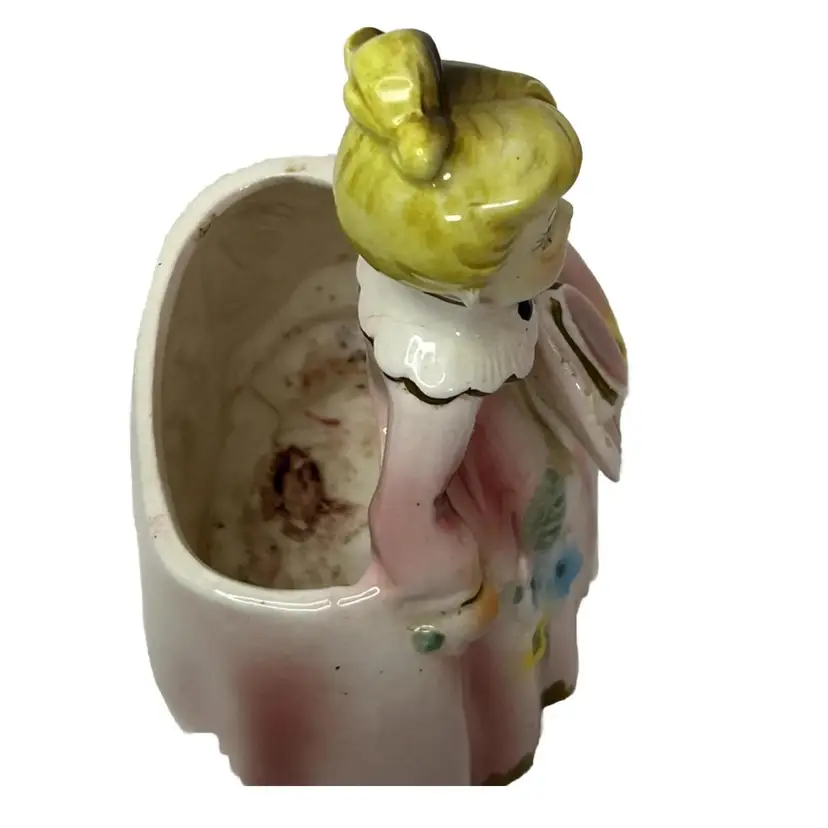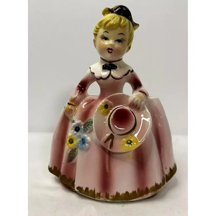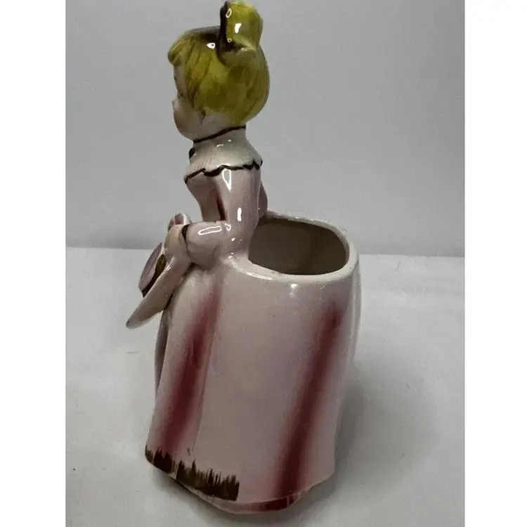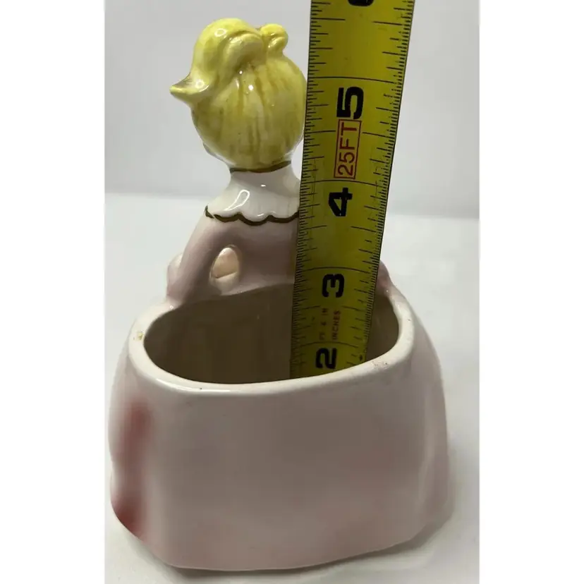 Add a touch of vintage charm to your home decor with this delightful ceramic planter. This adorable planter features a sweet young girl in a pink dress and brim hat. The glossy finish gives it a shiny look that will brighten any spot where she is displayed. From a counter, shelf or bookcase. She will also look delightful on a dresser or vanity holding your makeup brushes or makeup pencils. This Kitsch planter is perfect for natural or faux plants or succulents. Its midcentury style makes it a unique addition to any collection. This sweet little lady measures 5.75" inches tall and is about 4.5" inches wide. Don't miss out on the opportunity to own this original piece from the 1960s. The planter does show crazing and has two small flea bites, one on the edge of her brim hat and one on the bottom rim of her dress both of which are not noticeable but they can be felt when you run your fingers on those edges. Please review all pictures for proper assessment of its vintage preowned condition.