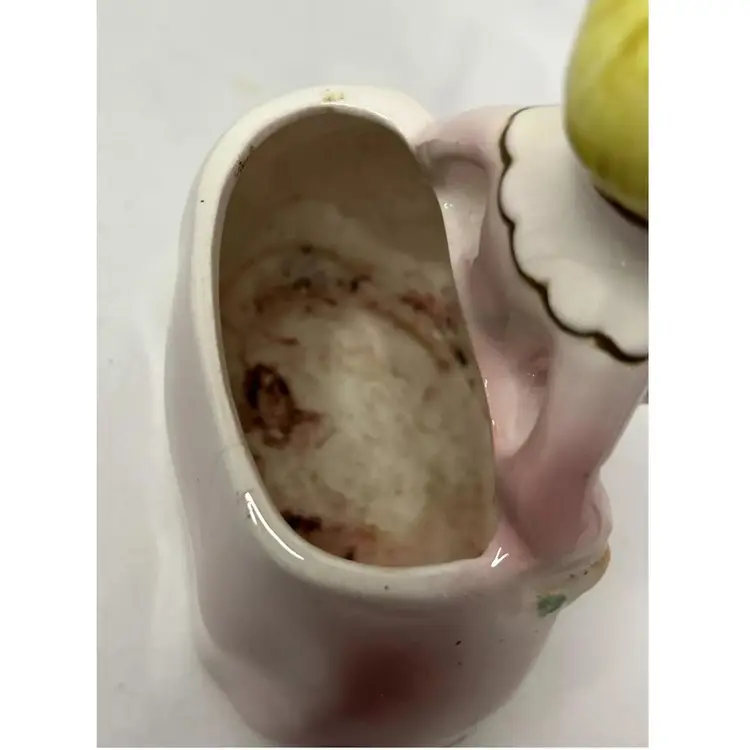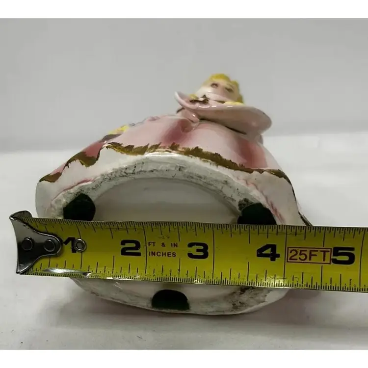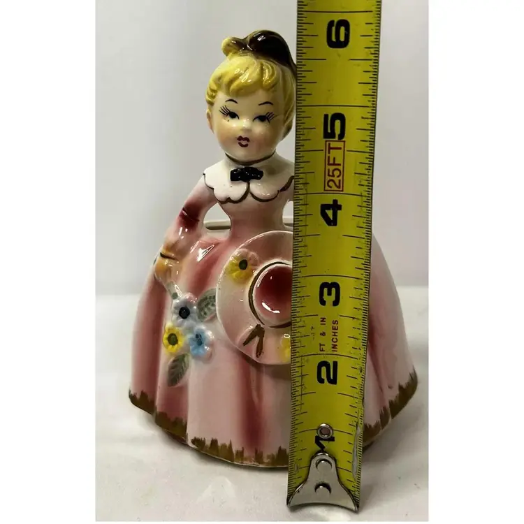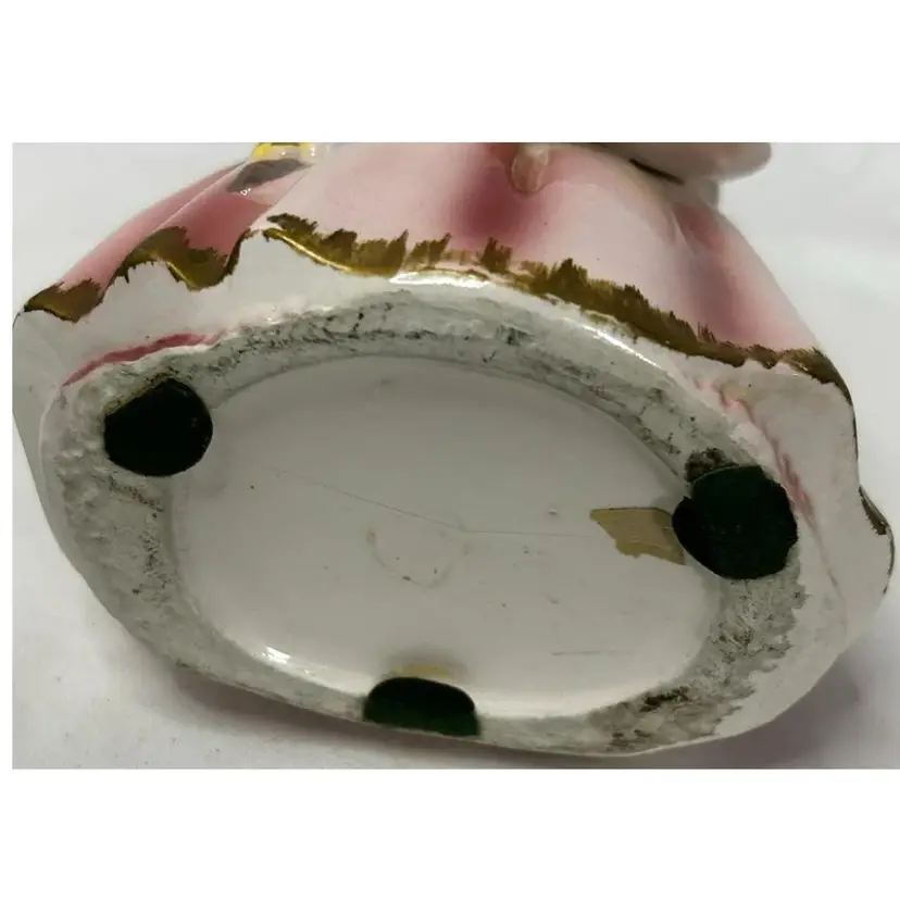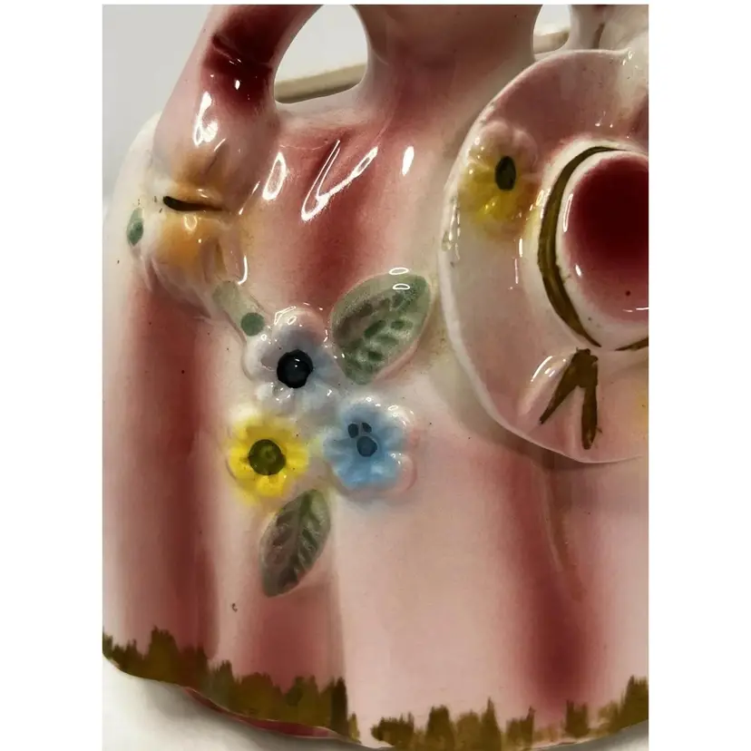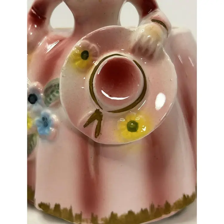 Add a touch of vintage charm to your home decor with this delightful ceramic planter. This adorable planter features a sweet young girl in a pink dress and brim hat. The glossy finish gives it a shiny look that will brighten any spot where she is displayed. From a counter, shelf or bookcase. She will also look delightful on a dresser or vanity holding your makeup brushes or makeup pencils. This Kitsch planter is perfect for natural or faux plants or succulents. Its midcentury style makes it a unique addition to any collection. This sweet little lady measures 5.75" inches tall and is about 4.5" inches wide. Don't miss out on the opportunity to own this original piece from the 1960s. The planter does show crazing and has two small flea bites, one on the edge of her brim hat and one on the bottom rim of her dress both of which are not noticeable but they can be felt when you run your fingers on those edges. Please review all pictures for proper assessment of its vintage preowned condition.
