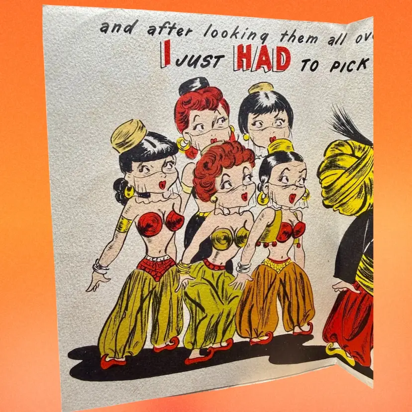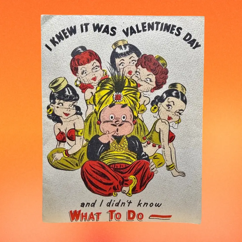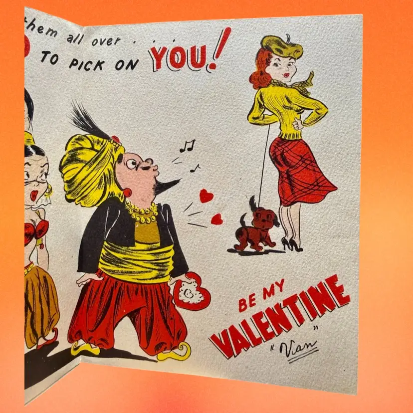 4.25”x5.5”. Vintage valentine greeting card, by Novo Laughs, signed “Van” on the inside. Has some very minor wear due to age, mainly just dents or winkles in the paper.