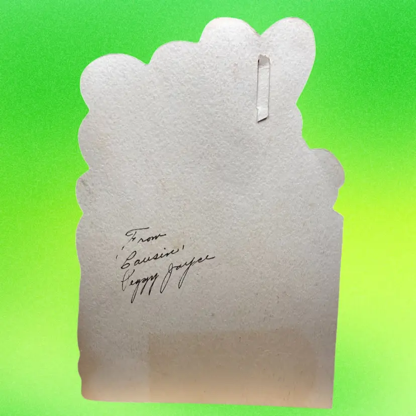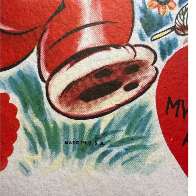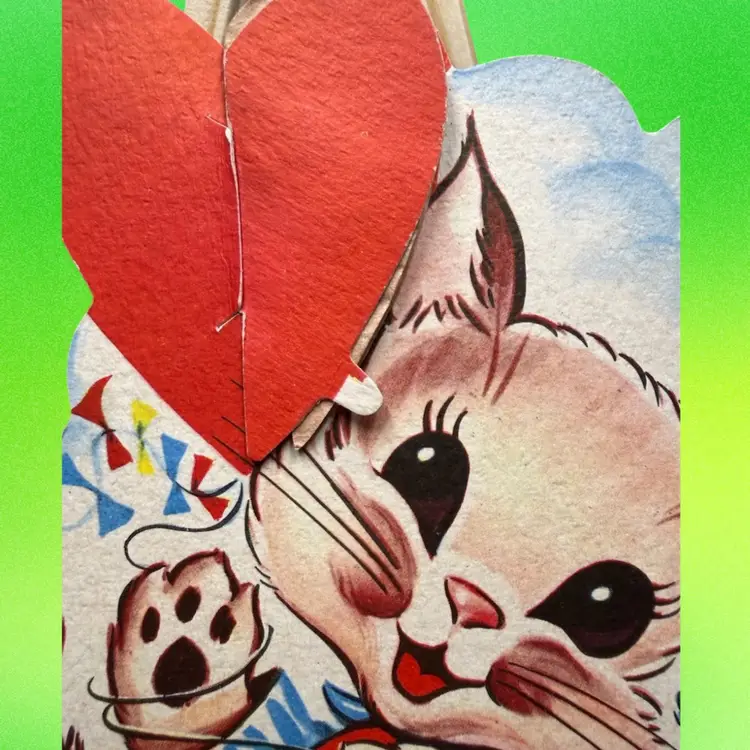 5.25”x8”. Large vintage valentine greeting card, signed on the backside. Features a precious anthropomorphic cat flying a heart shaped kite, which opens to reveal honeycomb paper. Tab on heart is still in tact and honeycomb is in good condition.