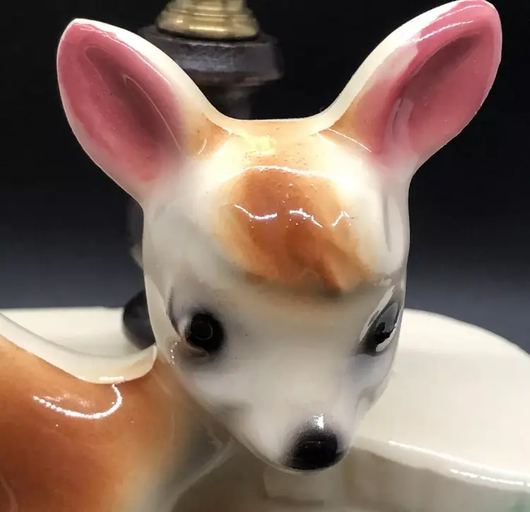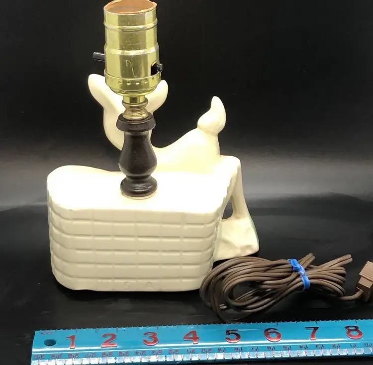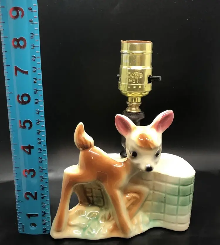 Illuminate your space with this charming lamp featuring a beloved Disney character. Crafted in ceramic with a glazed finish, this vintage mid-century Bambi deer fawn lamp showcases a multicolor design that will add a retro touch to any room. Measuring in length 7.25”and 6" in width, this lamp is perfect for all occasions and can be used in any room. It has it’s original cord. My be used or replaced. It works just fine!
