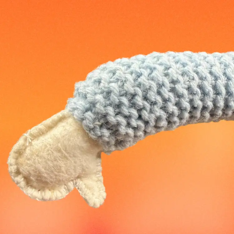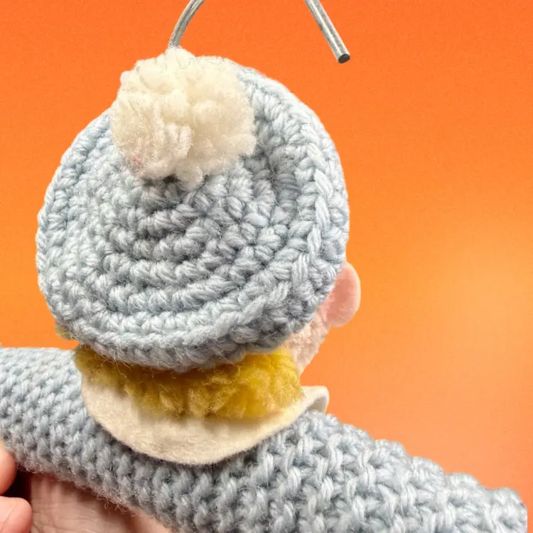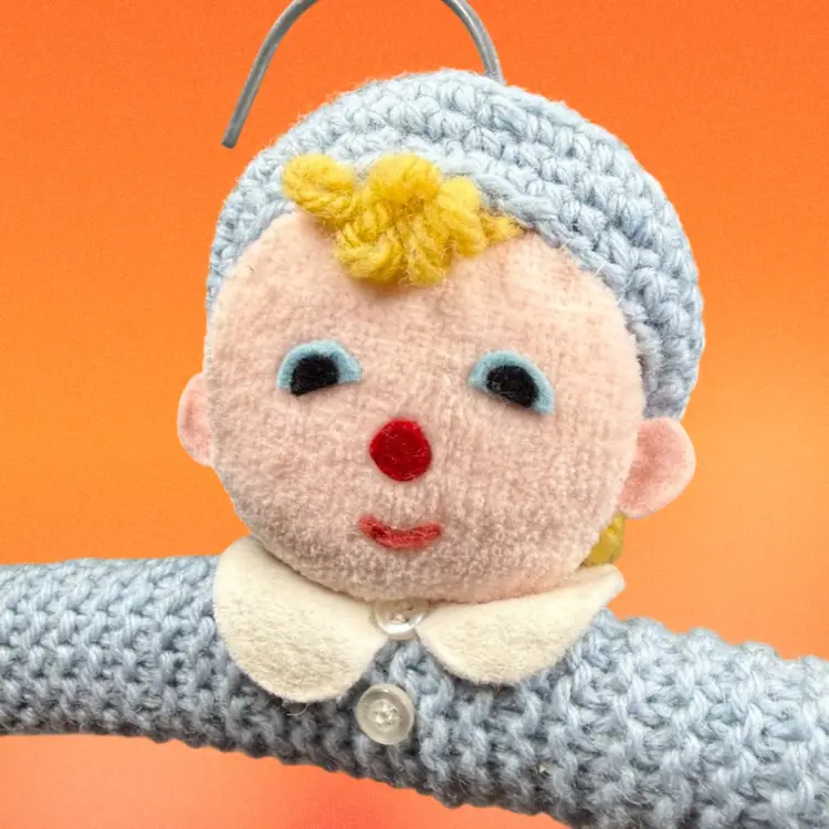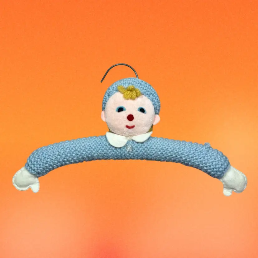 Approx 6”x10”. Metal wire hanger wrapped with a yarn/felt boy figure. His “shirt” (the hanger) is a light blue color. The child has blue eyes & blonde hair peeking out under his hat. An adorable kitschy hanger to add to your child’s wardrobe!