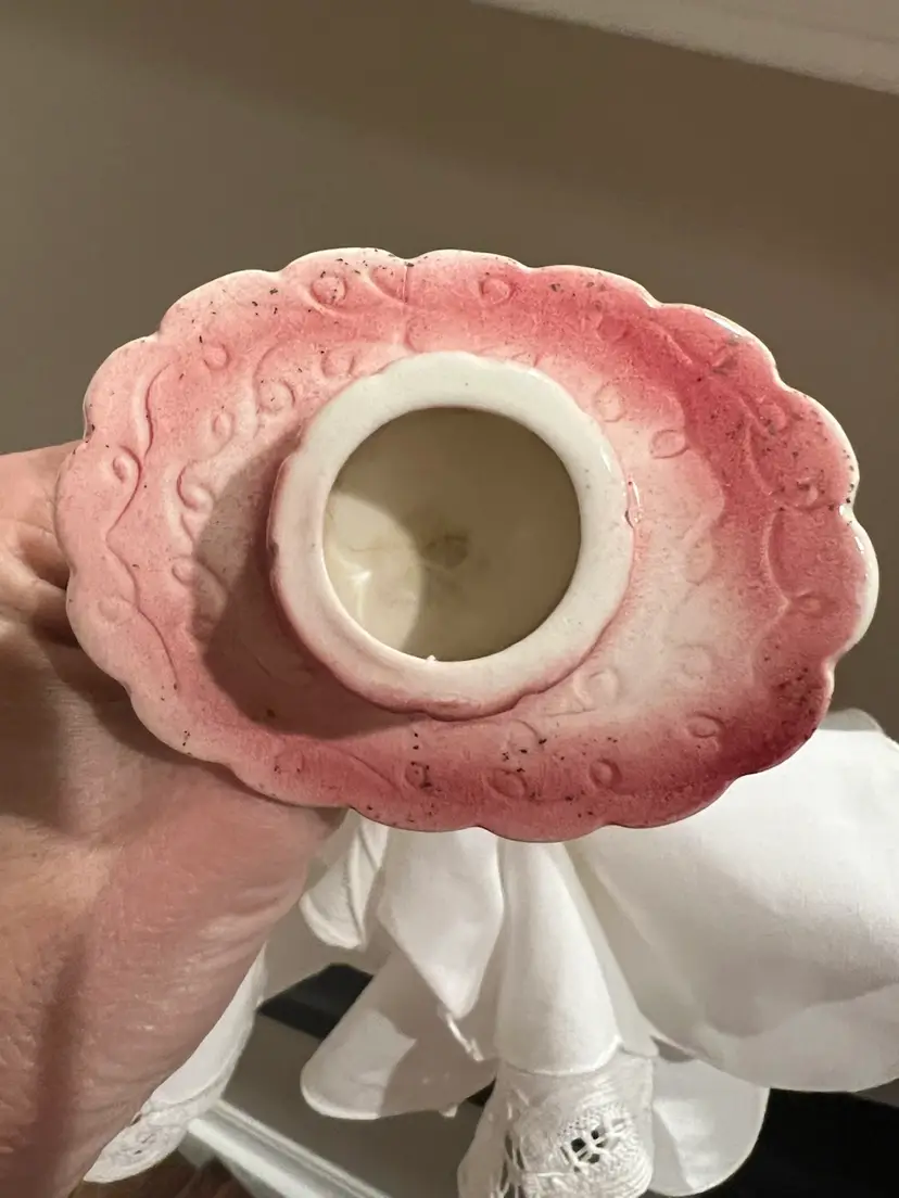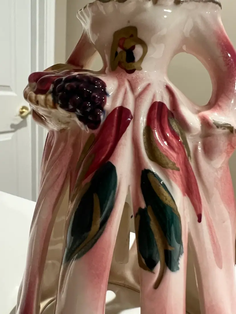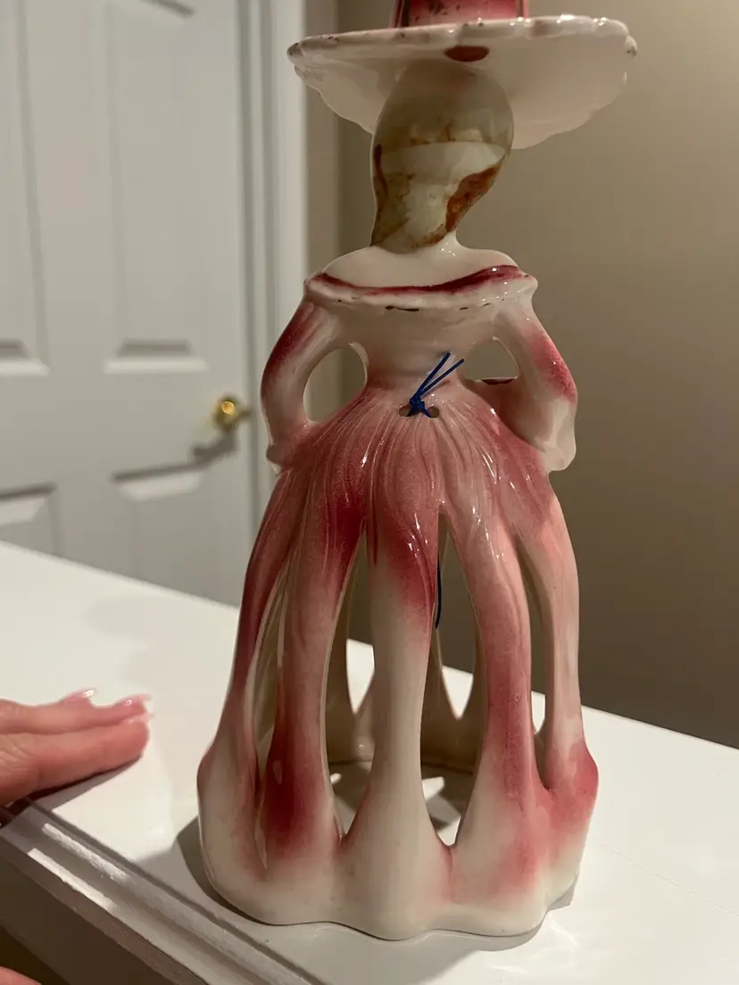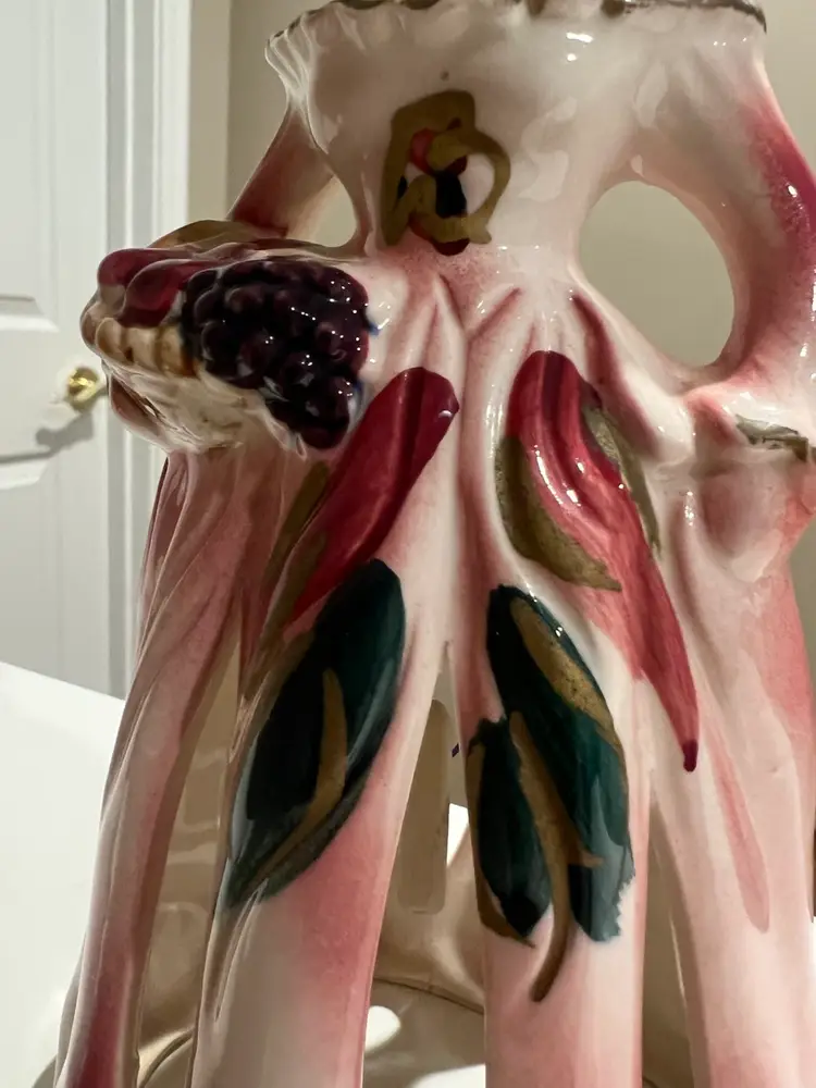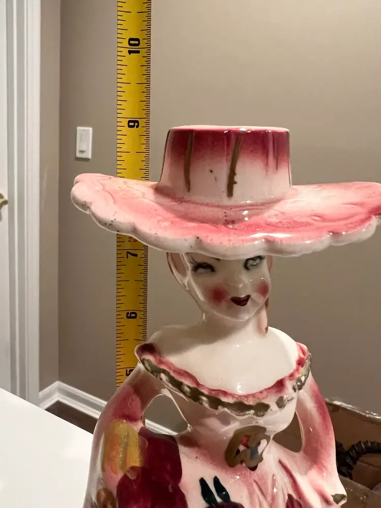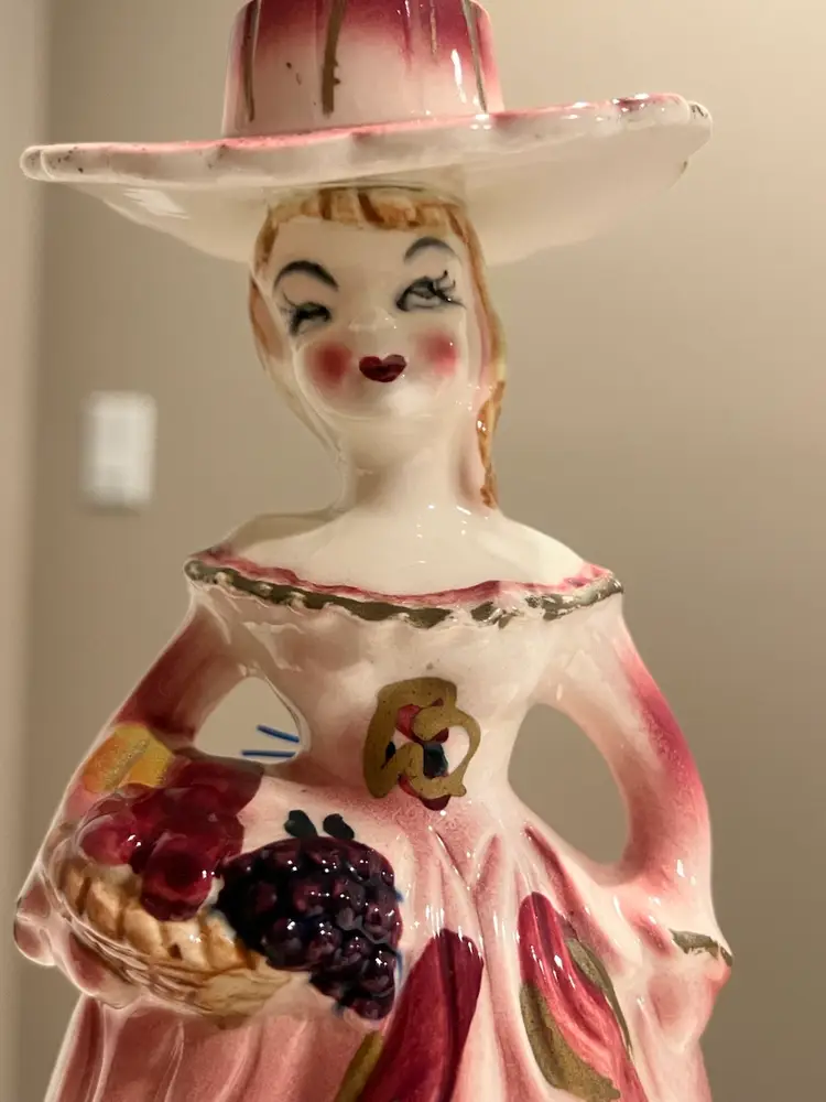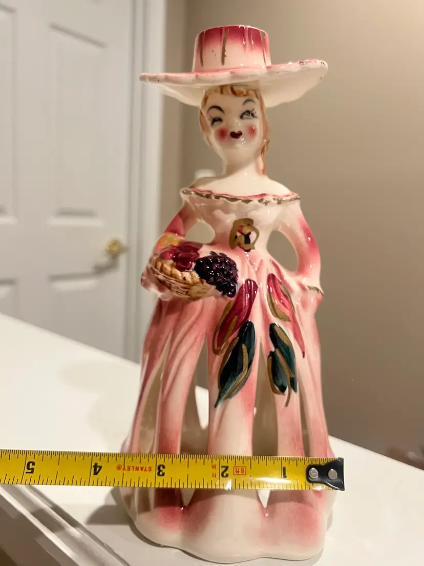 Beautiful pink lady with no chips or cracks. She looks beautiful for her age. Original Japan sticker in place. The napkins are for display purposes only so you may imagine her with a beautifully full skirt. She stands just under 9 inches tall.