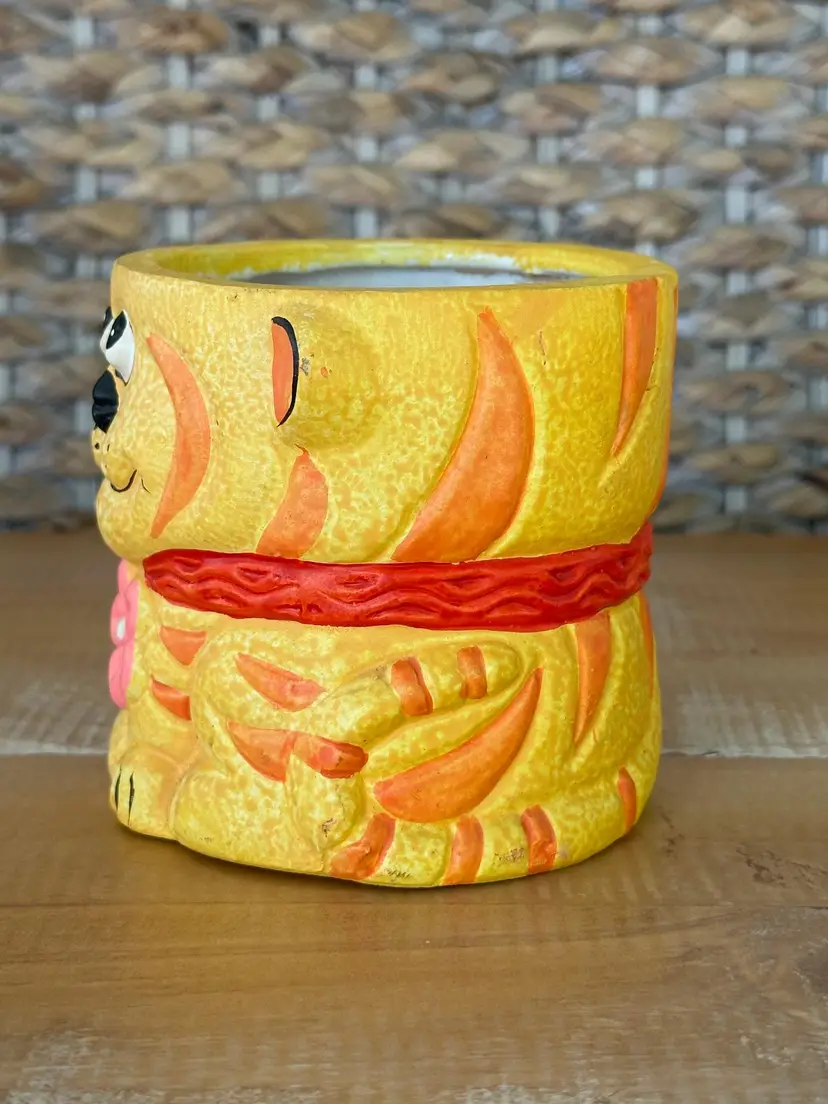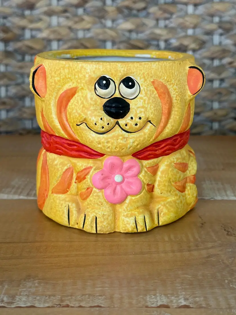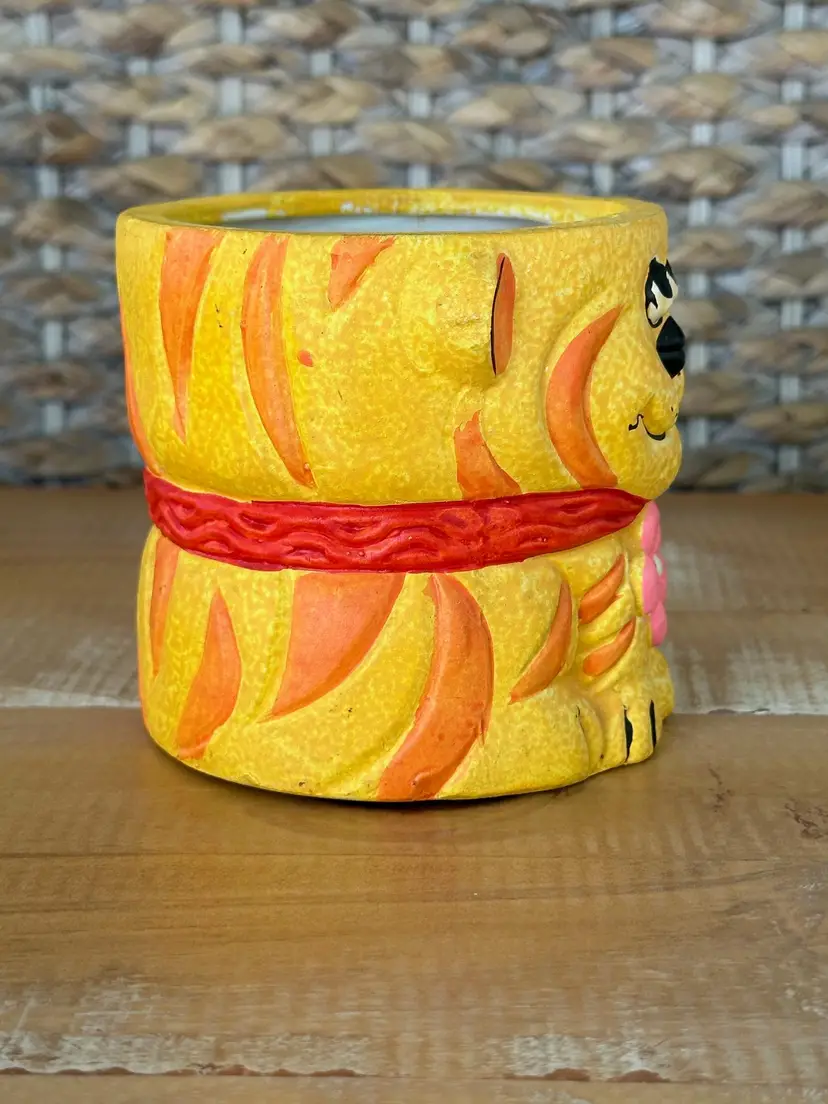 Brighten up your space with this charming ceramic tiger planter. Featuring a cute tiger design with a pink flower, it's perfect for small plants or succulents. A delightful addition to any home decor. W: 4" H: 3.75"
