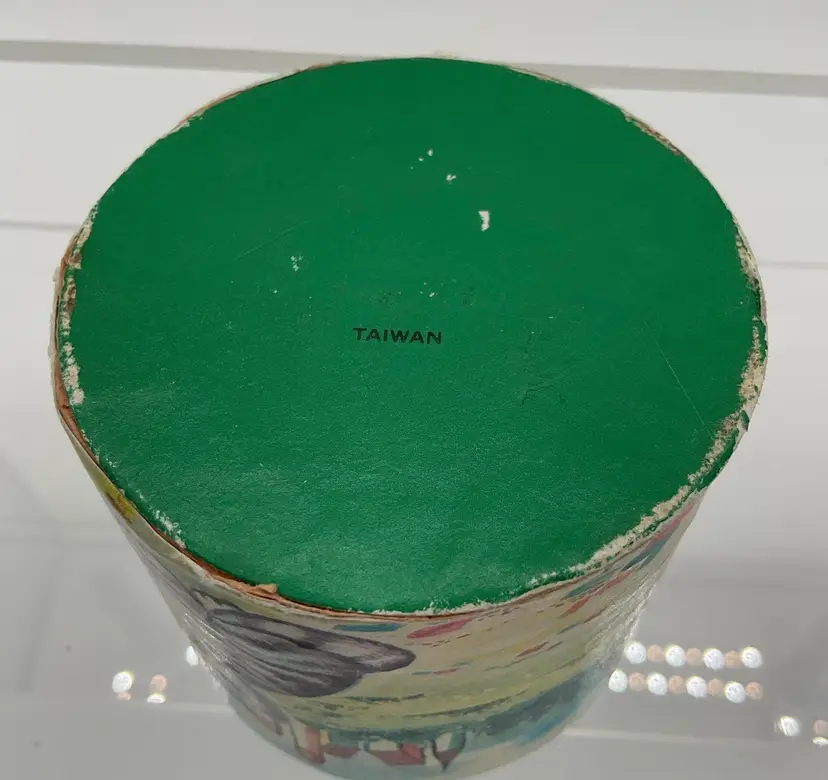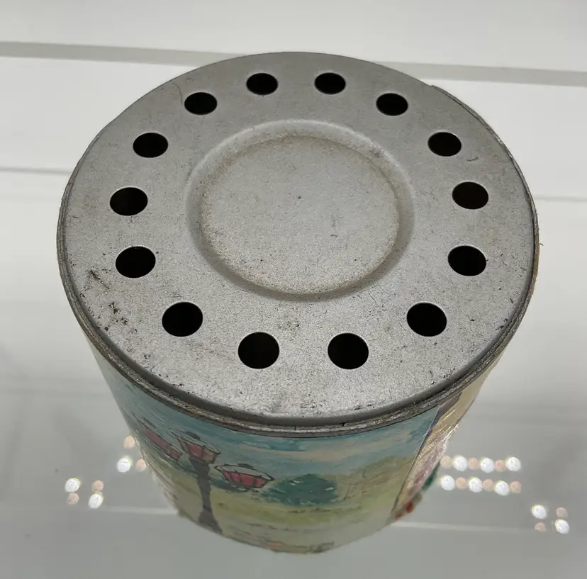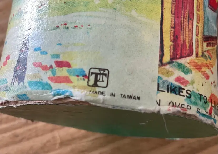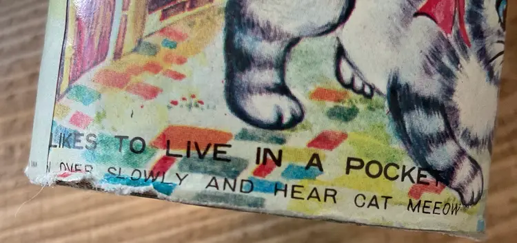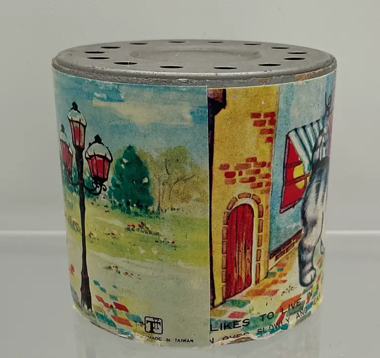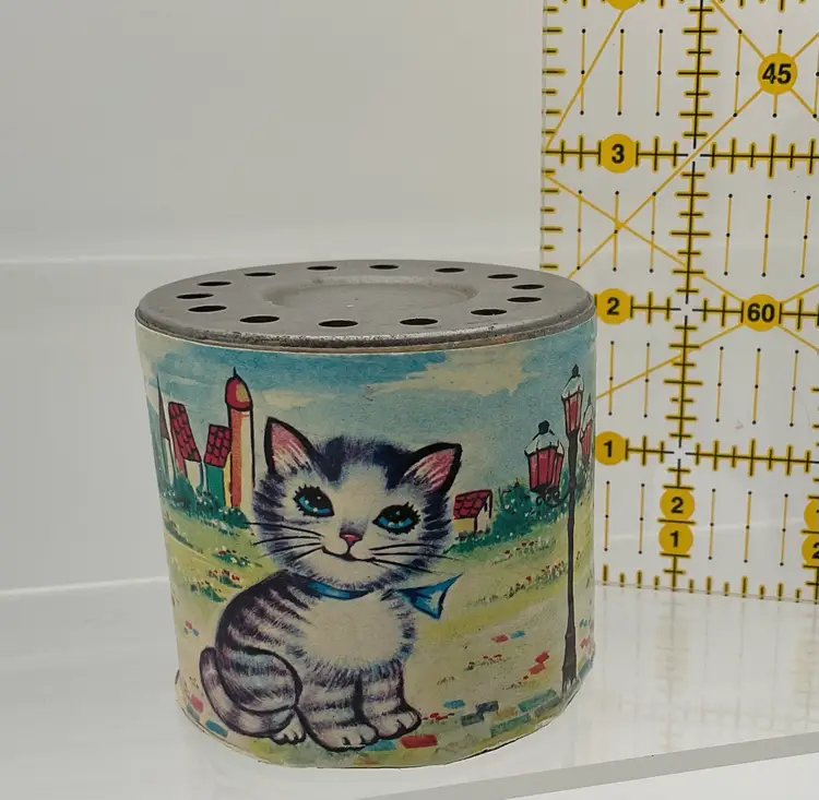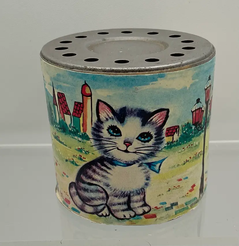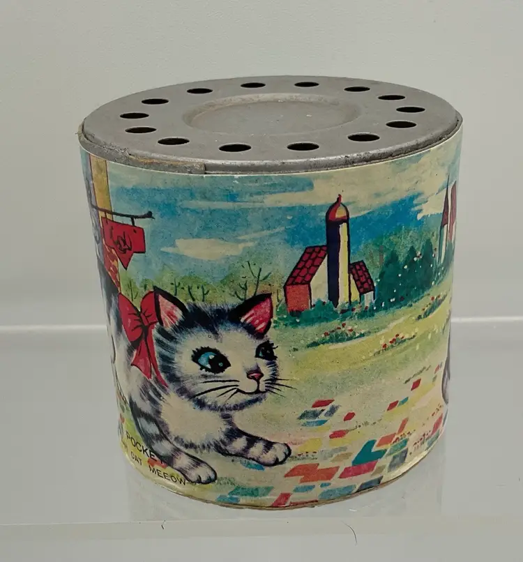 2 1/4”H x 2 1/2”D sound box with a kitschy cat theme. Paper label has some wear along bottom edge but otherwise nice colorful graphics. Metal top. Makes the sound effect after the can is flipped upright after turning upside down. Marked Taiwan. Hard to find! Guessing 1950’s based on graphics and metal design.