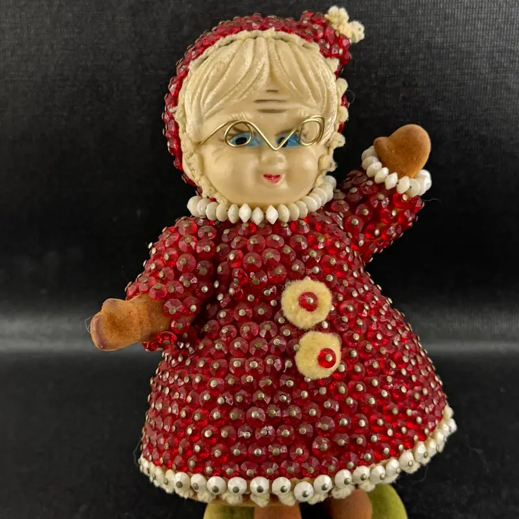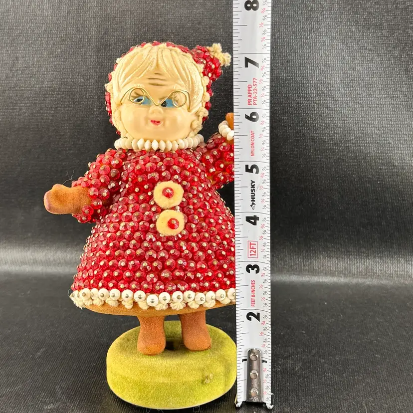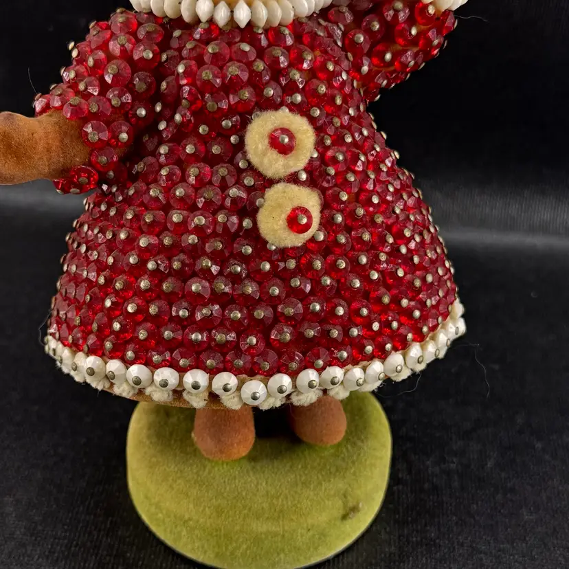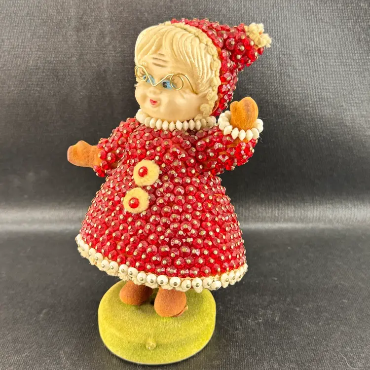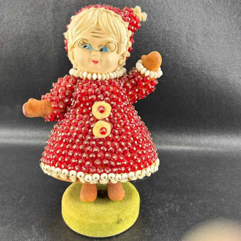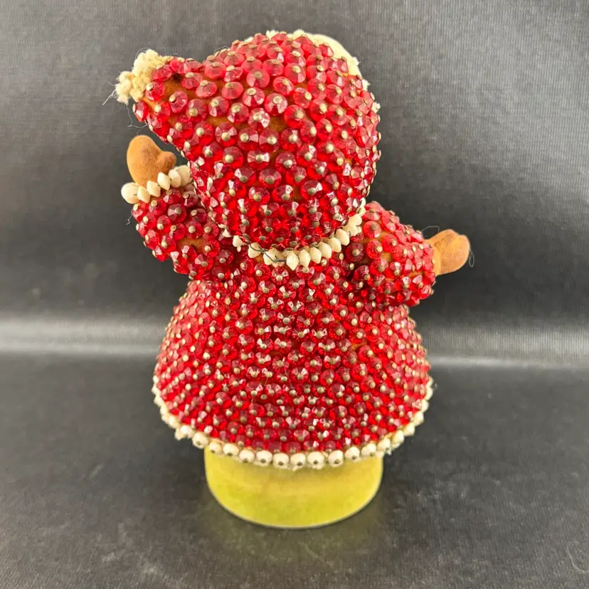 Good condition, but is leaning slighting on its base. Beads are all in good shape. Stands approximately 7” tall.