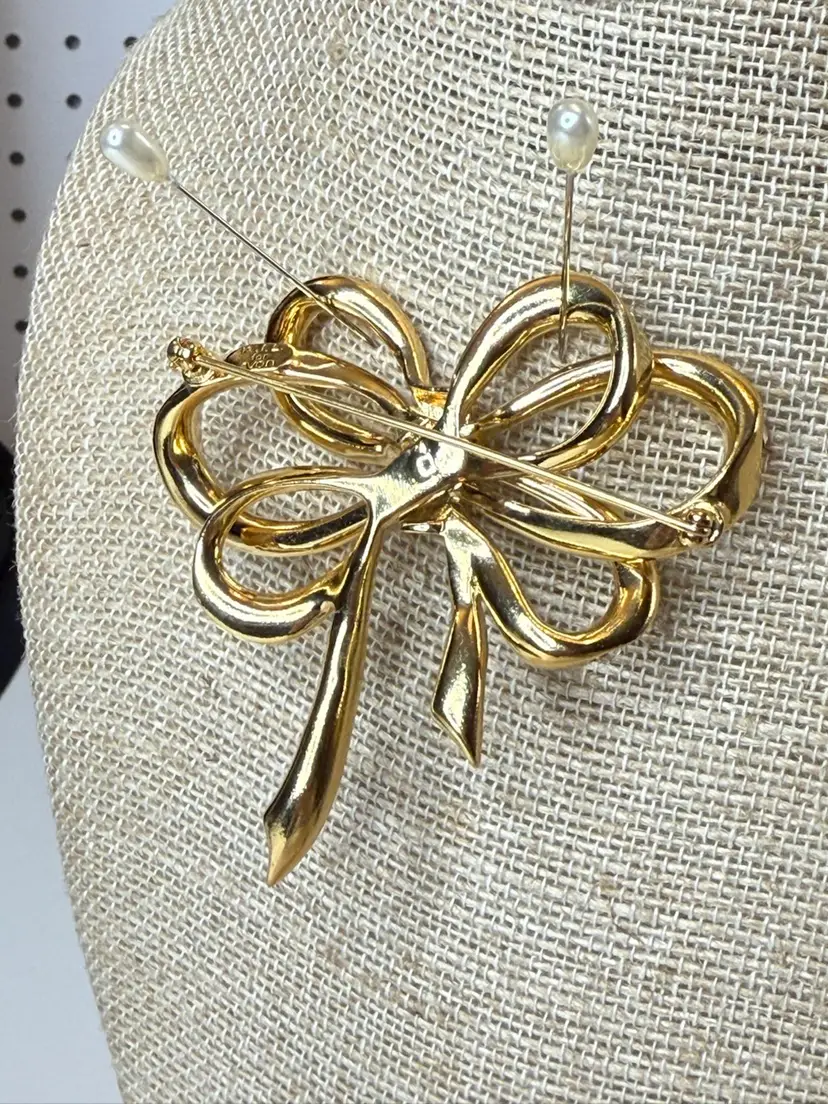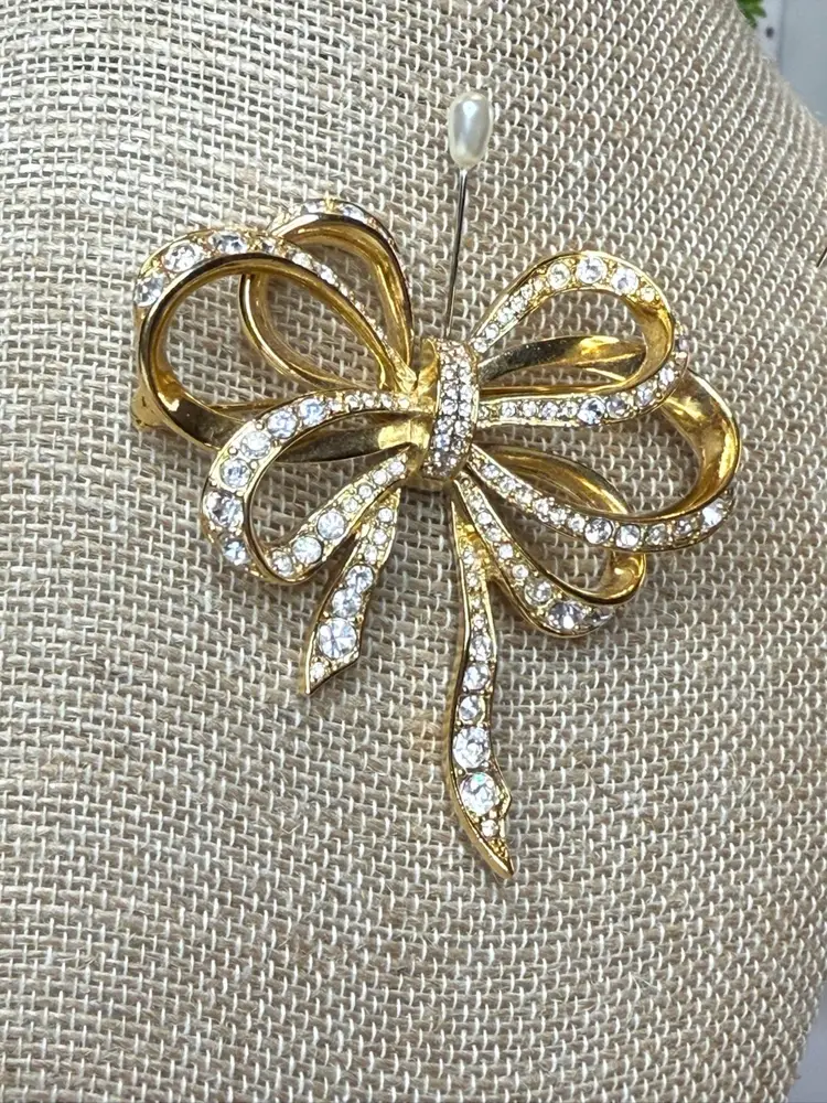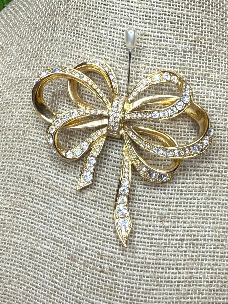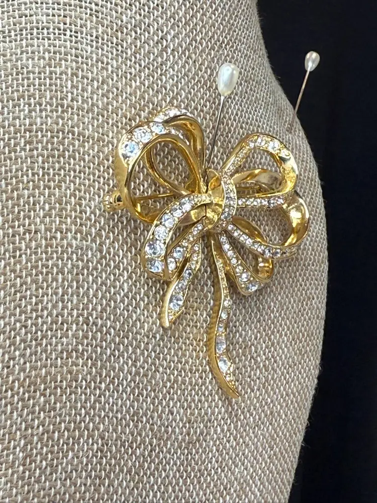 Elevate your accessory collection with the vintage KJL for Avon Gold Tone Rhinestone Bow Brooch, a classic piece by renowned designer Kenneth Jay Lane. This elegant brooch showcases a timeless bow shape, meticulously crafted with shimmering rhinestones and accentuated with a crystal main stone that provides a touch of sparkle. Its gold color offers a warm and versatile hue that complements any outfit, making it an ideal choice for a range of occasions from weddings to birthdays.