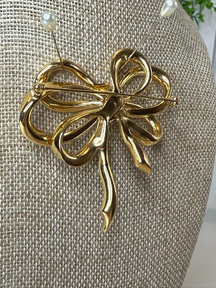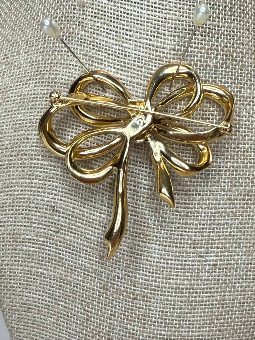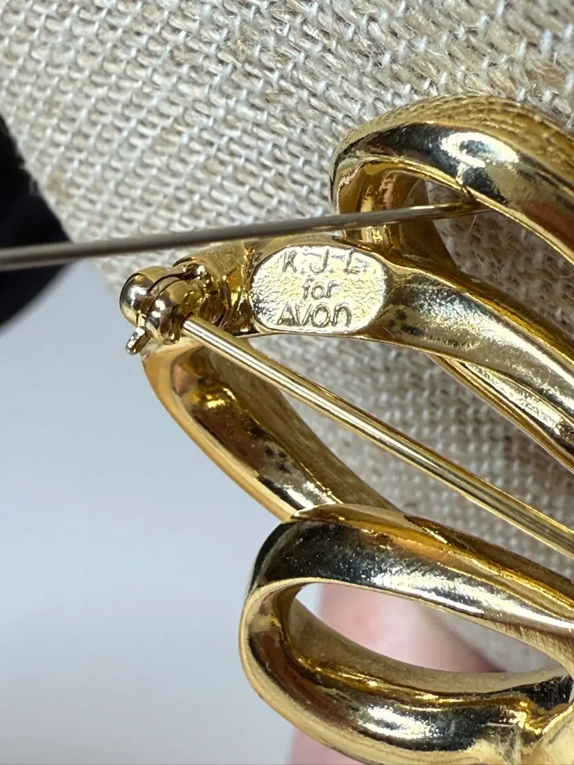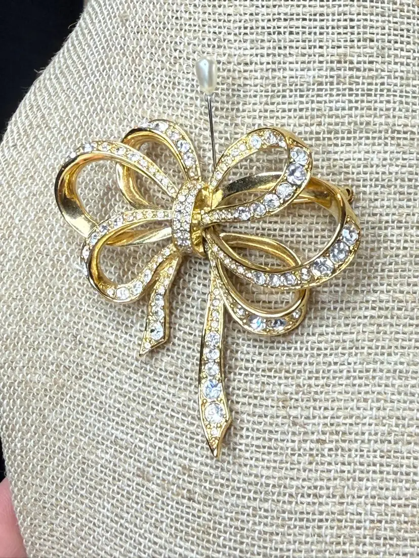 Elevate your accessory collection with the vintage KJL for Avon Gold Tone Rhinestone Bow Brooch, a classic piece by renowned designer Kenneth Jay Lane. This elegant brooch showcases a timeless bow shape, meticulously crafted with shimmering rhinestones and accentuated with a crystal main stone that provides a touch of sparkle. Its gold color offers a warm and versatile hue that complements any outfit, making it an ideal choice for a range of occasions from weddings to birthdays.
