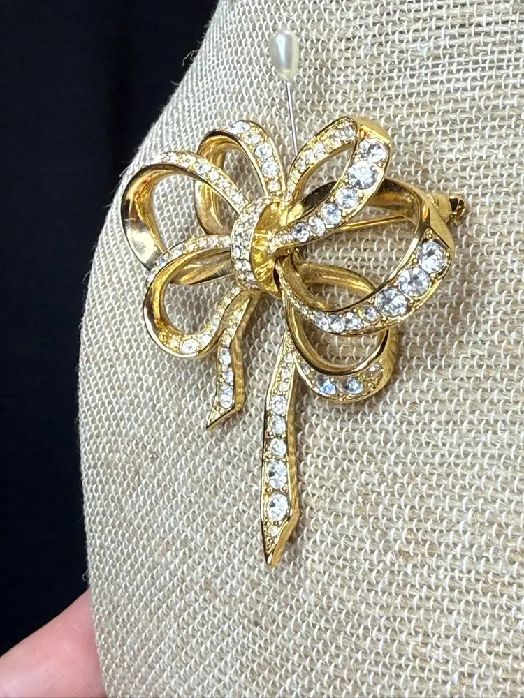 Signed by the prestigious brand, this brooch is a testament to exquisite design and craftsmanship. Whether it's a treat for Mother's Day or a special anniversary gift, this piece is sure to be cherished for its timeless style and sophisticated allure. The blend of metal, crystal, and rhinestone materials ensures durability, allowing this vintage treasure to be passed down through generations.